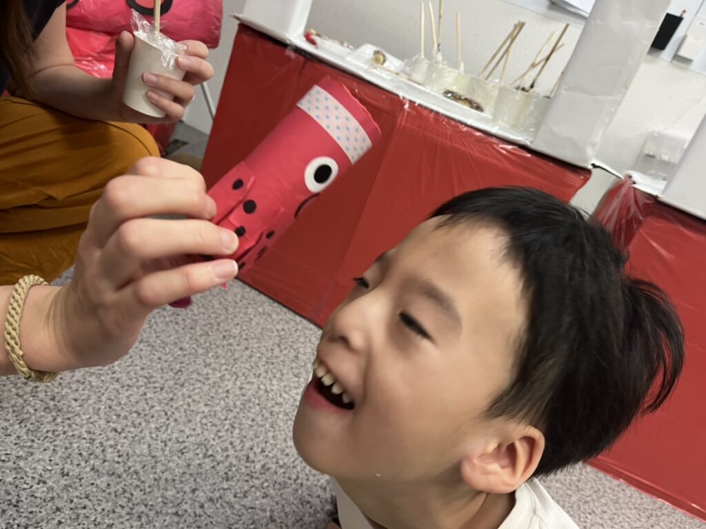 チョコバナナややきとり、おいしそうなにおいが部屋に広がる中、たくさんお代わりしてくれるお友達もいました🌟