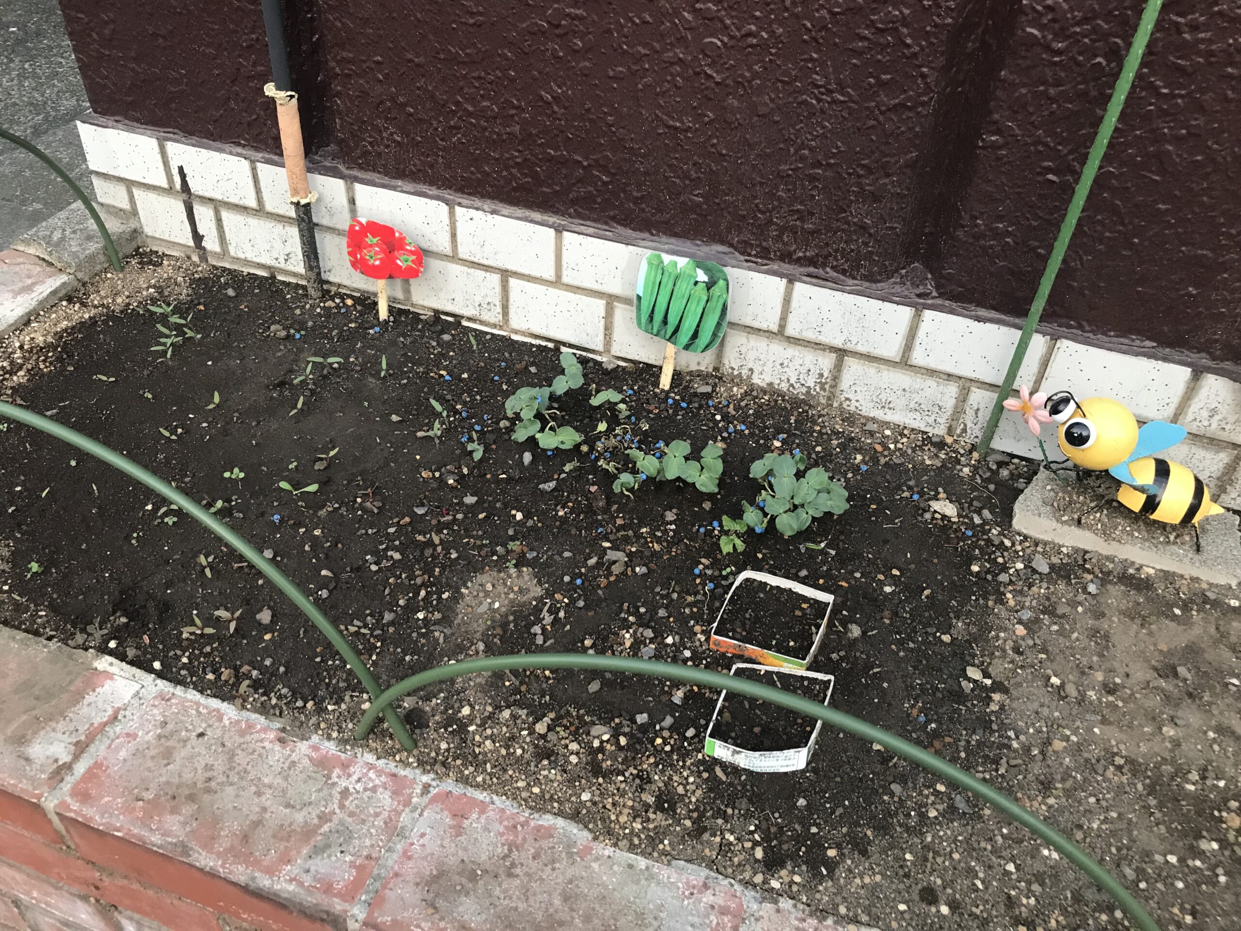 春はチューリップを植えたのですが、夏はオクラ、トマト、そして二十日大根を植えることになりました!