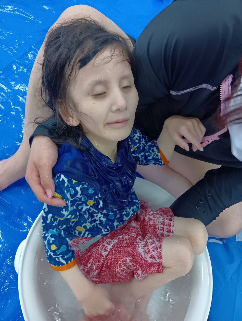 この日の外気温は35度を超す蒸し暑い日だったので、大きな教室内に大きなビニールプールを設置し、3時間あまり水とお湯を入れ続け、継ぎ足し、ようやく完成したプールがこちら😅💦