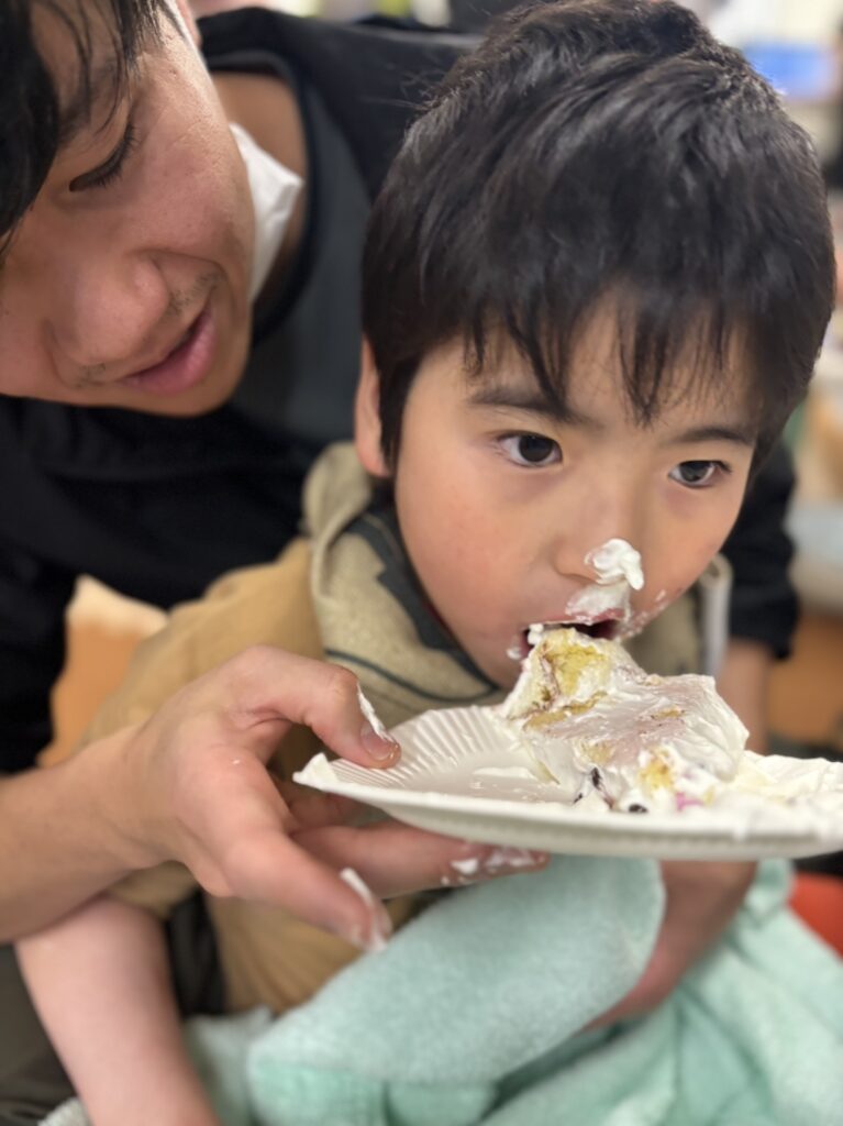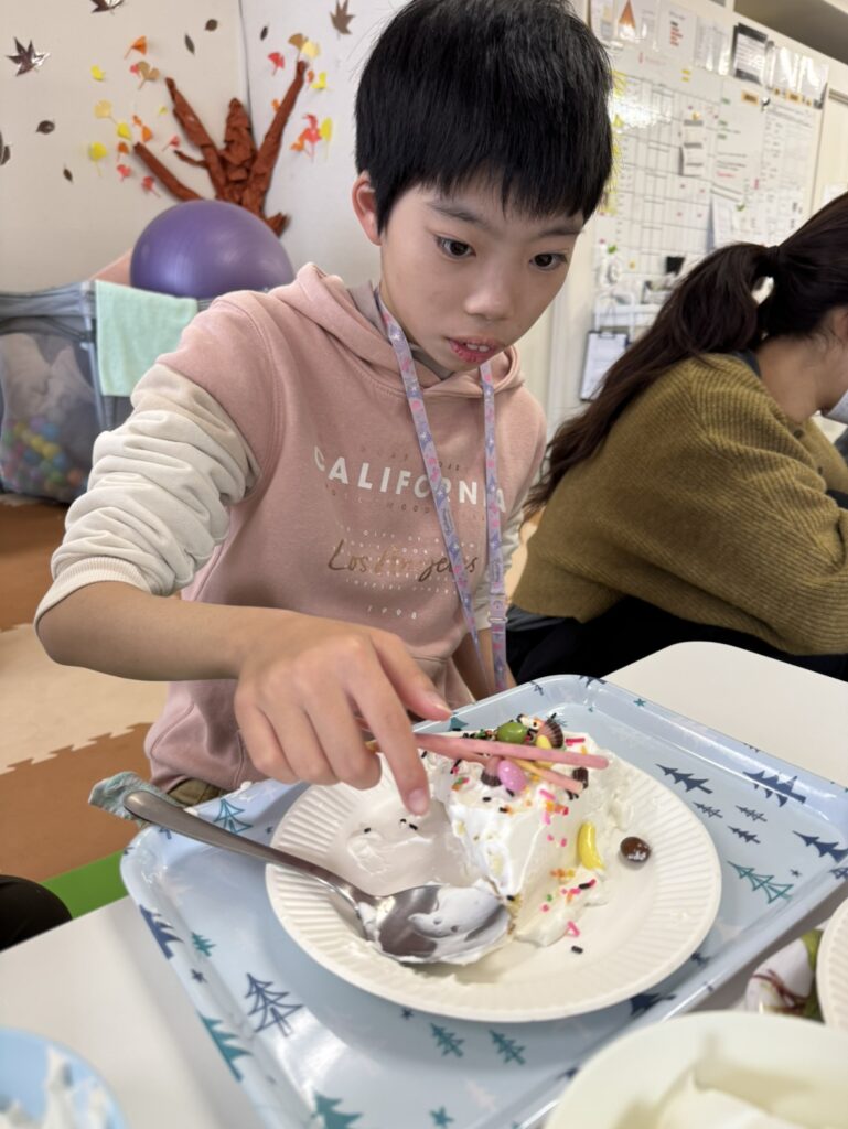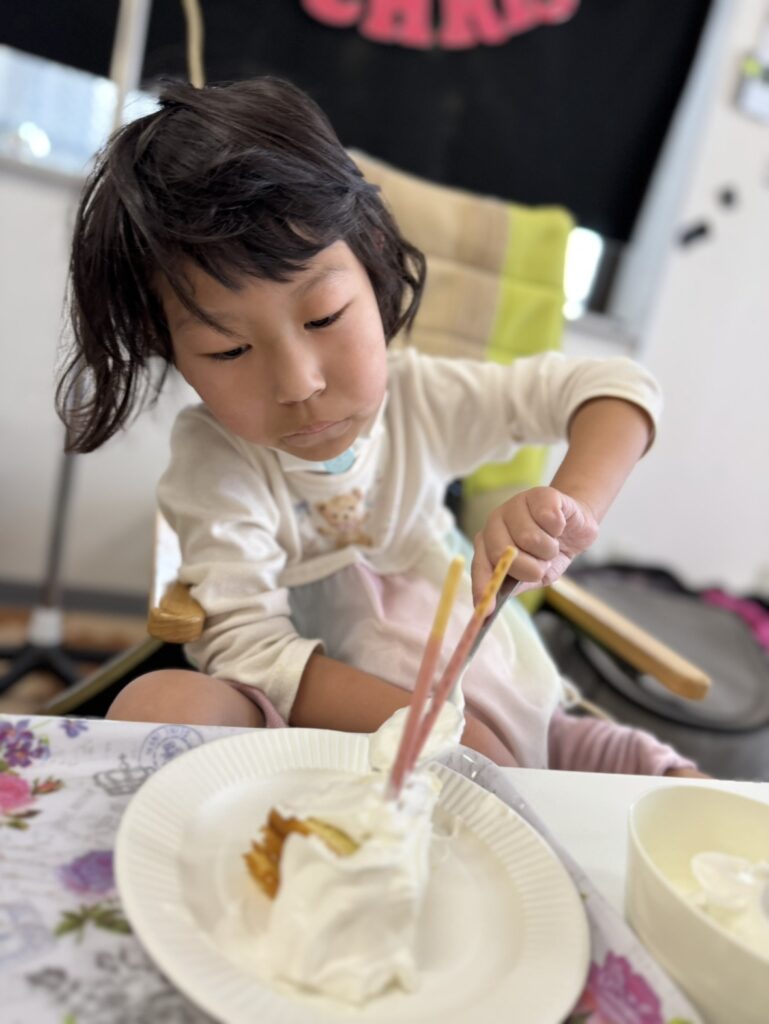 ケーキは自分でクリームぬって、好きなチョコレートやお菓子で飾りつけして完成🍰 一口食べたら手と口がとまらな~い🤣クリームをあちこちにつけて食べていました!