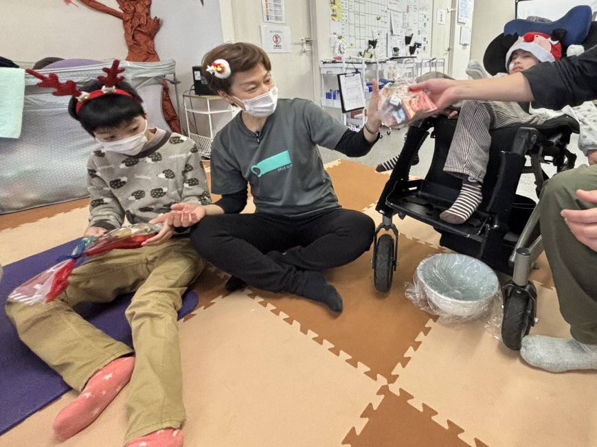 みんなで好きなお菓子を袋に詰め、🔔ジングルベル🔔の曲に合わせてプレゼントを回して楽しく交換をしました!「なんのお菓子入ってるかな~」とニコニコな表情で袋を覗いていましたよ🎁👀