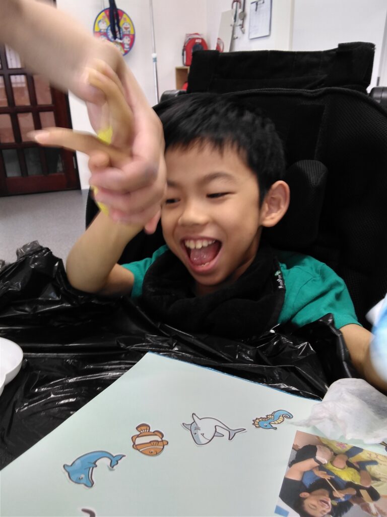 手に絵具が付く感触を笑顔で楽しみながら、しっかりスタンプしてくれました😀