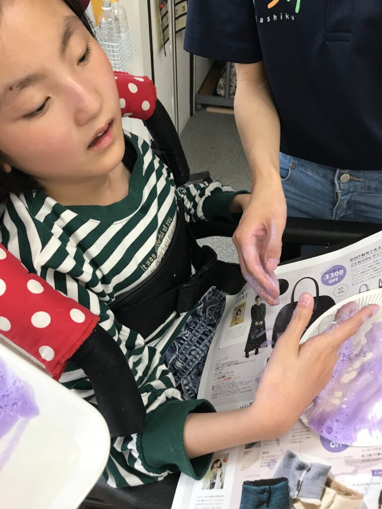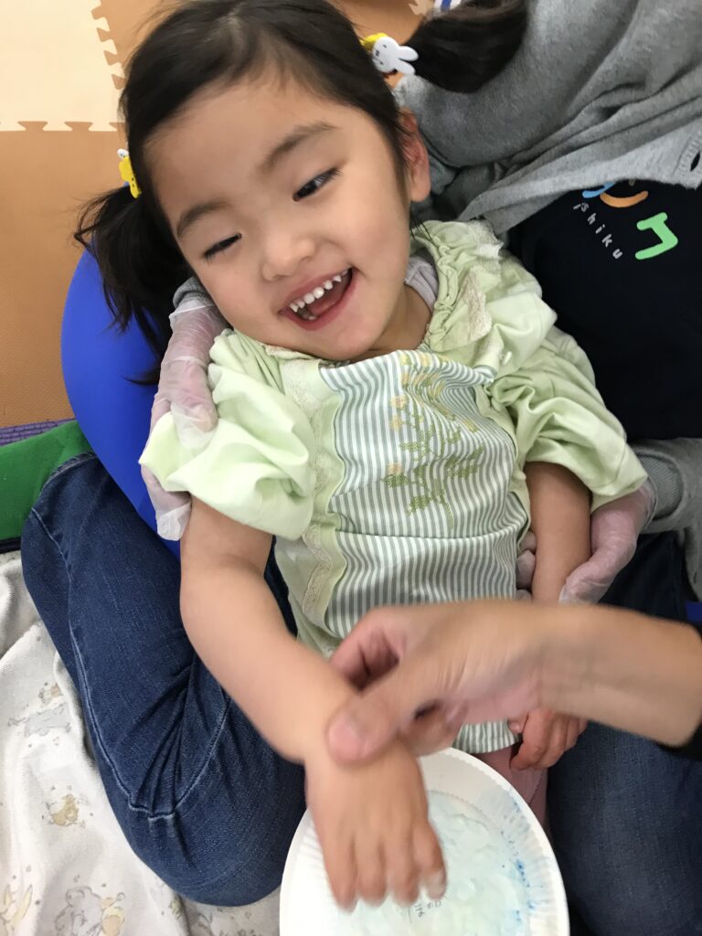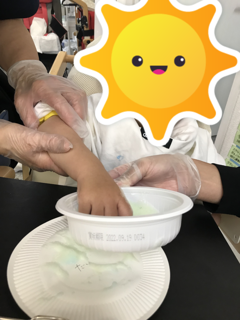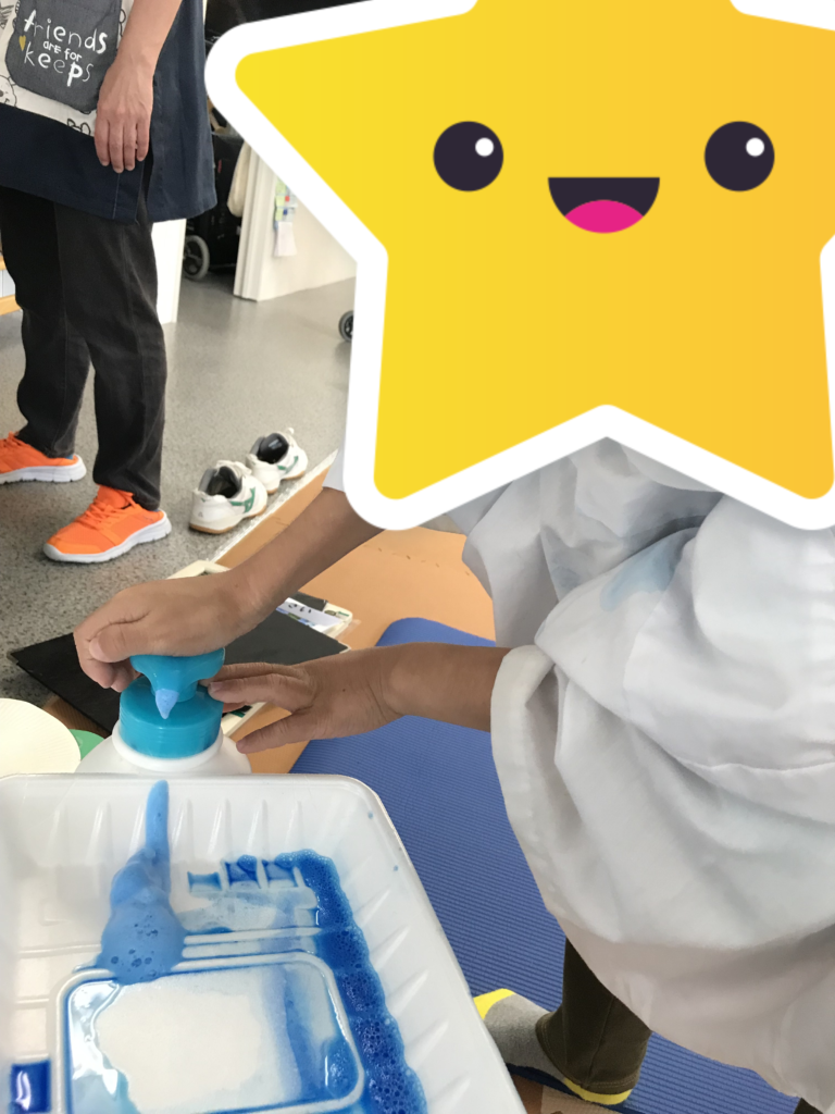 今回は泡を使って手で色付けを行い、感触を確かめたり色の付き方を観察したりしました。