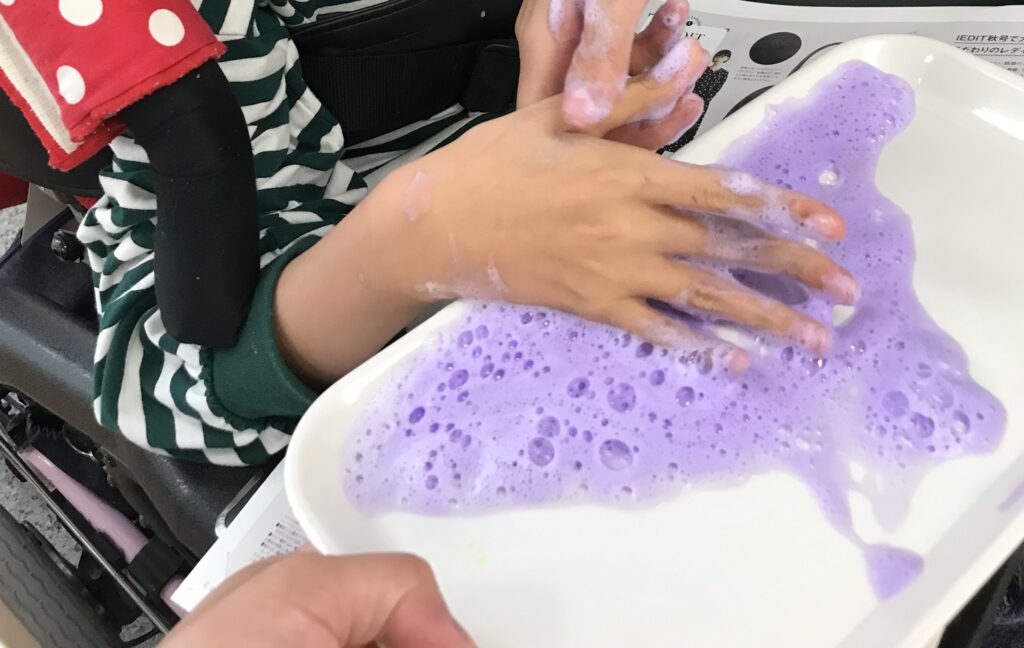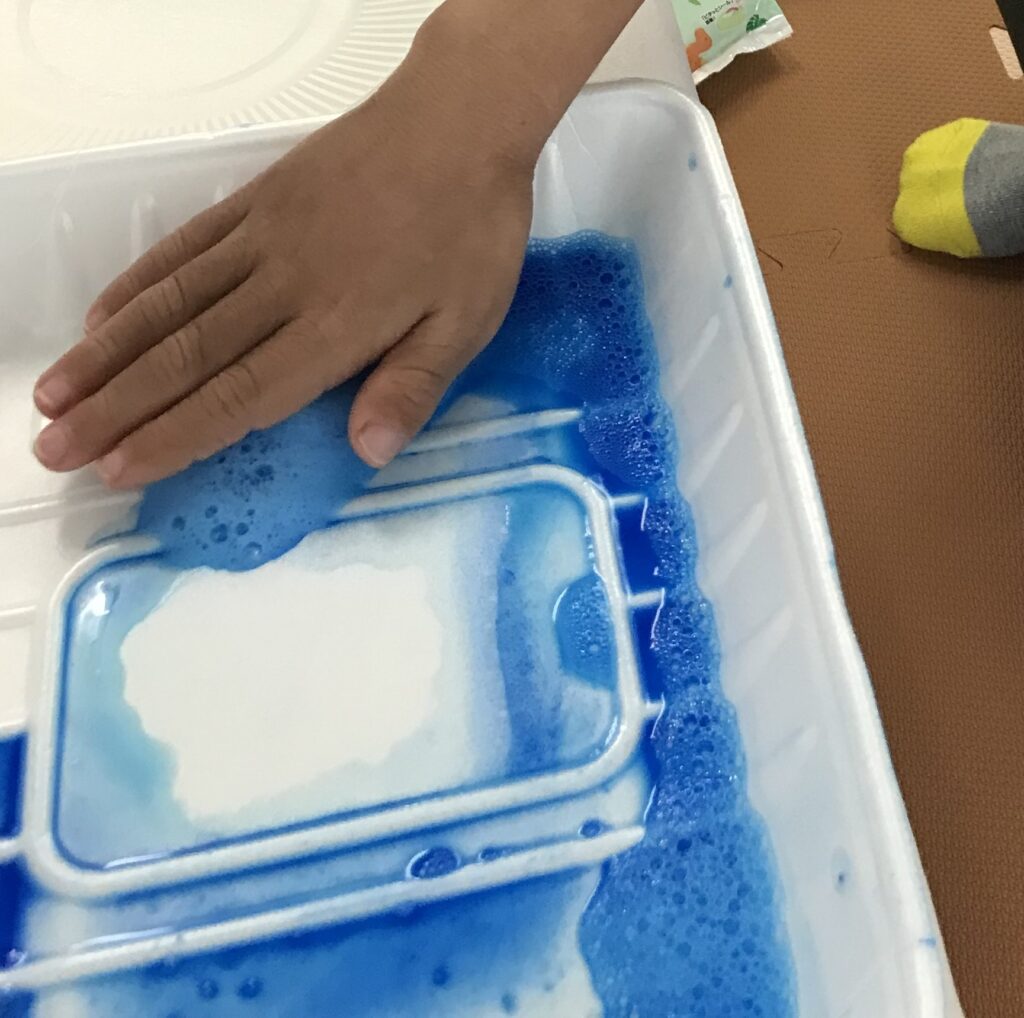 トレーの泡を、見たり触ったりして楽しんでいます😁