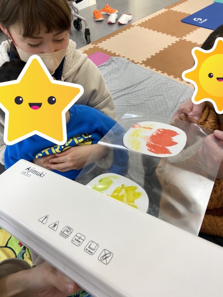 初めてラミネートの機械を見るお子様も!!自分の作品がウイーンと出てくるのをじっーとみていました♪ ラミネートにかけると作品が少し暖かくて気持ちいね♪