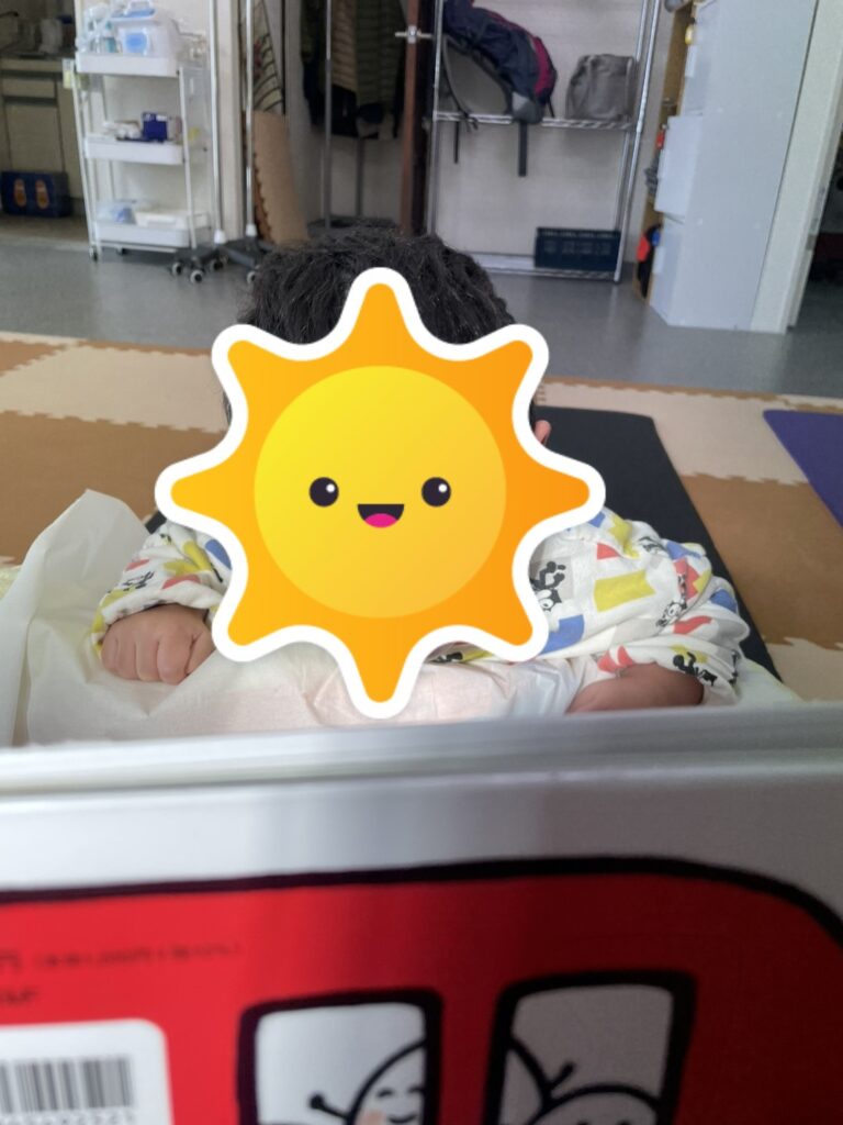 うつ伏せしながら絵本!!よく顔をあげて絵本を楽しんでいました♪