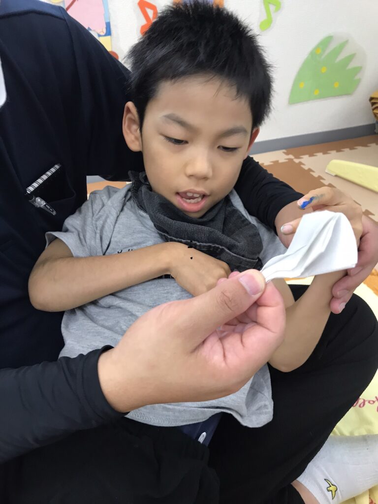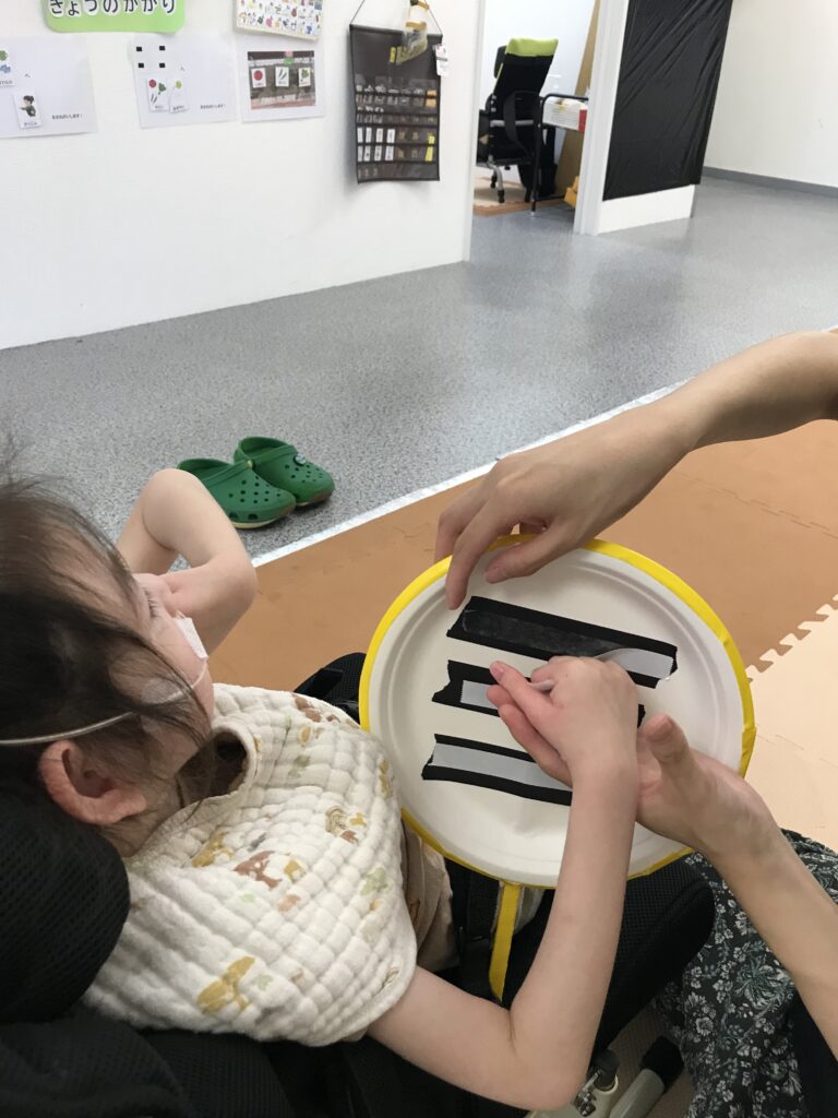 テープを剥がして、貼り付ければ完成✨スタッフがお手本を見せるとしっかりと手でテープを握り剥がすことができました✨素晴らしい😊