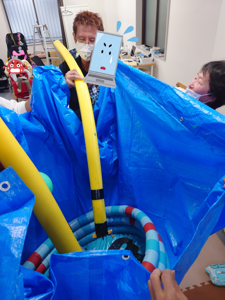 みんなで音にビックリ(;゚Д゚)!! したり絵の具が飛んできたりと、ワーキャー騒ぎながらの作業になりましたが、マーブリングとスパッタリングが混ざったような色の付き方で、かっこよく塗れました(´艸`*)