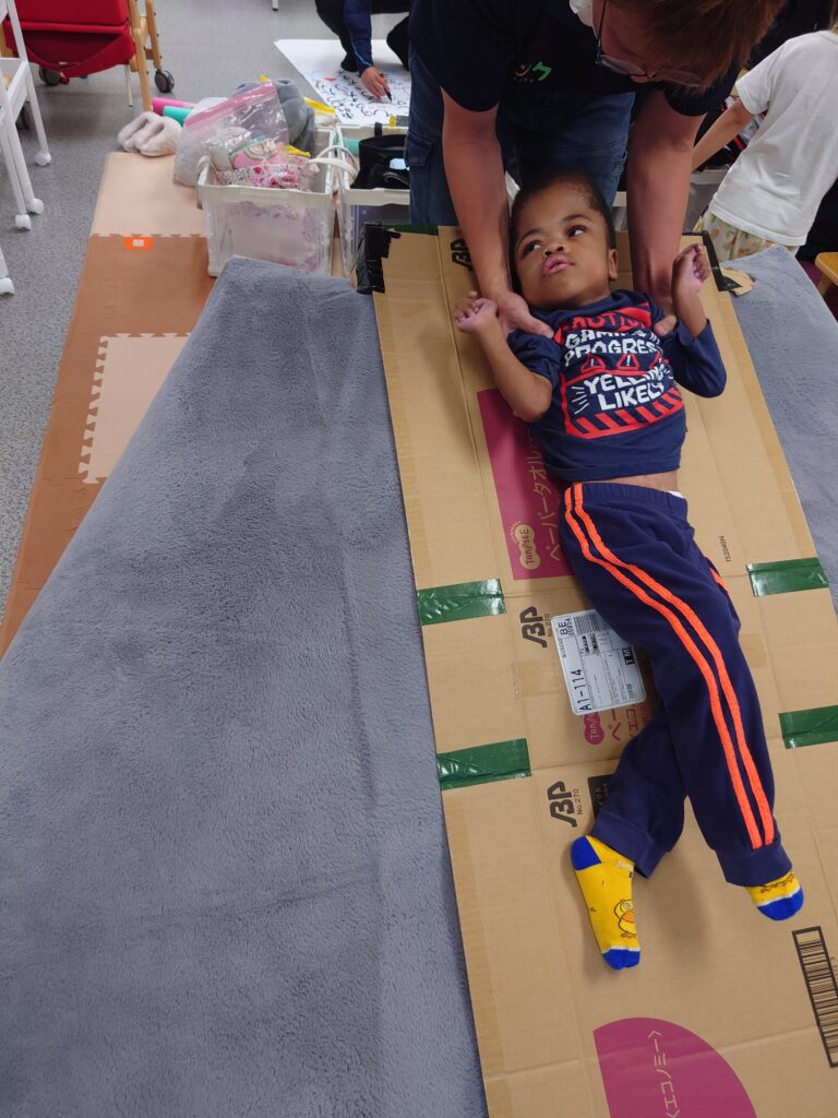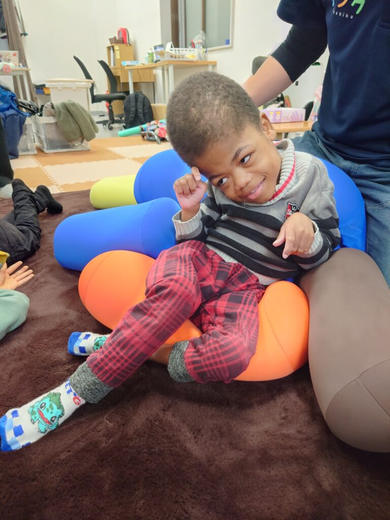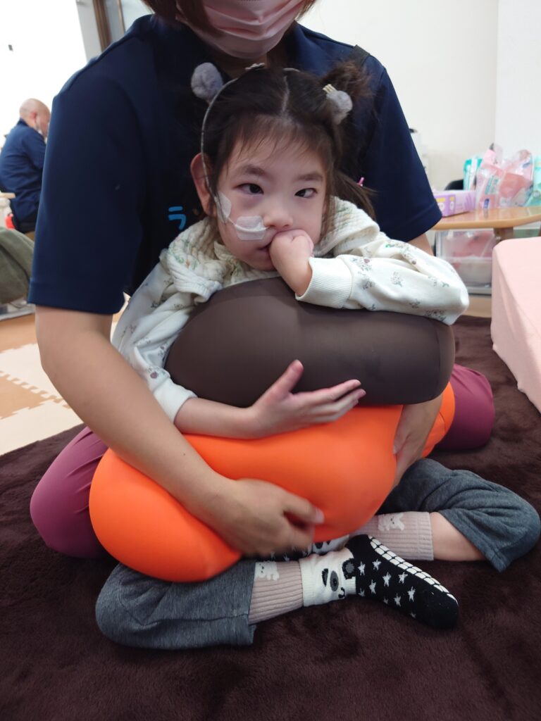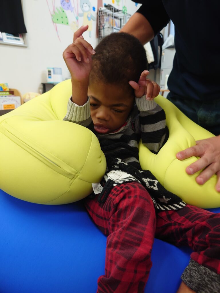 クッションを使ったり、座り方を整えたり…子供たちとスタッフが協力して、バランスよく座れる姿勢を考えて実践!一緒に技術を磨いて競います٩( ”ω” )و