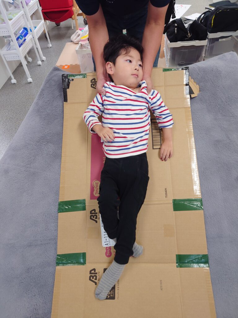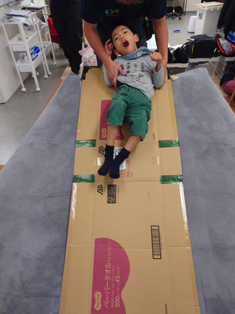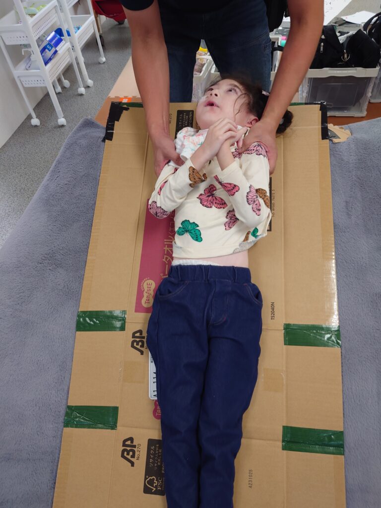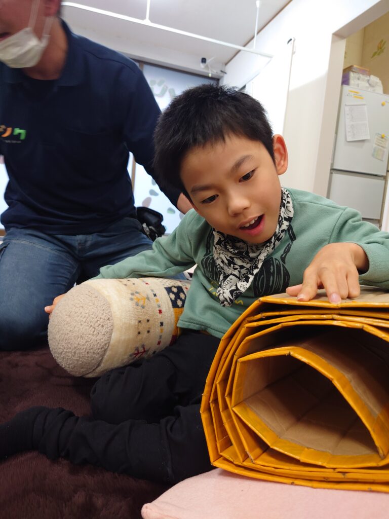 クッションを使ったり、座り方を整えたり…子供たちとスタッフが協力して、バランスよく座れる姿勢を考えて実践!一緒に技術を磨いて競います٩( ”ω” )و