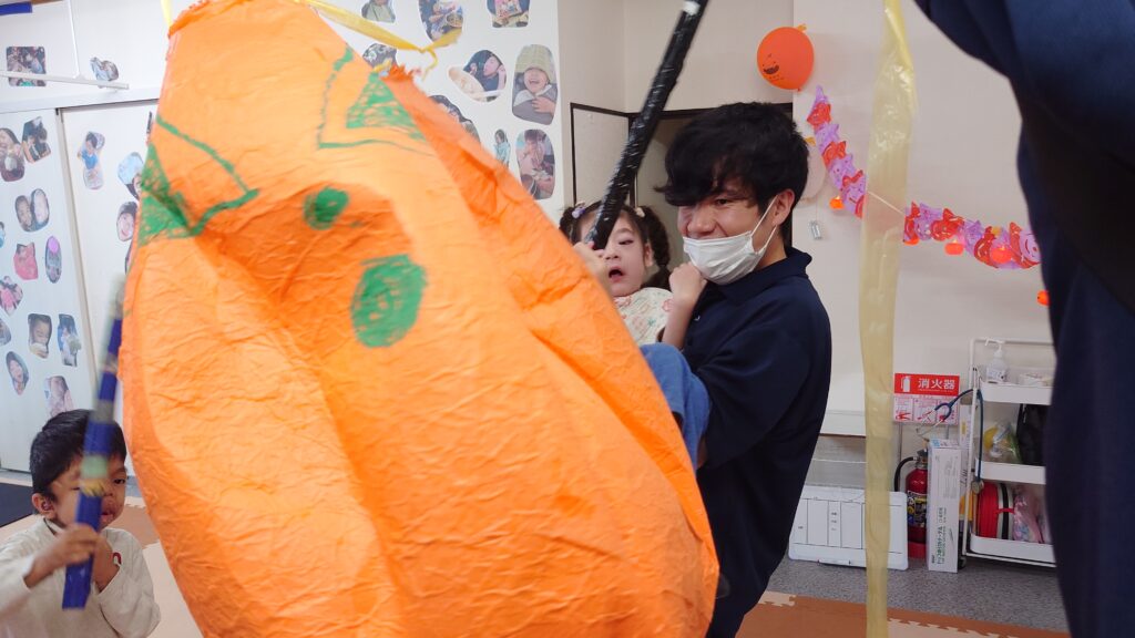 お菓子を取り出すため、棒を作ってみんなでスマッシュ!!