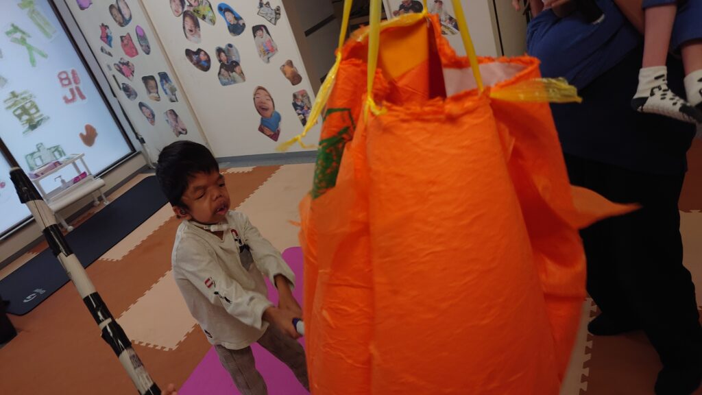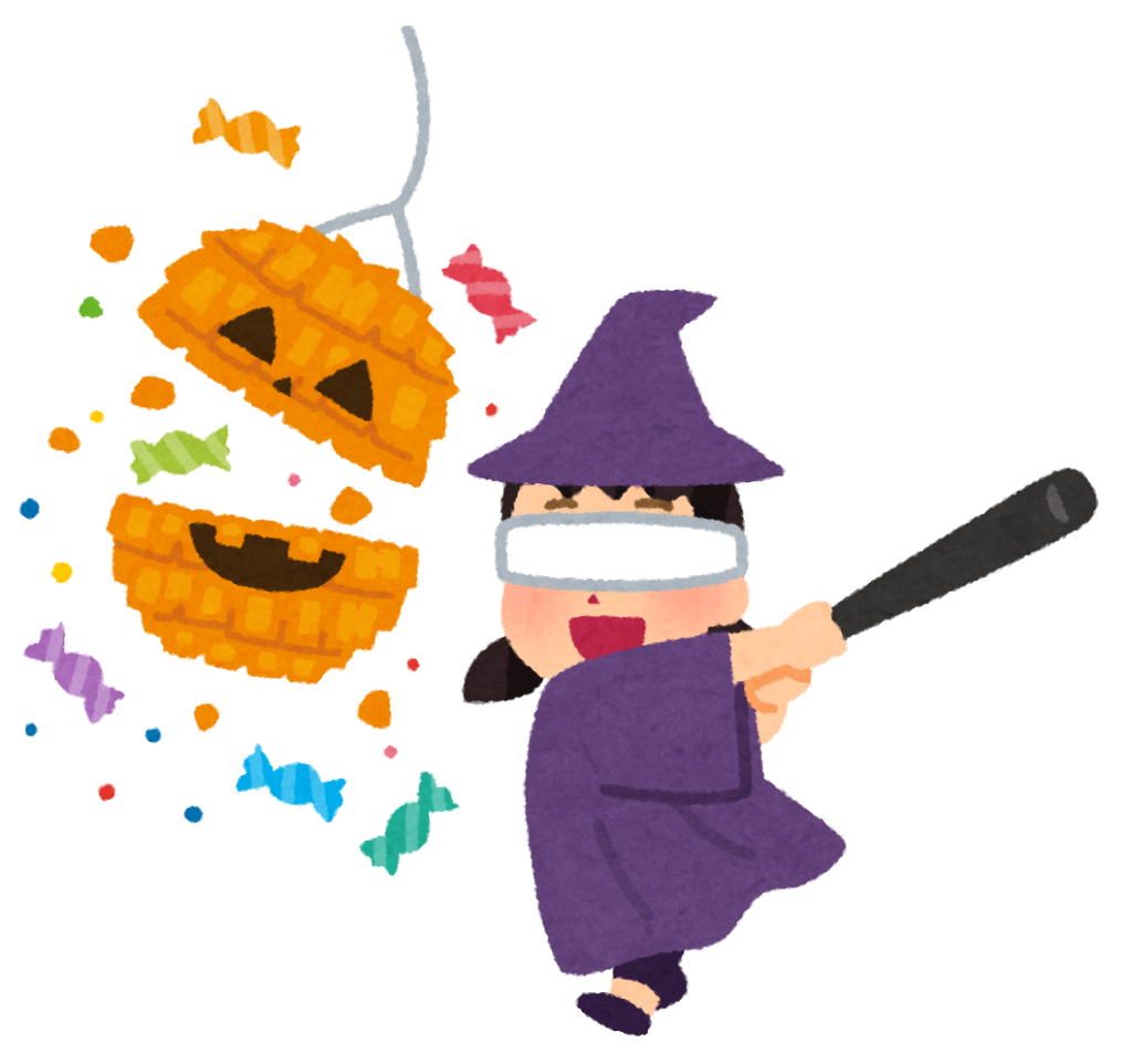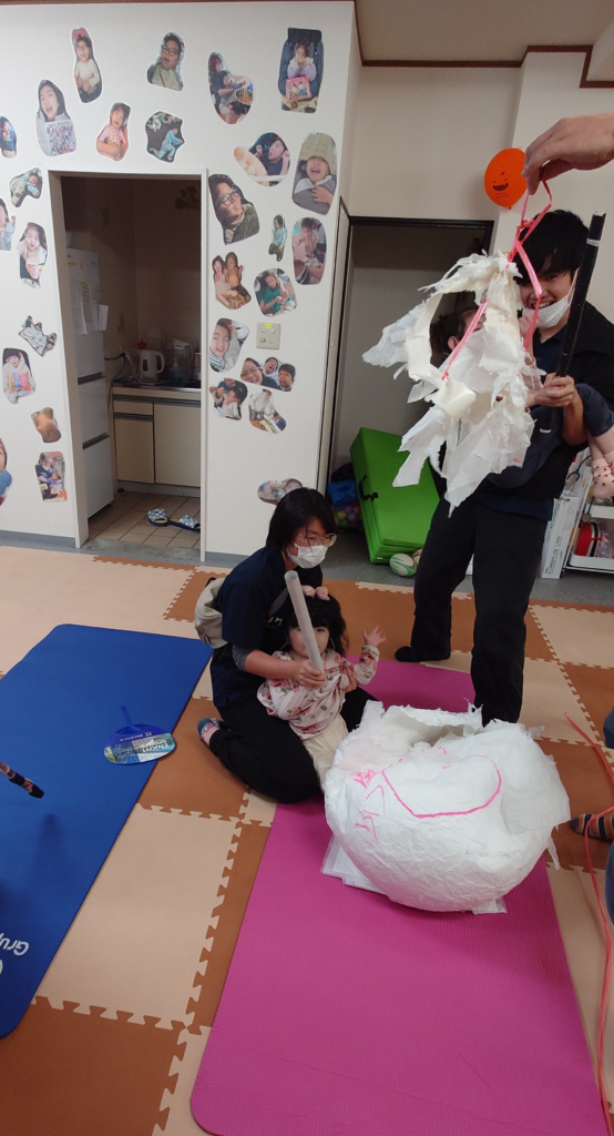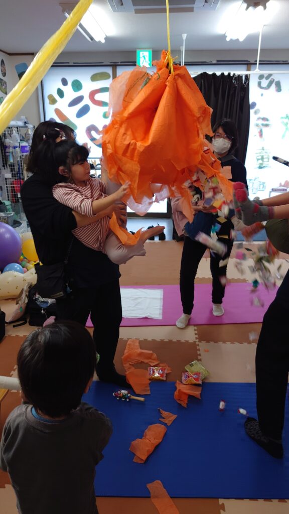 “ピニャータ”はメキシコのお祝い事によく使われる日本のくす玉のようなもので、紙で作られた型枠の中にキャンディなどのお菓子を入れ、それを上から吊して棒で叩いて割るゲームです。