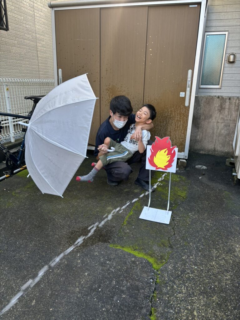相模原消防署淵野辺分署から、水消火器と炎の的をお借りして、実際の消火器を使って放水訓練!