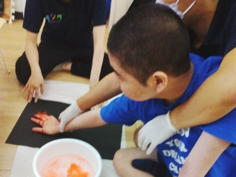 手に絵の具を塗って、ちょっとくすぐったい…?