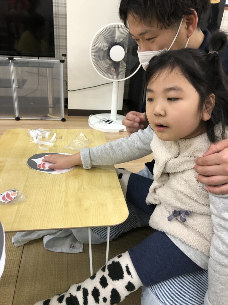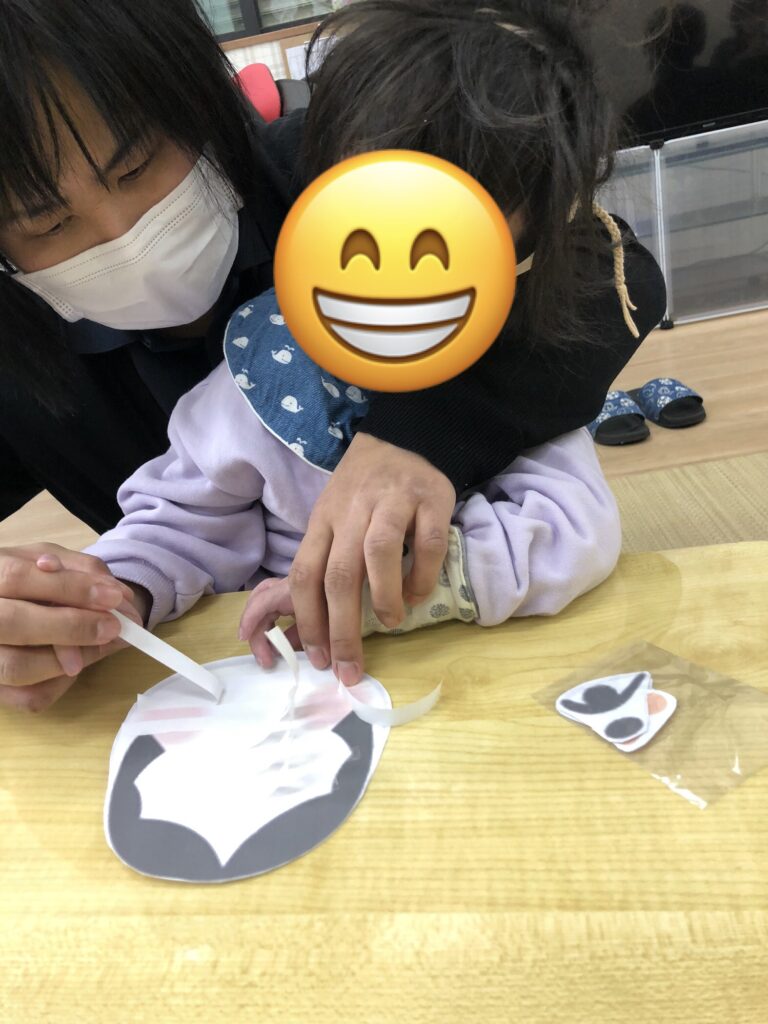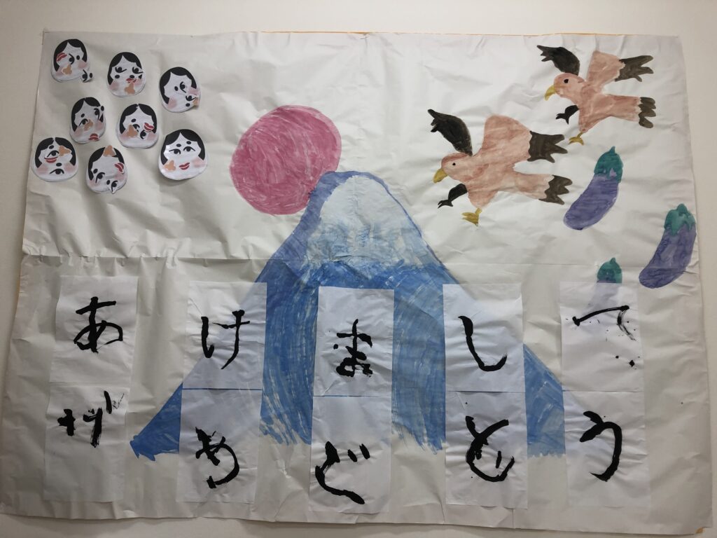 さあ、みんなで書いた文字と福笑いを壁面飾りに合わせて…