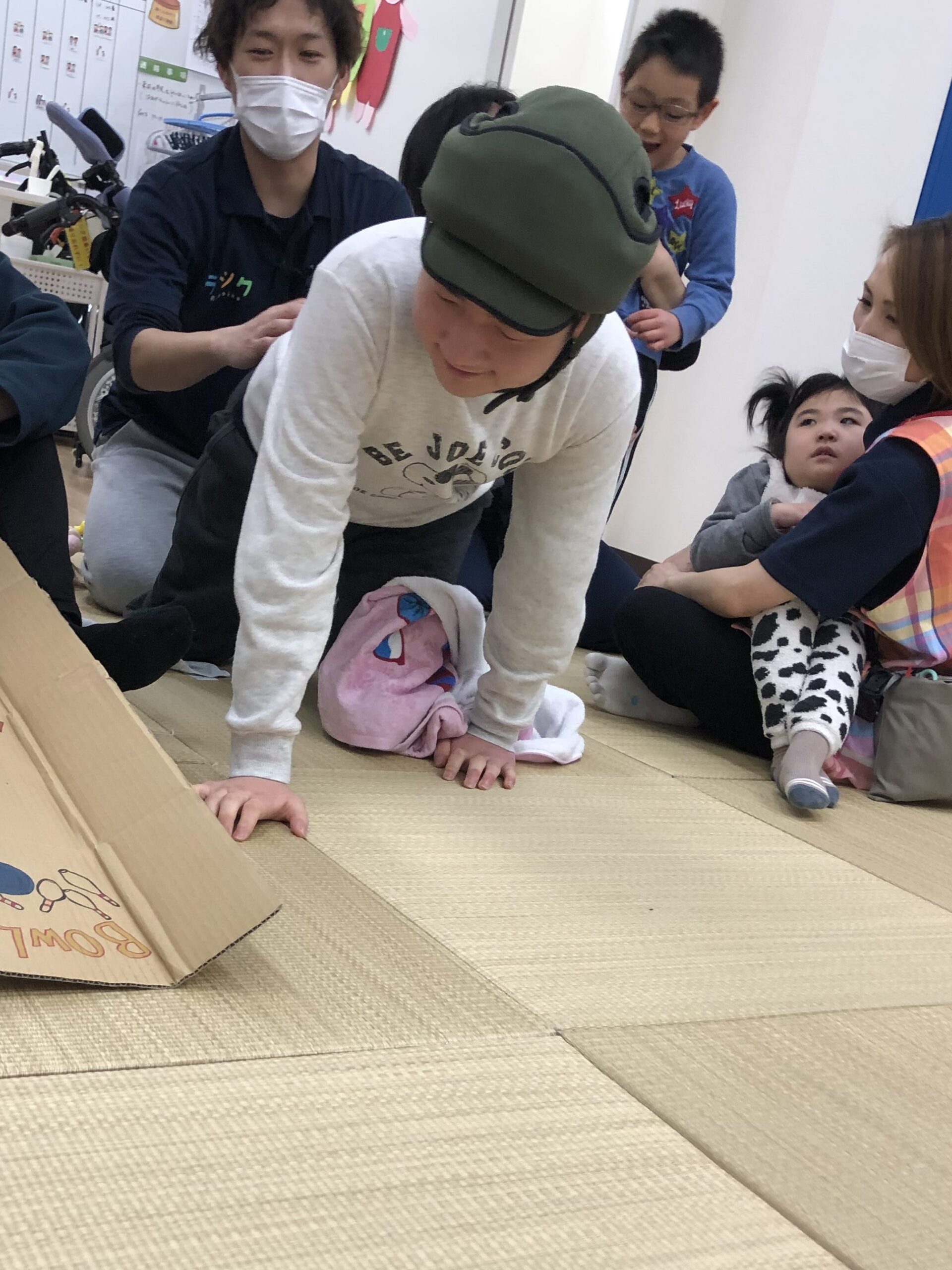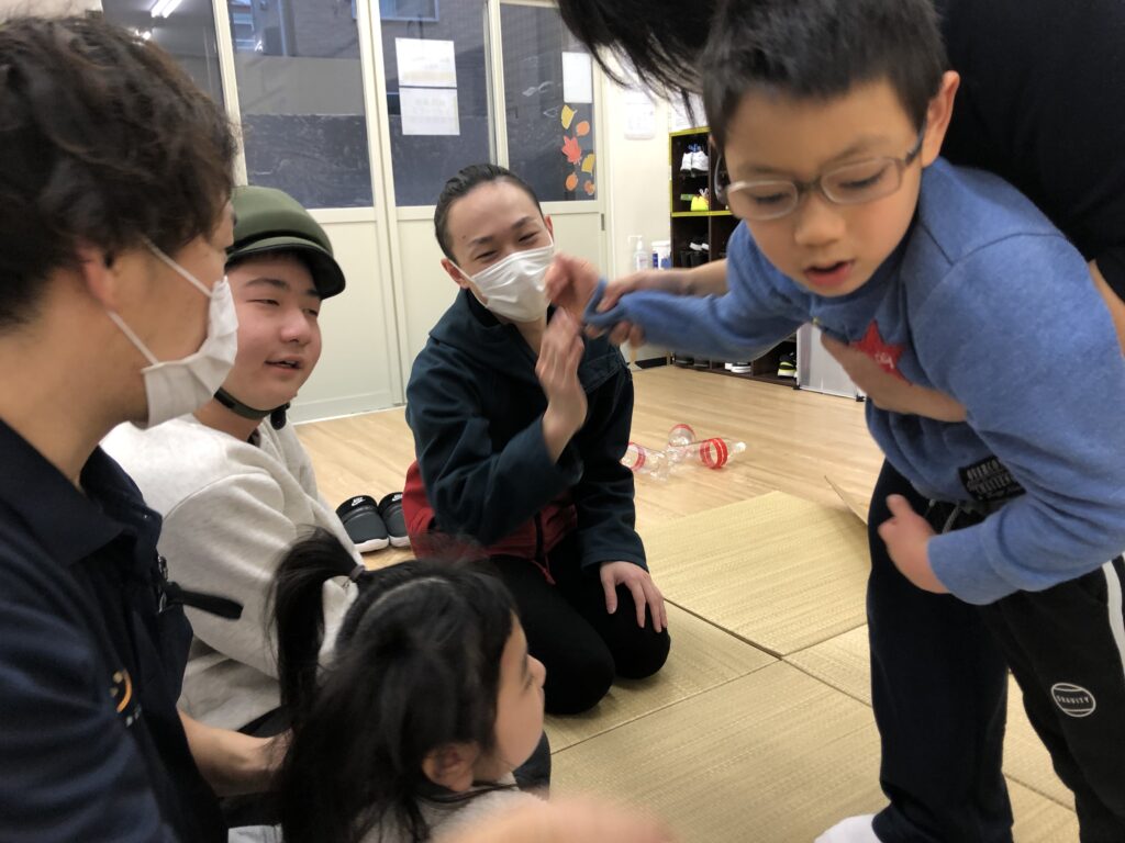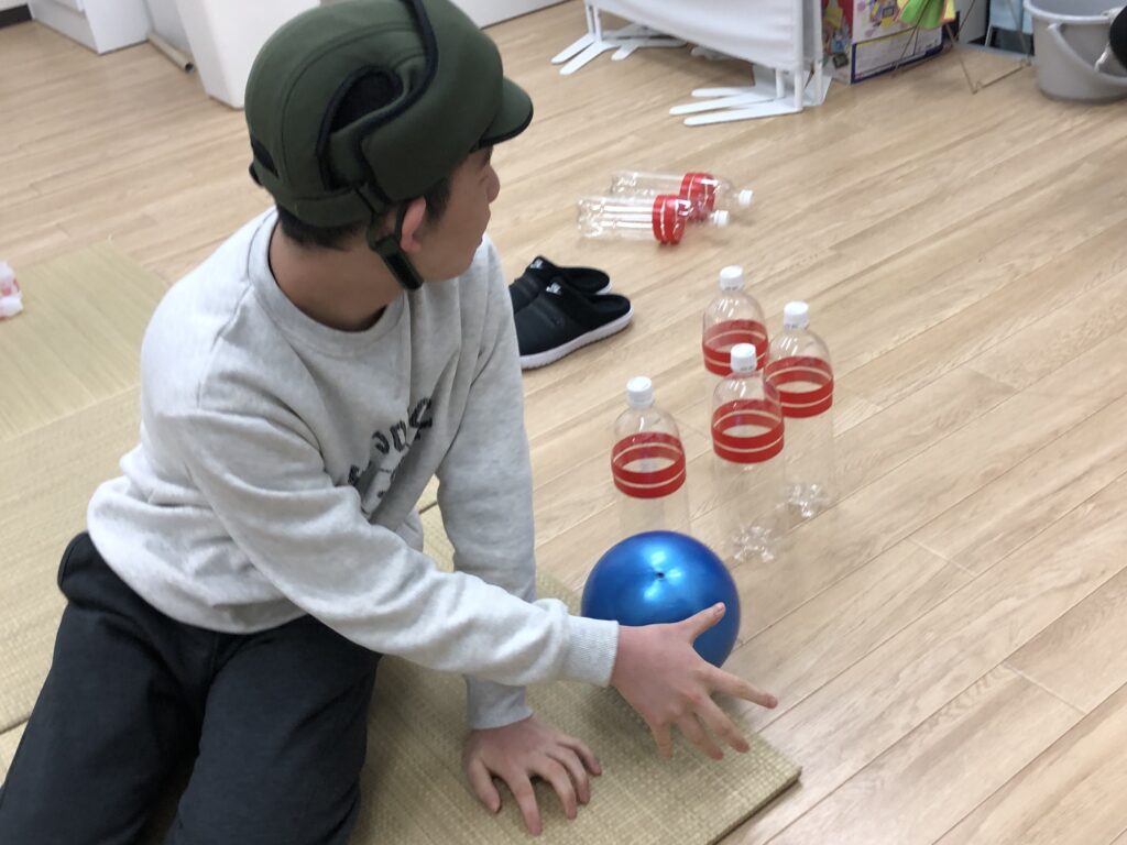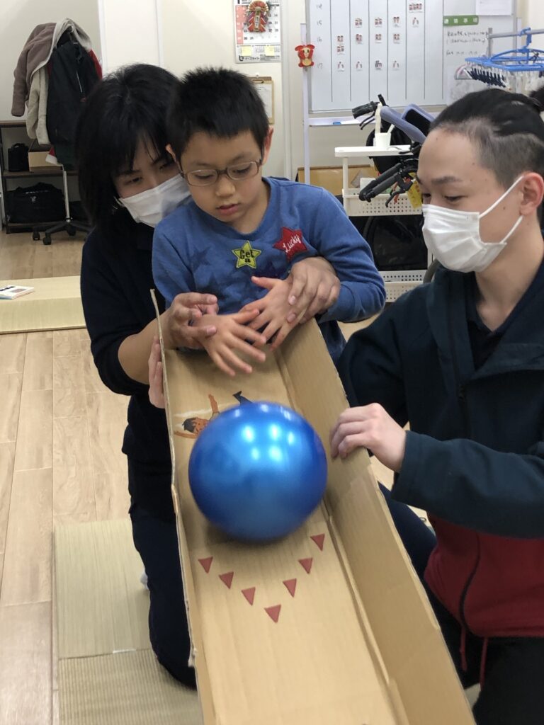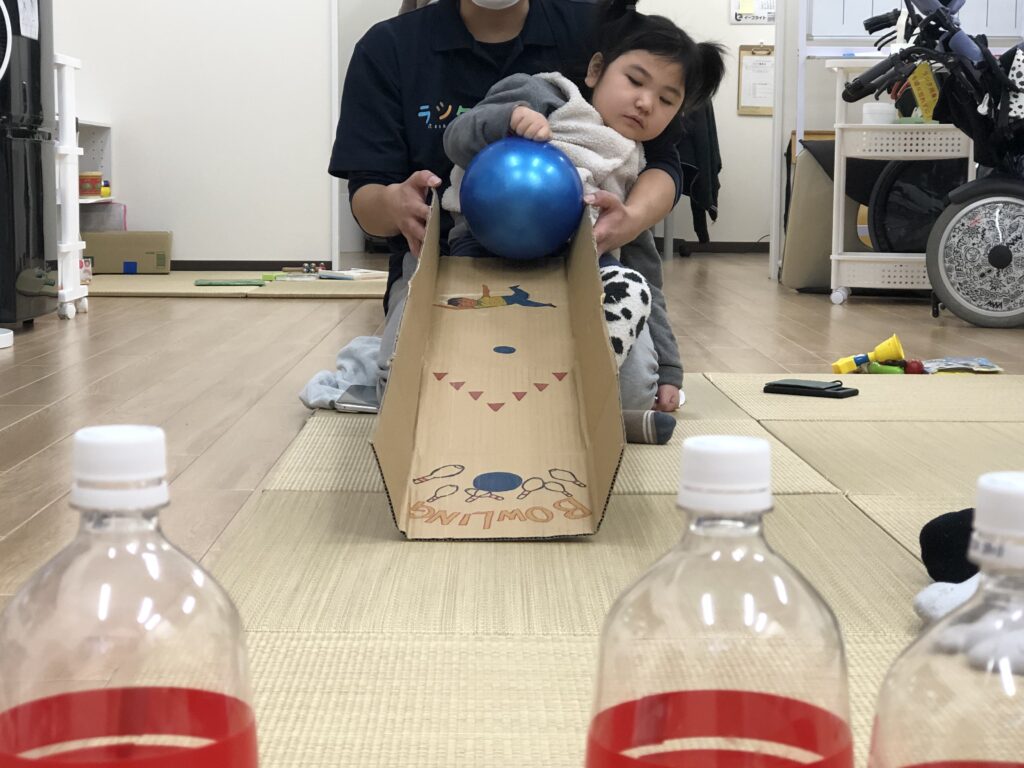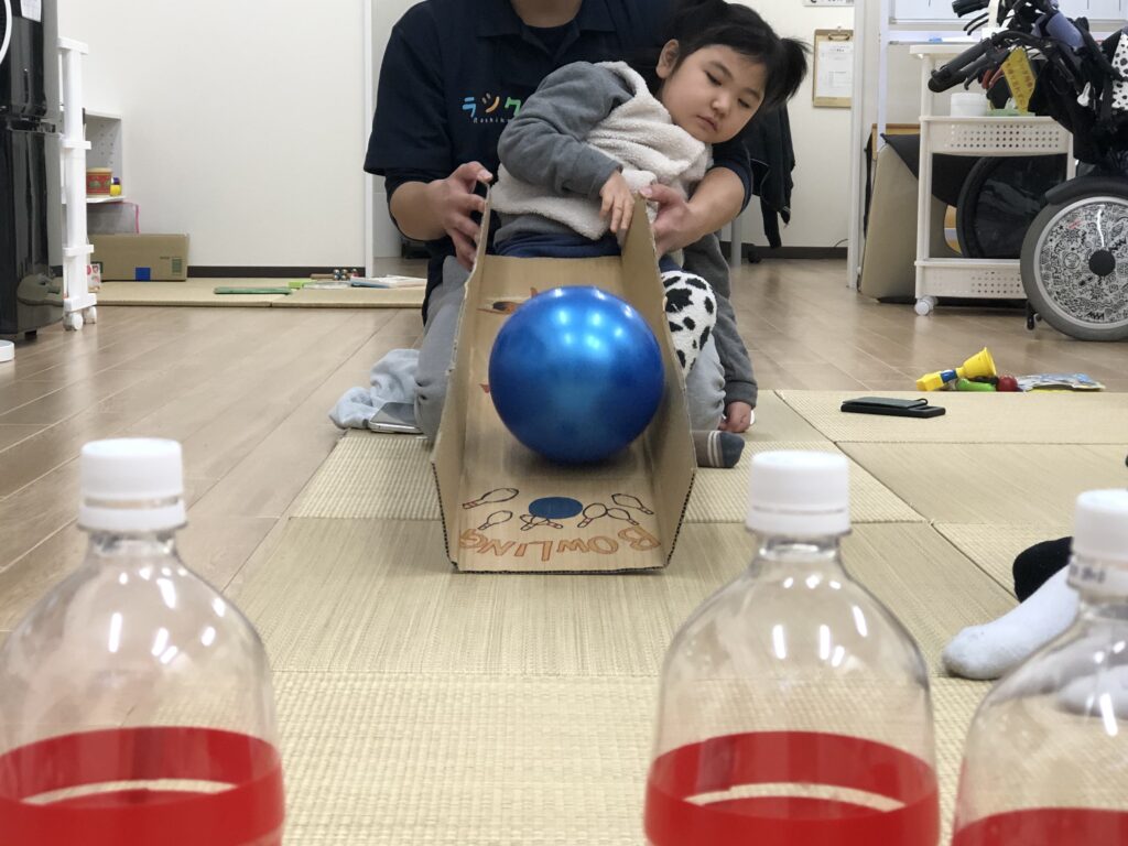 ペットボトルをボーリングのピンに見立てて、ボールは手作りのレーンを使って転がしやすいように児童の前に傾斜をつけてボールを転がします。