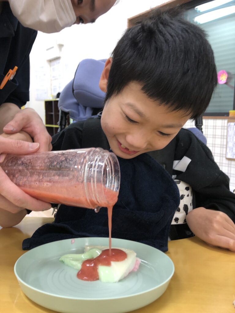 さらに、ひな祭りスペシャルおやつとして「菱餅ゼリーのイチゴソース添え」を作りました( ^^) _U~~