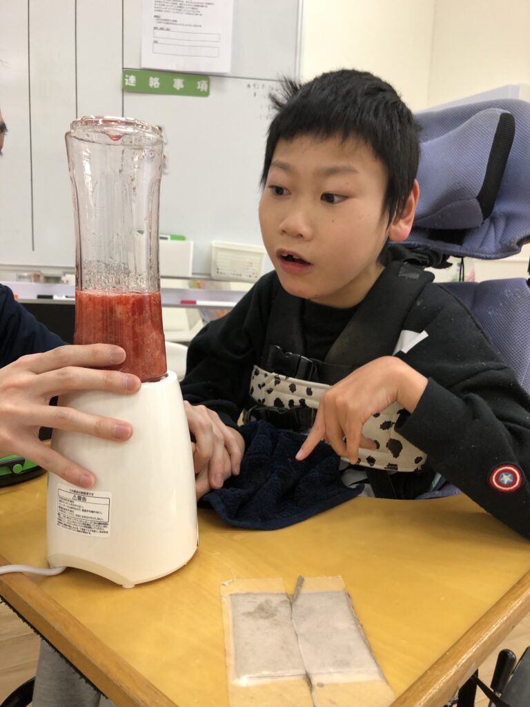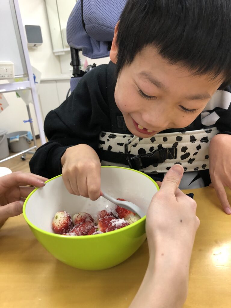 みんなでイチゴソースを作ります。ボールにイチゴと砂糖を入れて混ぜ合わせます。思わず食べたくなってしまう位、甘い匂い。。次はブレンダーにイチゴを投入してミックス!!