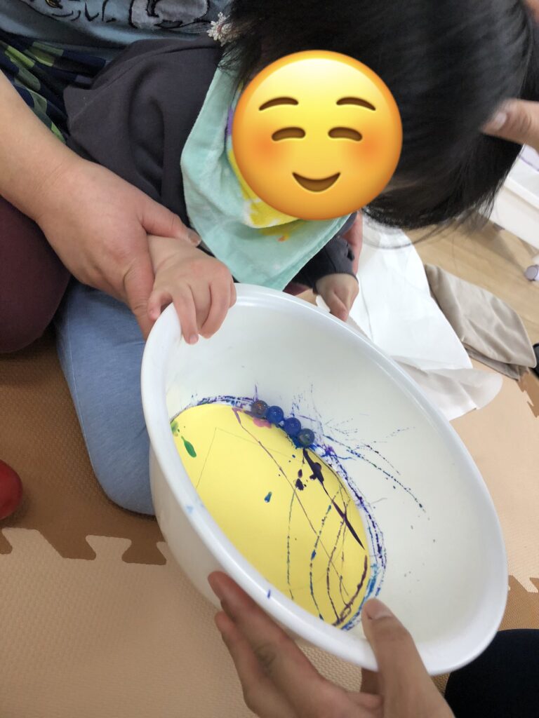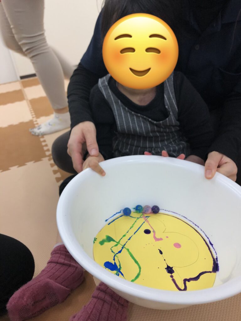 桶の中に冠と扇の型紙を入れて、様々な色の絵具を付けたビー玉を入れてコロコロ~🎵前後左右、上手に傾けながら転がします!!!