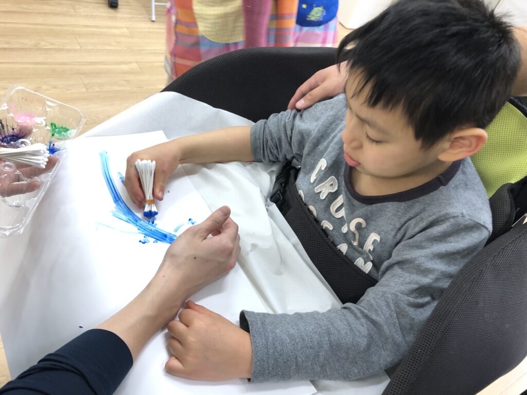 予め用意した「笏」に綿棒を束ねたお手製のスタンプに絵具を付けてトントン♪スタッフがお手本を見せると、その通りにトントン!とっても上手です。画用紙に勢いよくペター!優しくペタ~、それぞれ遊び方が違って面白いですね(‘ω’)ノ