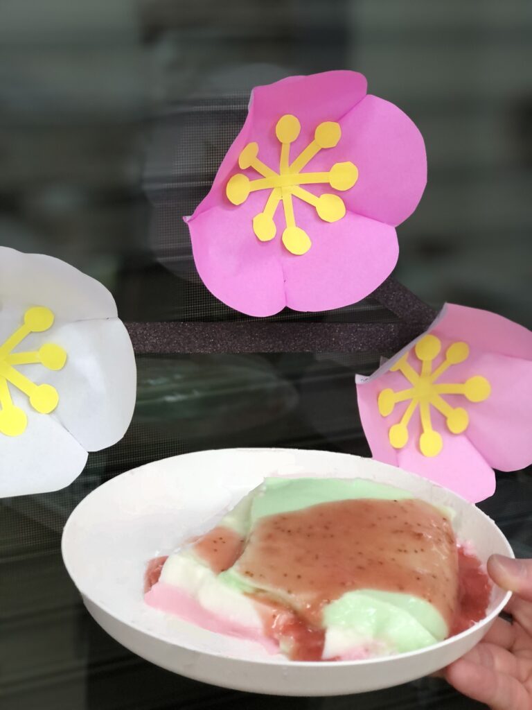 ひな祭りの菱餅をイメージして、3つの味の菱餅ゼリーです。菱餅ゼリーは事前に作りました。