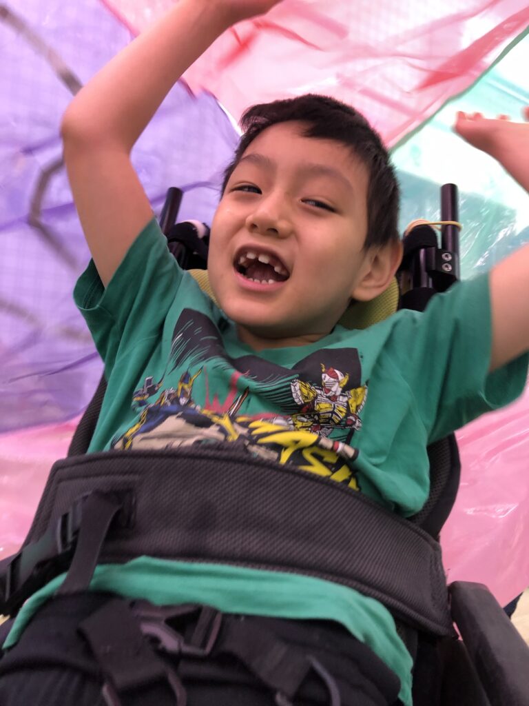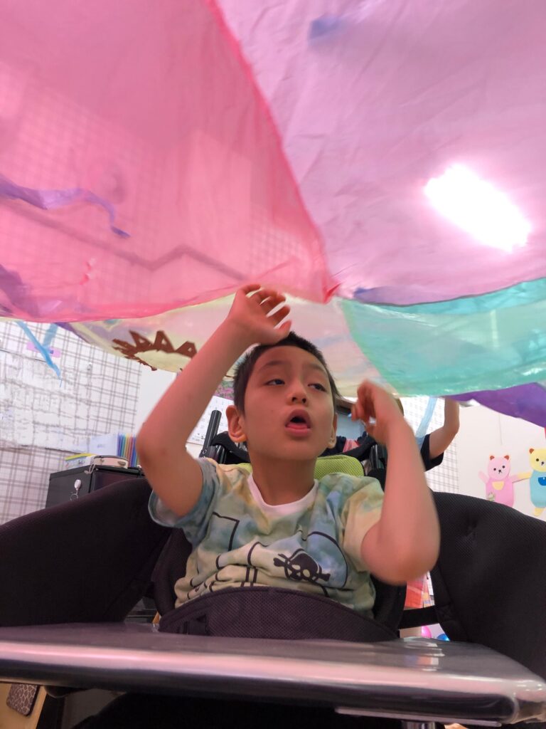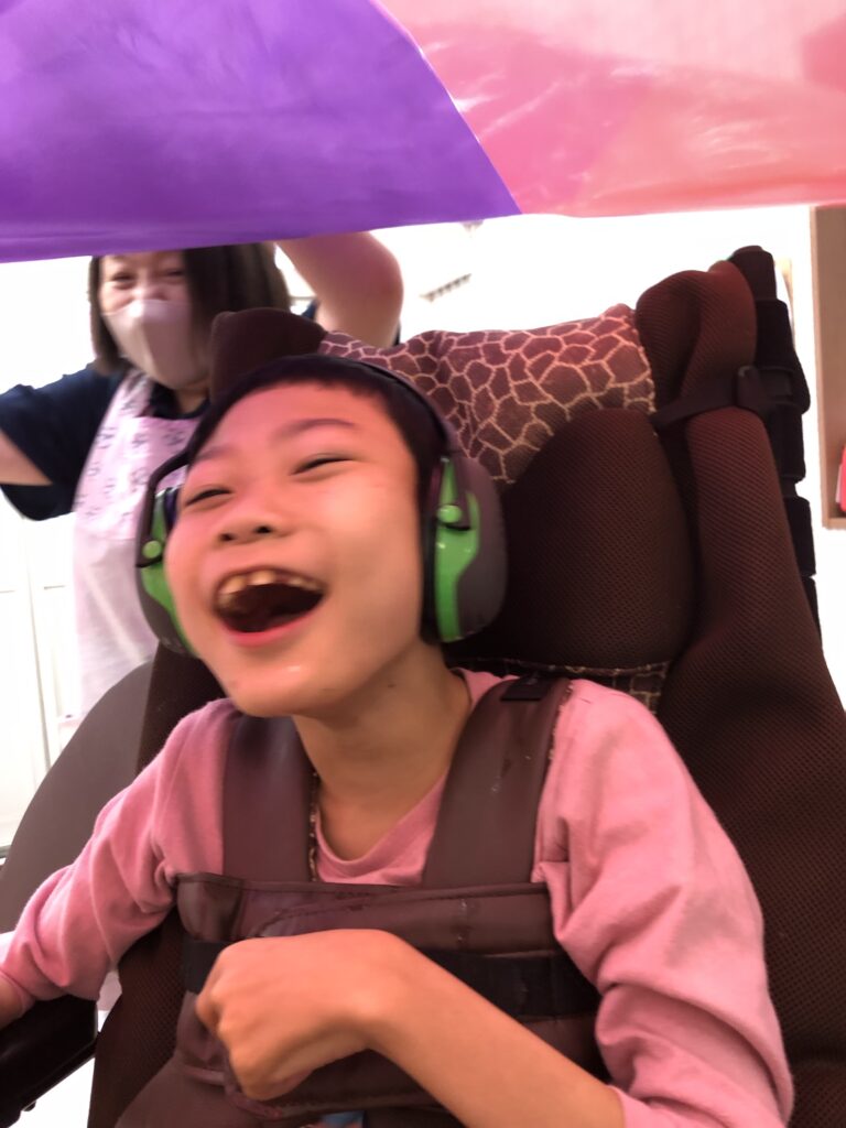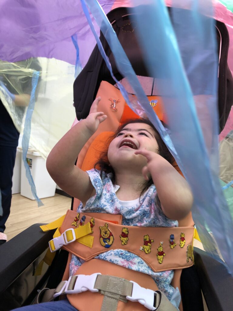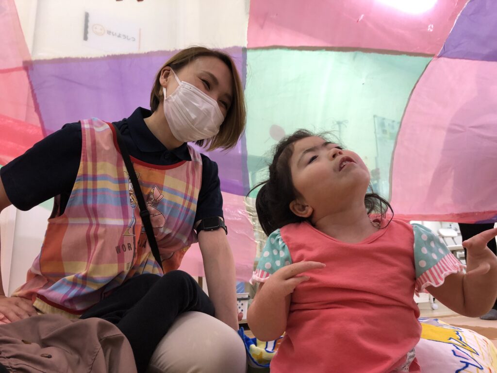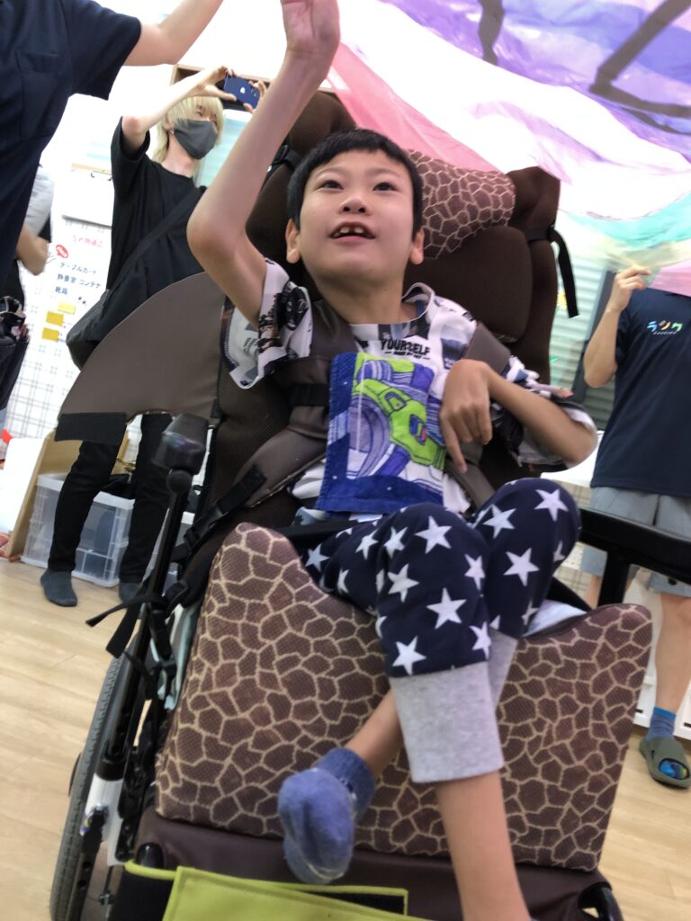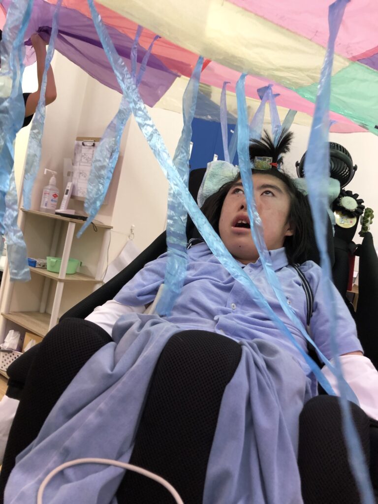 車椅子に乗っている方は、過ごしやすい角度によっては普段前ではなく上を見て生活をしている方もいらっしゃいます。そのためバルーンの中に入って、上の景色を楽しめるのも、ひとつこの活動の良いところだと思います♪