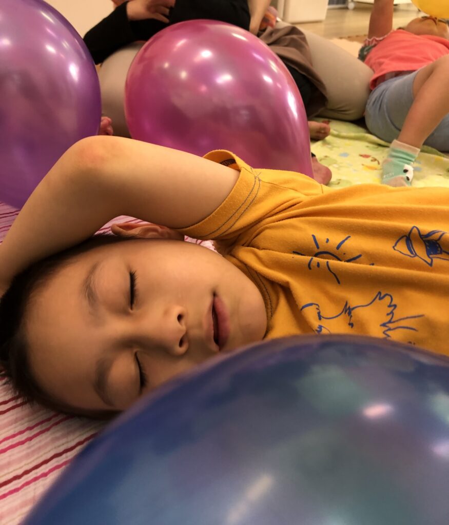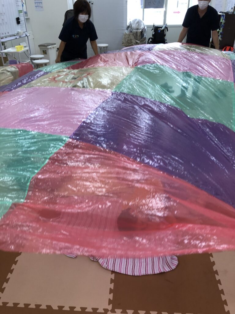 みんなでいっしょにバルーンを持って遊ぶのも良いのですが、ラシクでは「風を感じる」「色の移り変わりを楽しむ」「バルーンの音を楽しむ」という主に感覚刺激をねらいとして日々の活動に取り入れています!