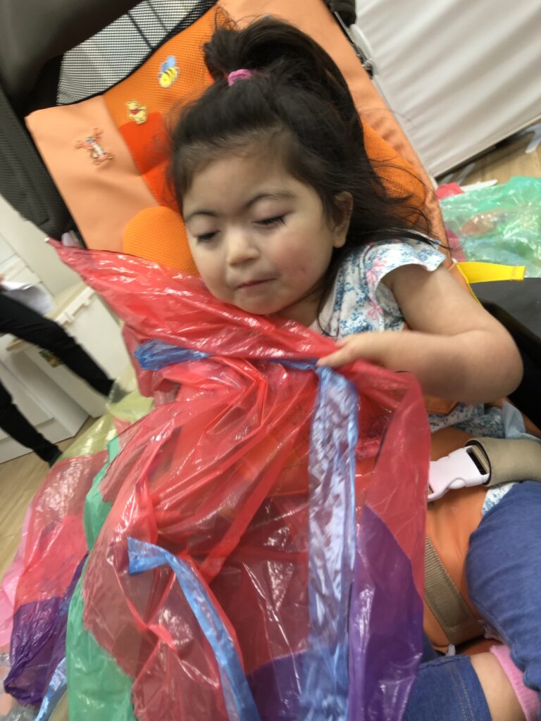 その中で、ビニールのガサガサ音が苦手だったお子さんが、「これは楽しいものだ!」と気付いてきたのか、音に不快を示すことがなくなってきたのです!