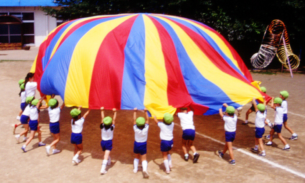 いろんな技があり、中央に大人が一人入って手を上にあげ、周りの人たちはバルーンを持って回る「メリーゴーランド」や、ボールをバルーンの上に乗せてポンポンと飛ばす「ポップコーン」など、様々な楽しみ方ができ、表現力や協調性を育むことができます。