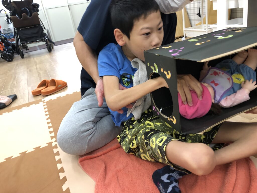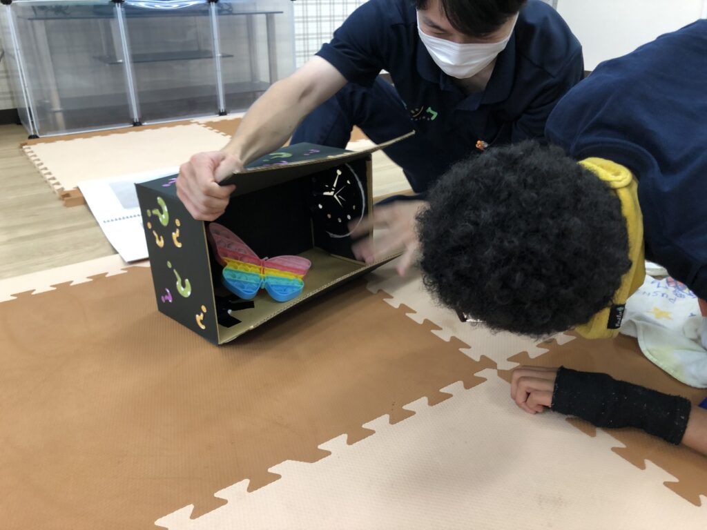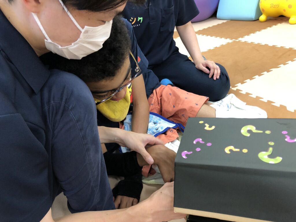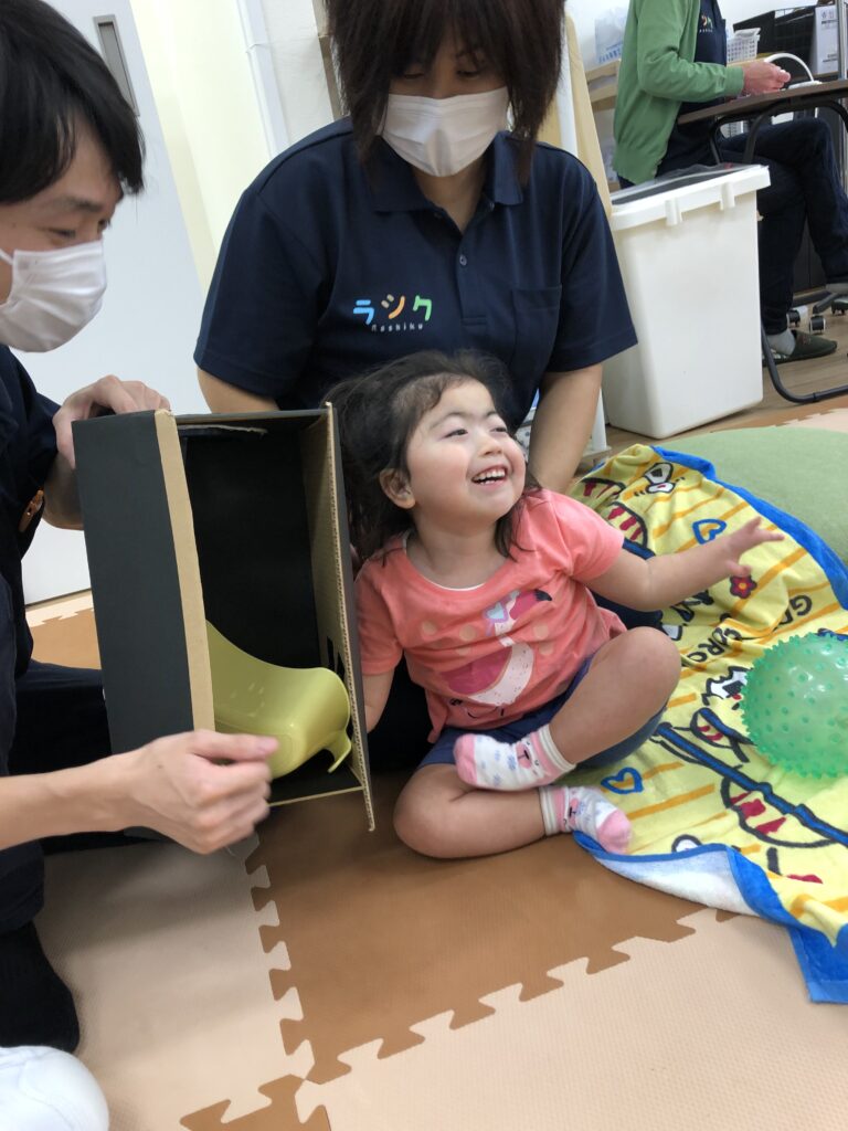 目👀で見える情報がない状況の中で何が入っているかも分からない箱の中に手を入れて物の触れるのは不安ですよね、、、。でも、お友達からのヒントを得ると少し安心するようですね。