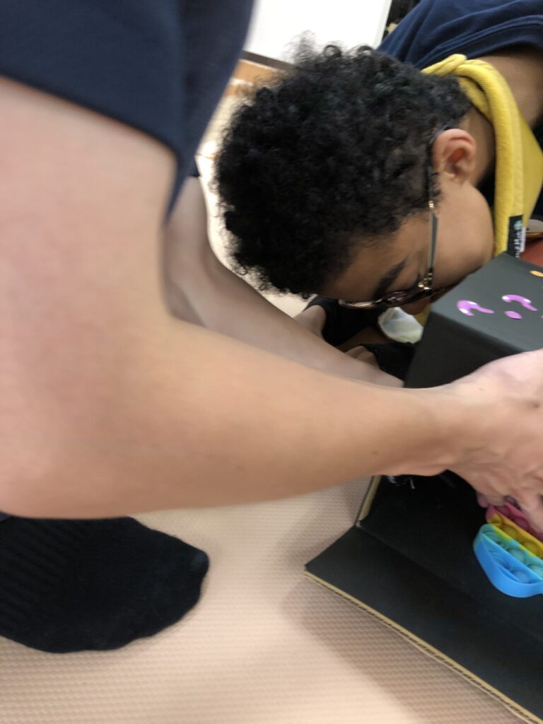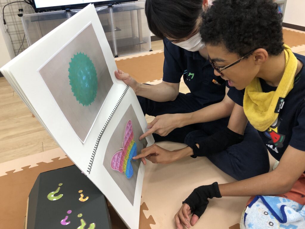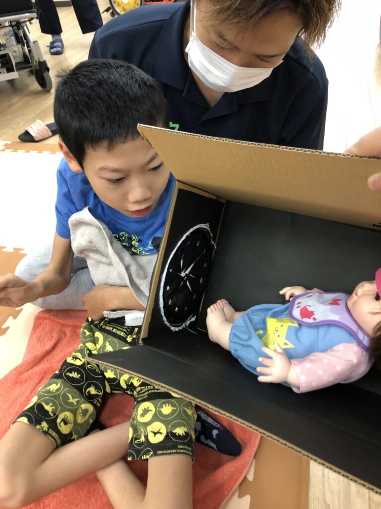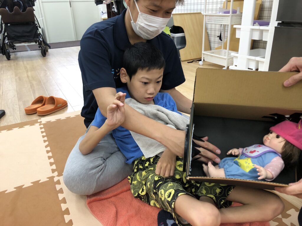 目👀で見える情報がない状況の中で何が入っているかも分からない箱の中に手を入れて物の触れるのは不安ですよね、、、。でも、お友達からのヒントを得ると少し安心するようですね。