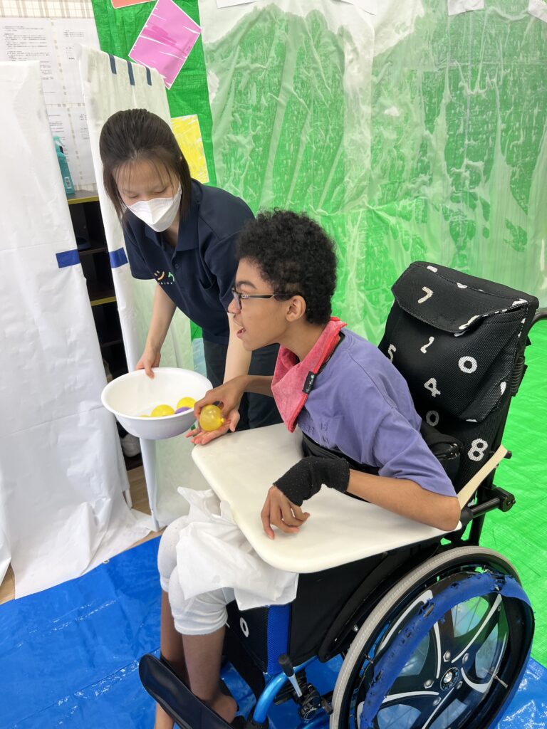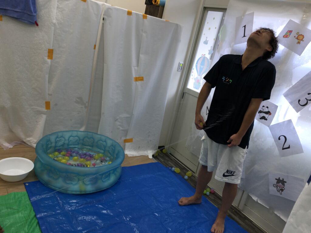 スタッフと協力して目の前の的に当てつつ水風船を割り思いっ切り濡らしていきます(●´ω`●)