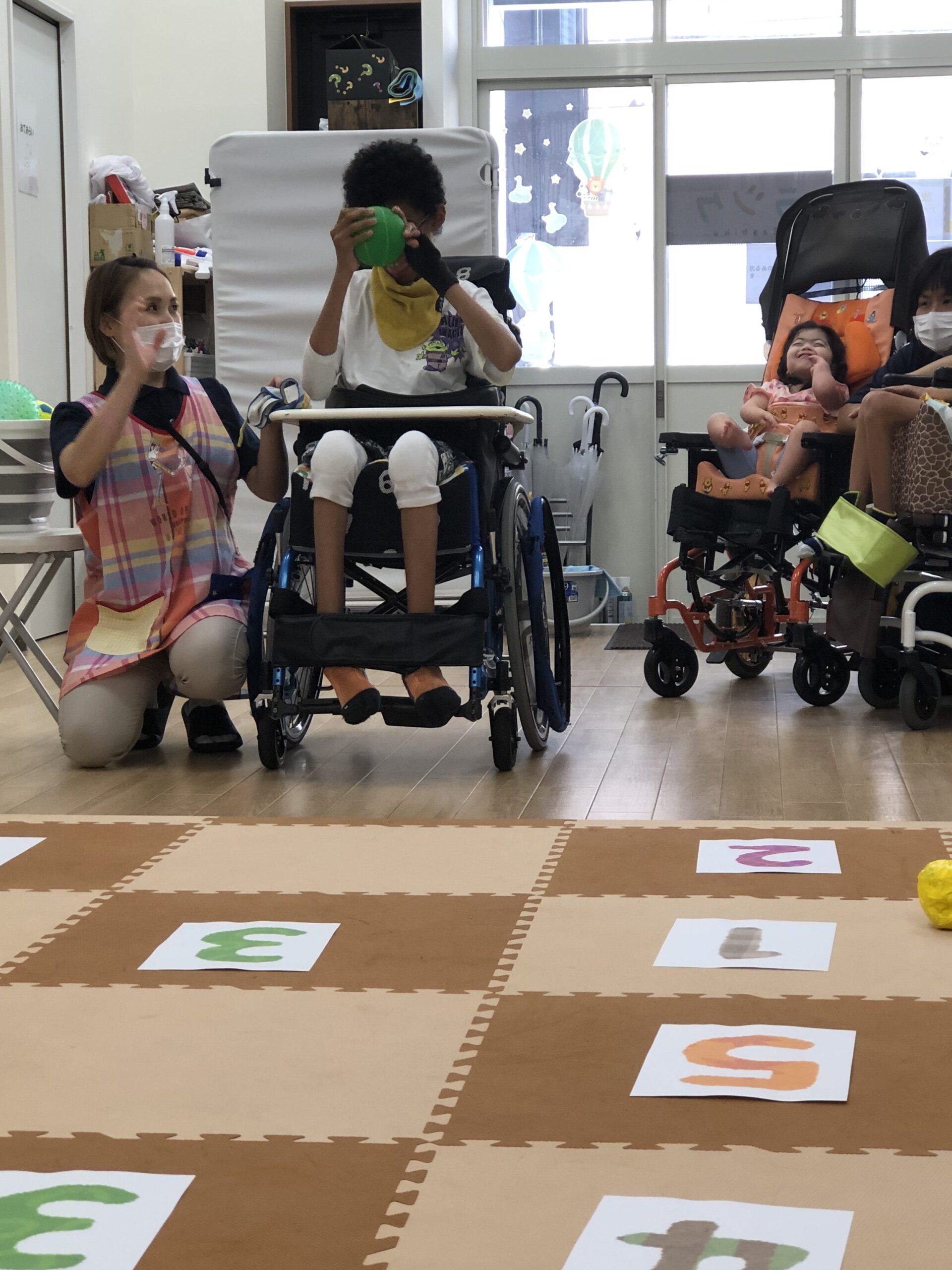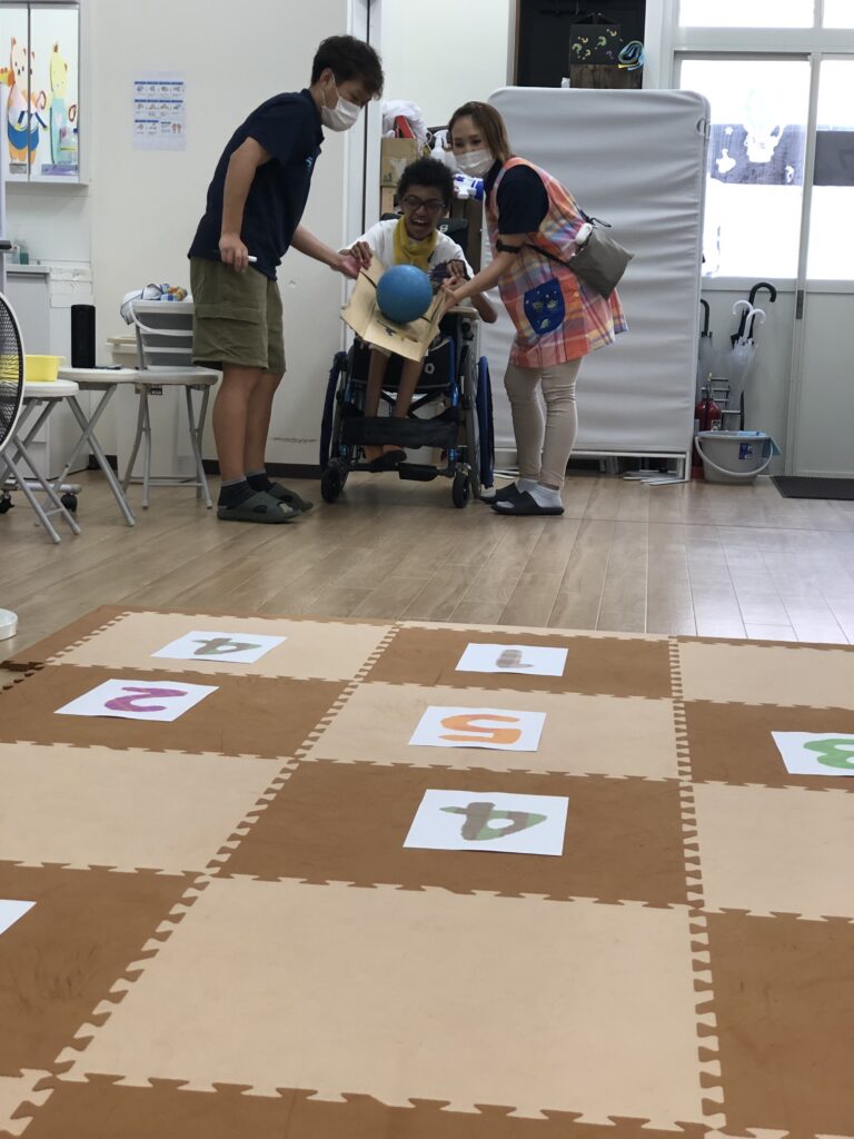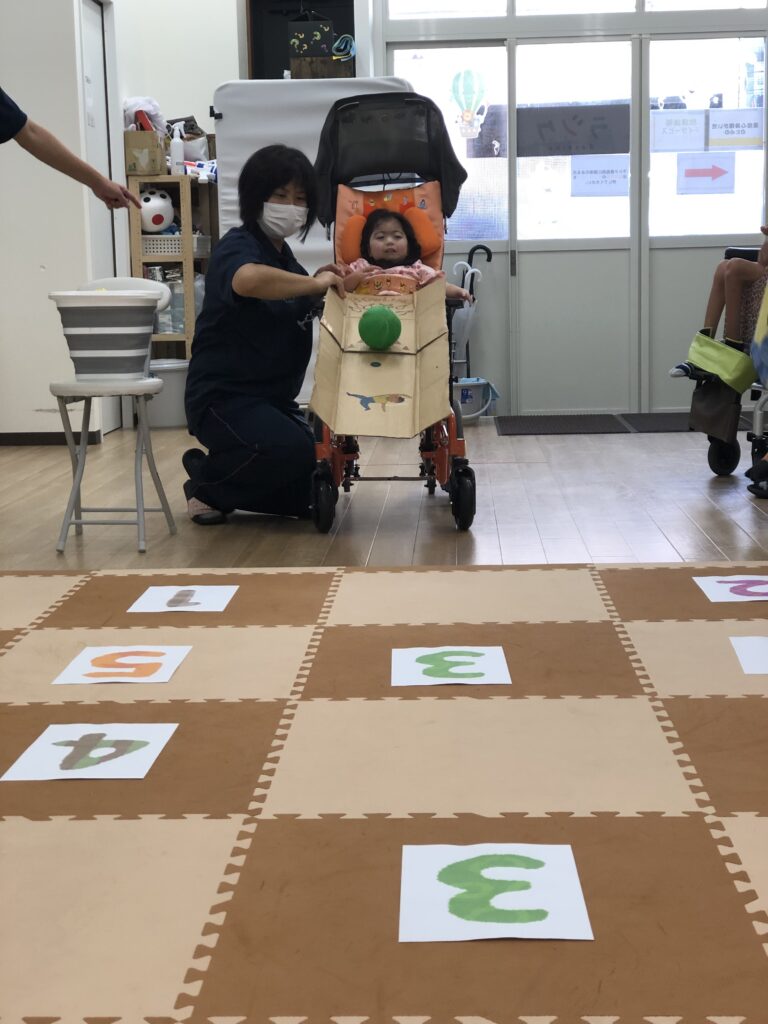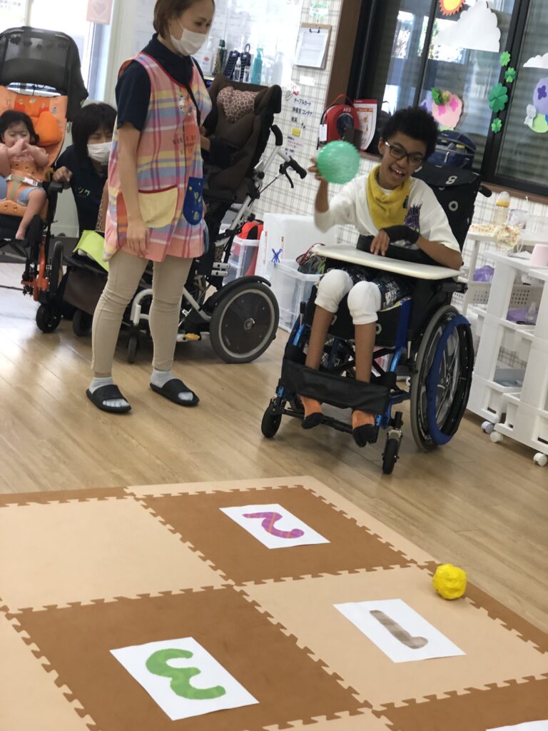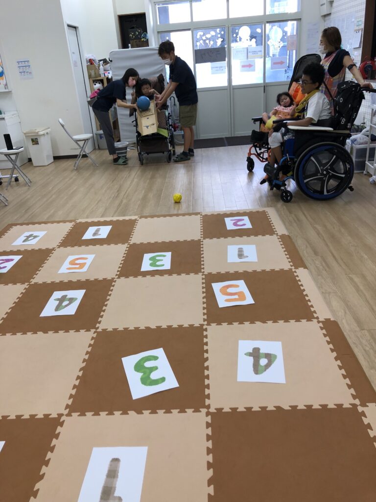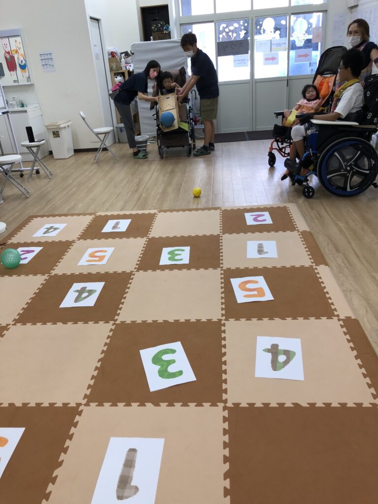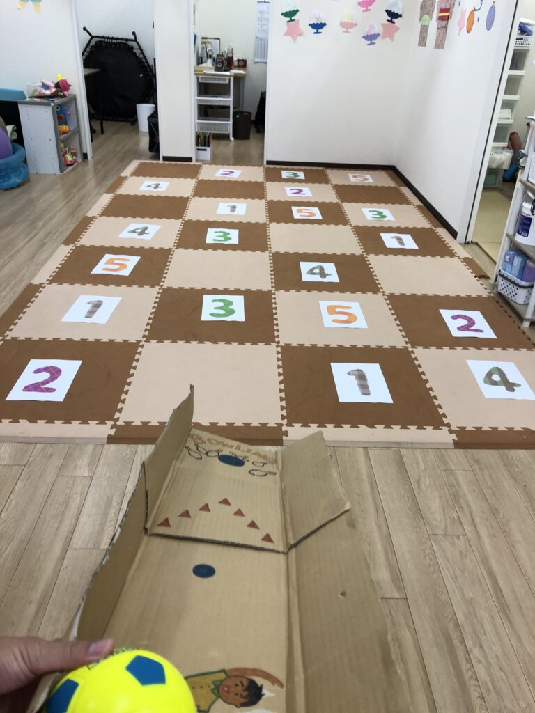 マットに1~5の数字を置いて、ボールを投げたり転がしてマスに入れていきます🏀💨
