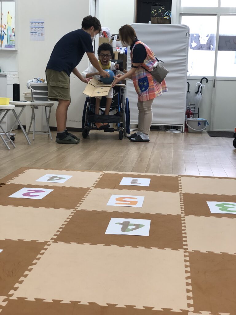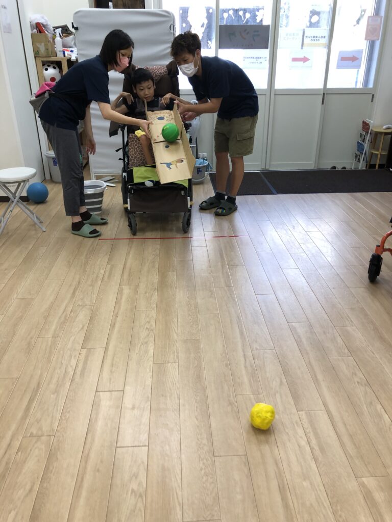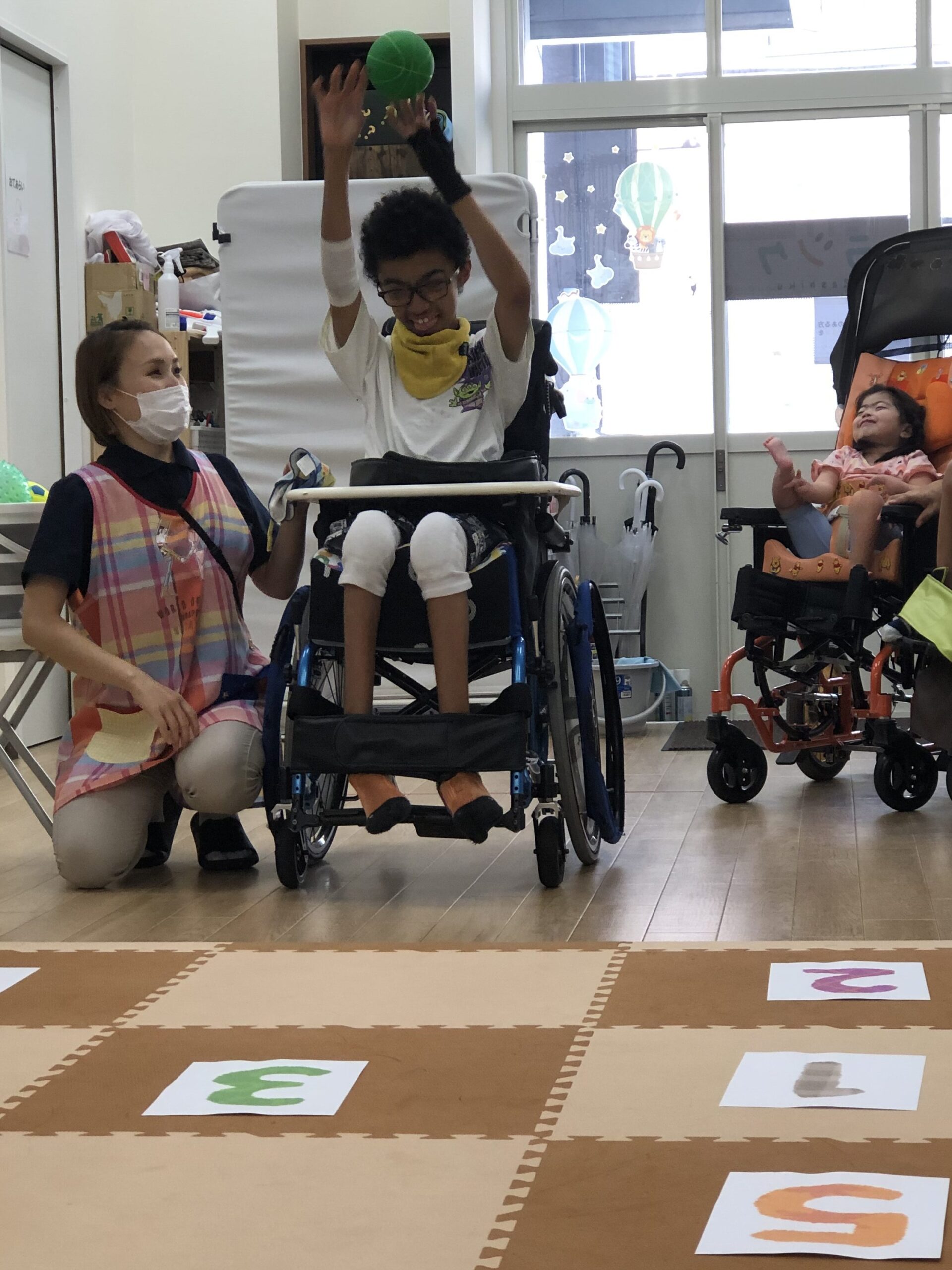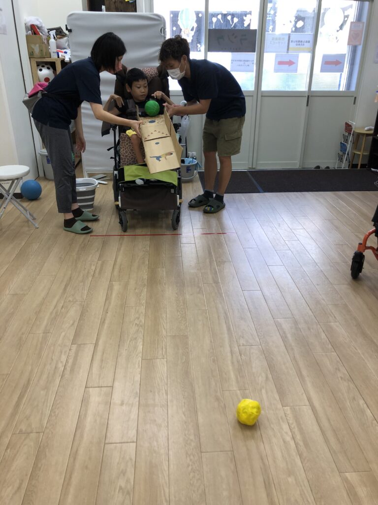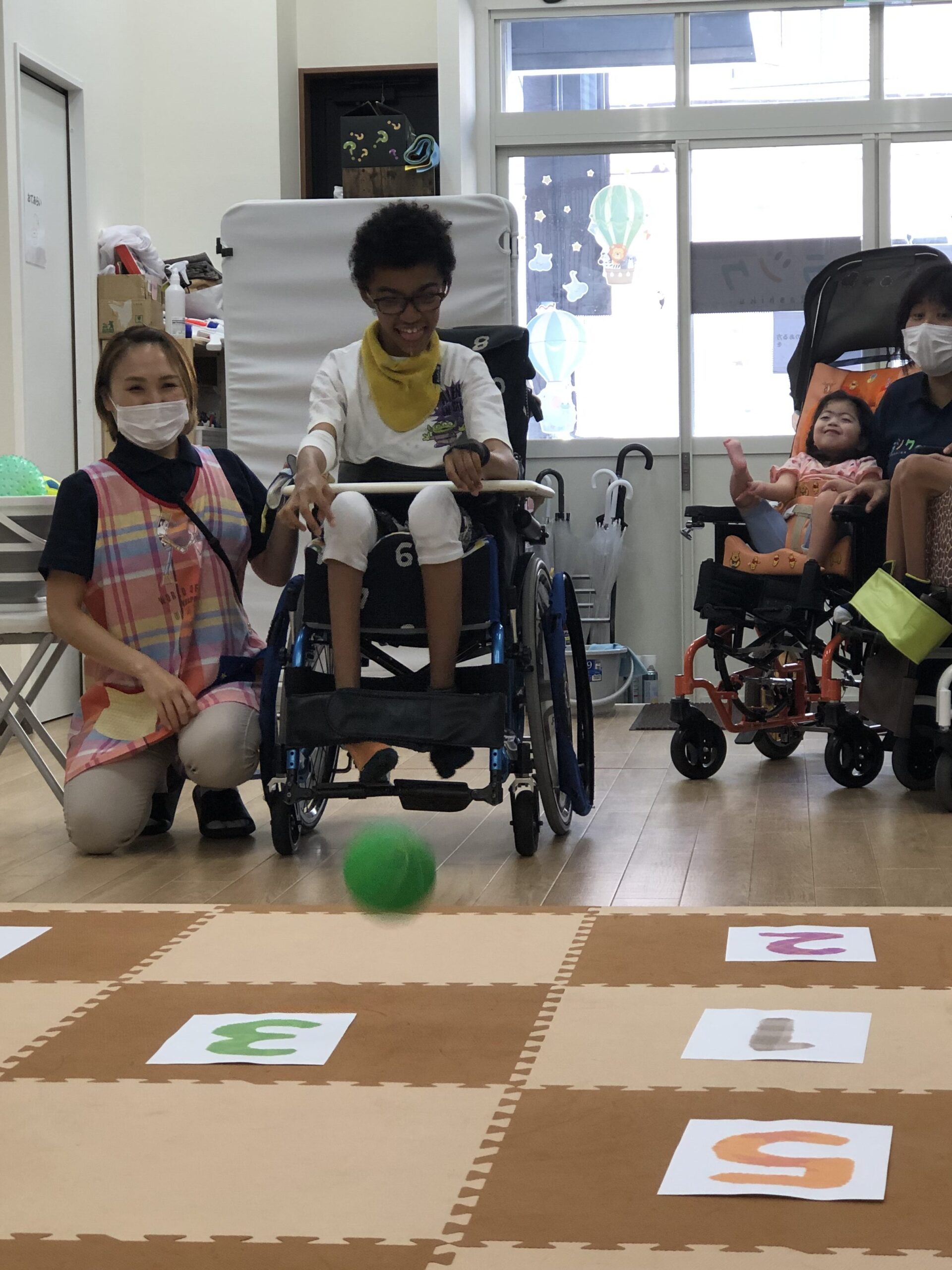マットに1~5の数字を置いて、ボールを投げたり転がしてマスに入れていきます🏀💨