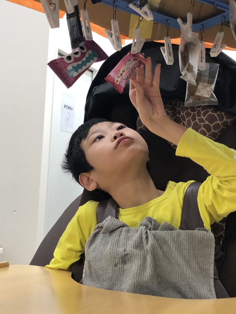 いつもぶら下げている果物では手が伸びなくても、お菓子が下がっていると手が伸びるお友達もいました(^^;)