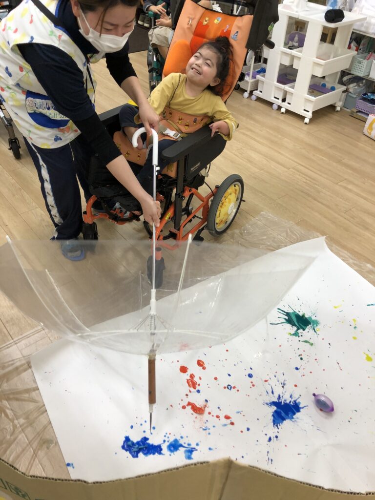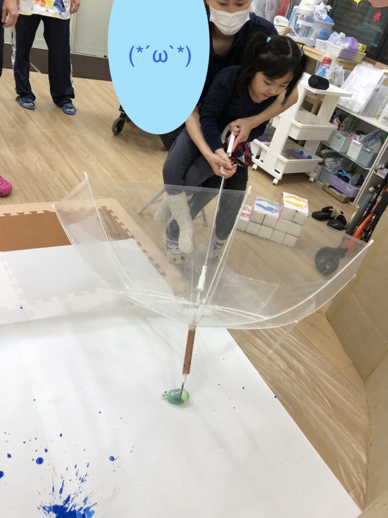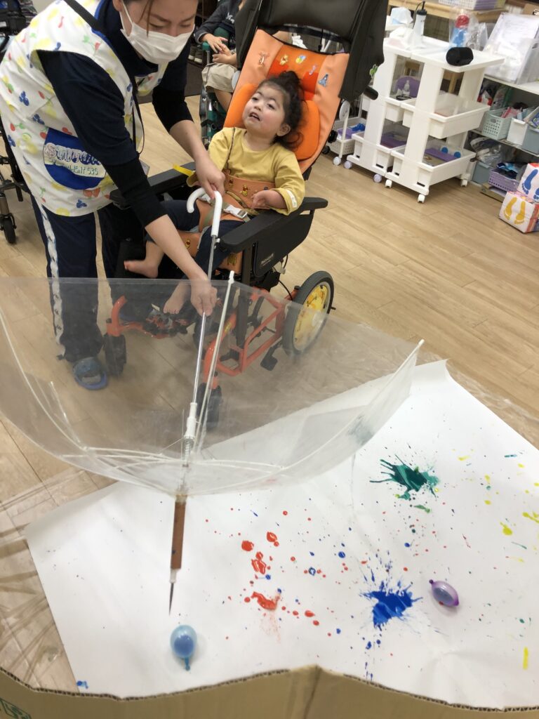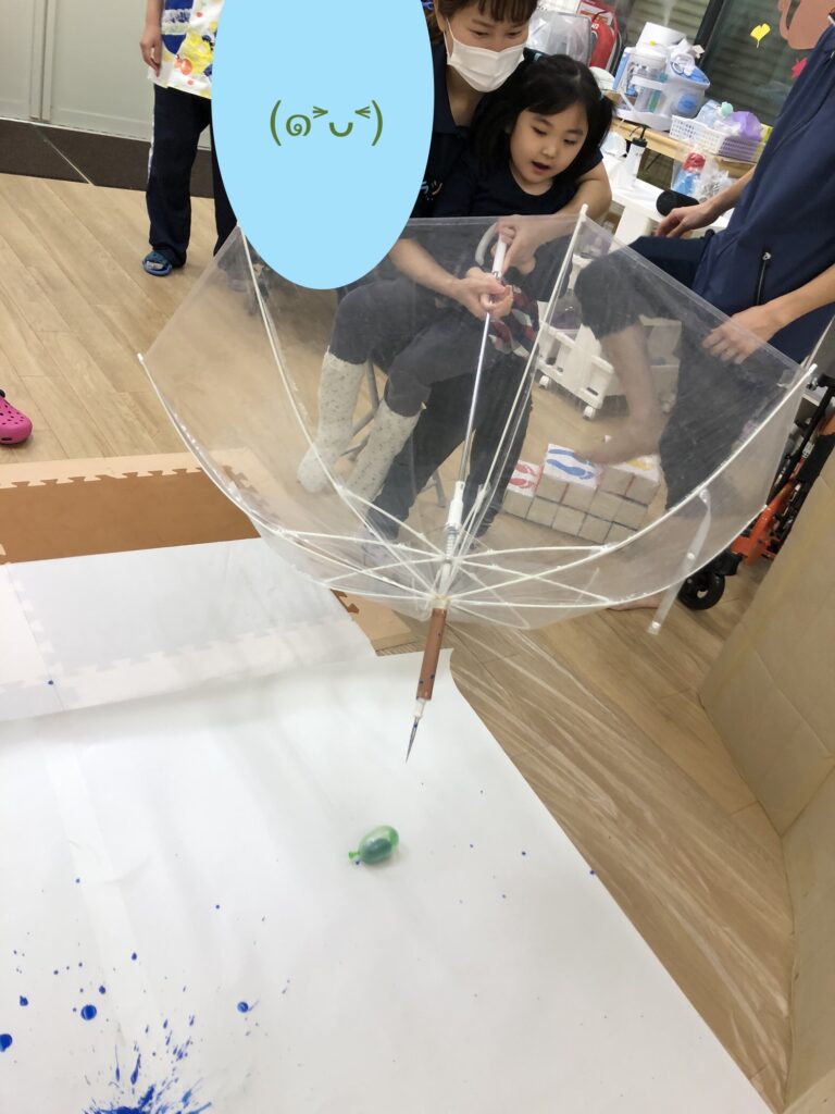 水風船の中に絵の具を溶いた水を入れ、ぱんっ!と割り