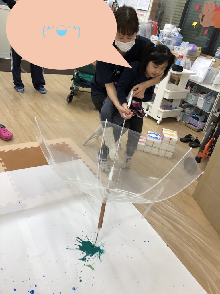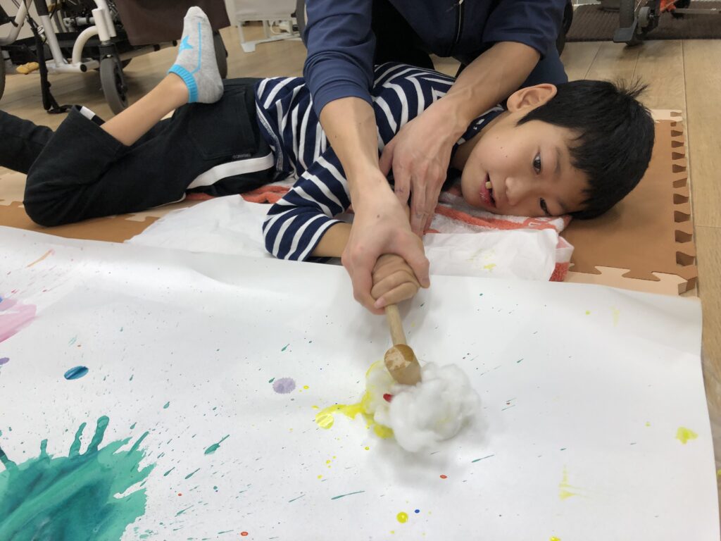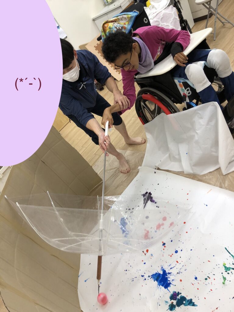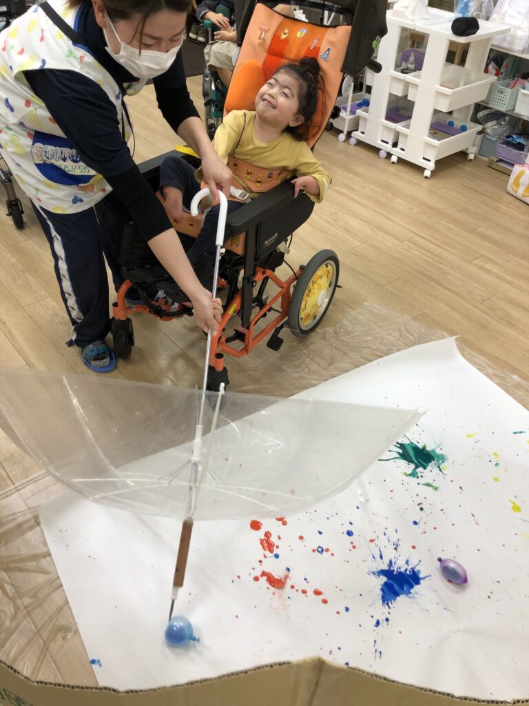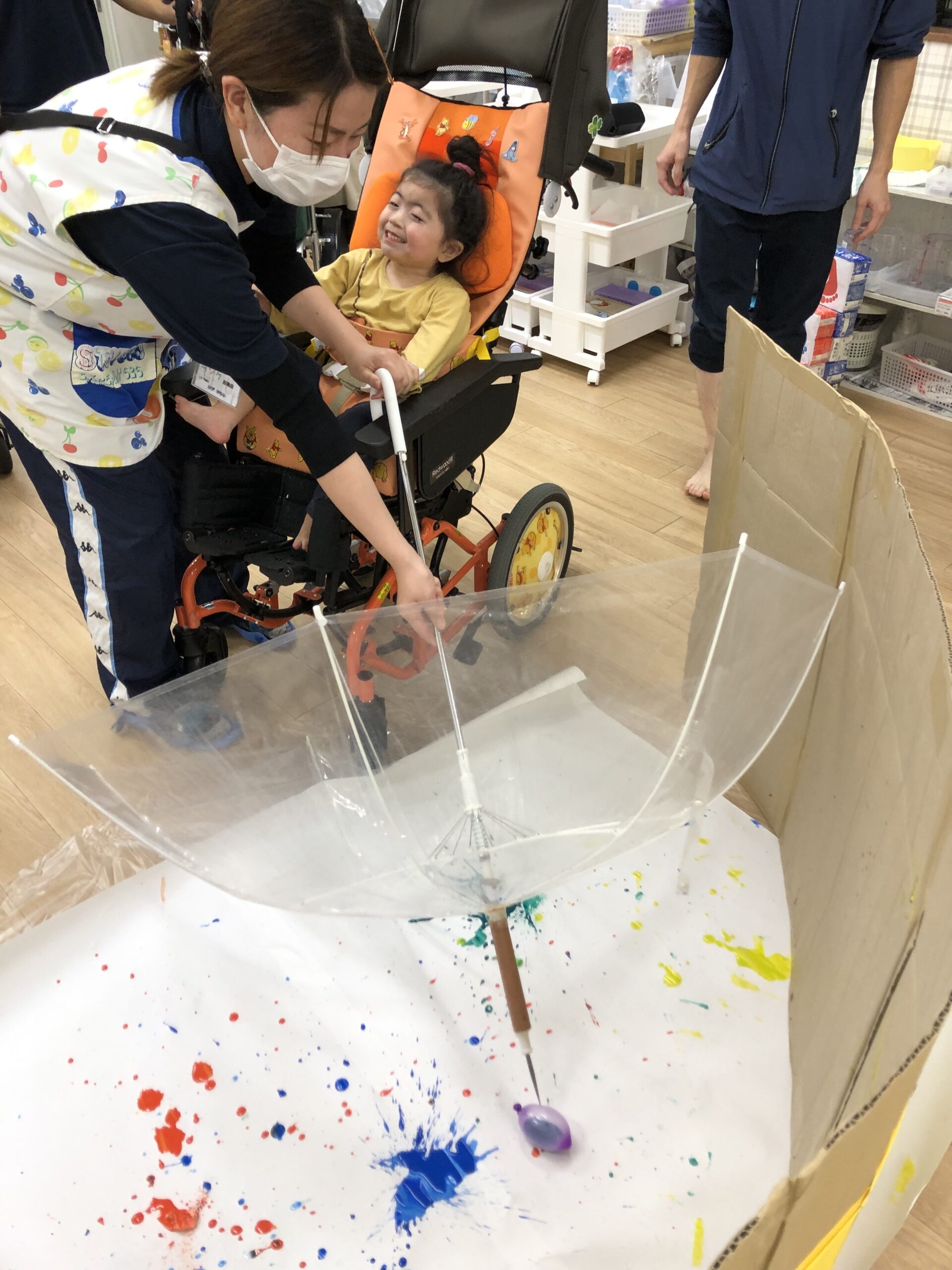 水風船の中に絵の具を溶いた水を入れ、ぱんっ!と割り