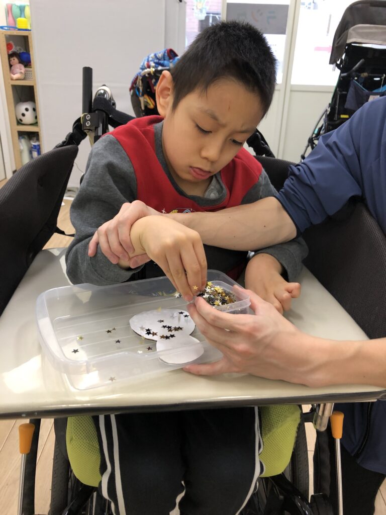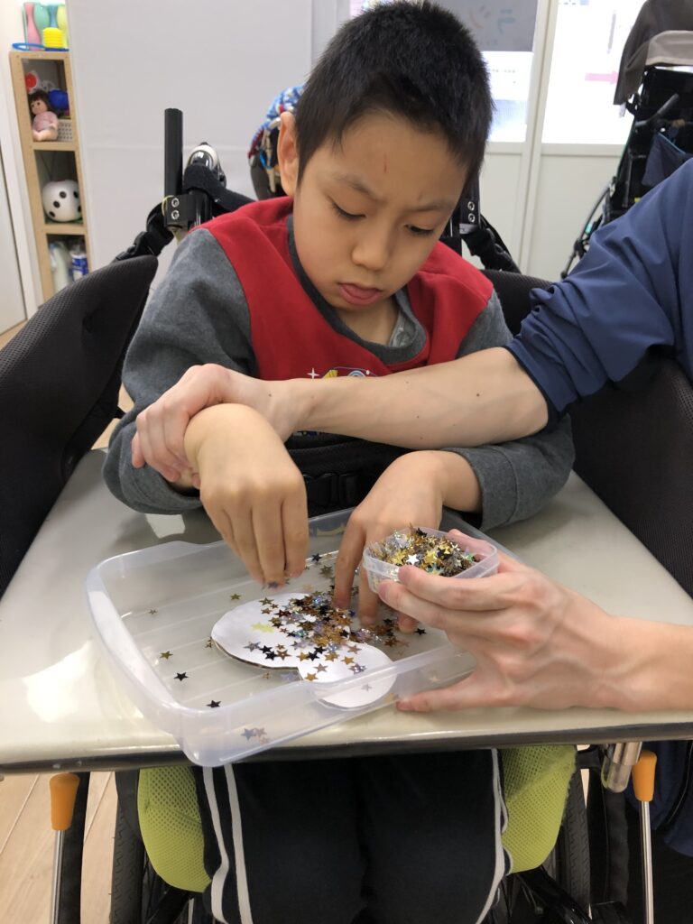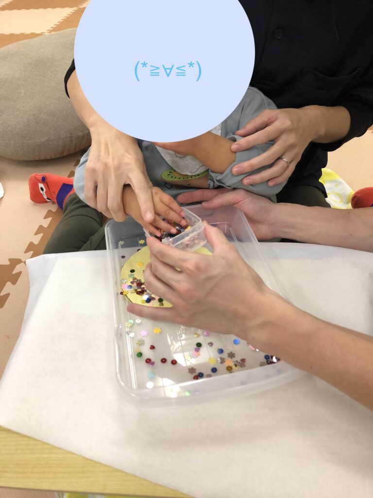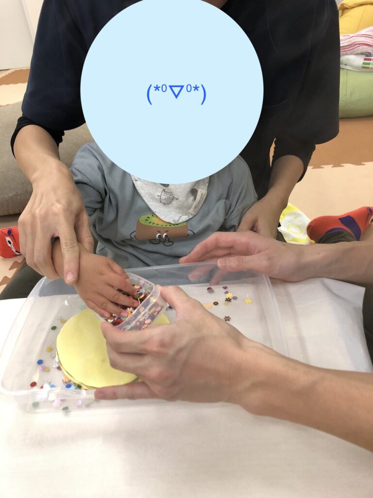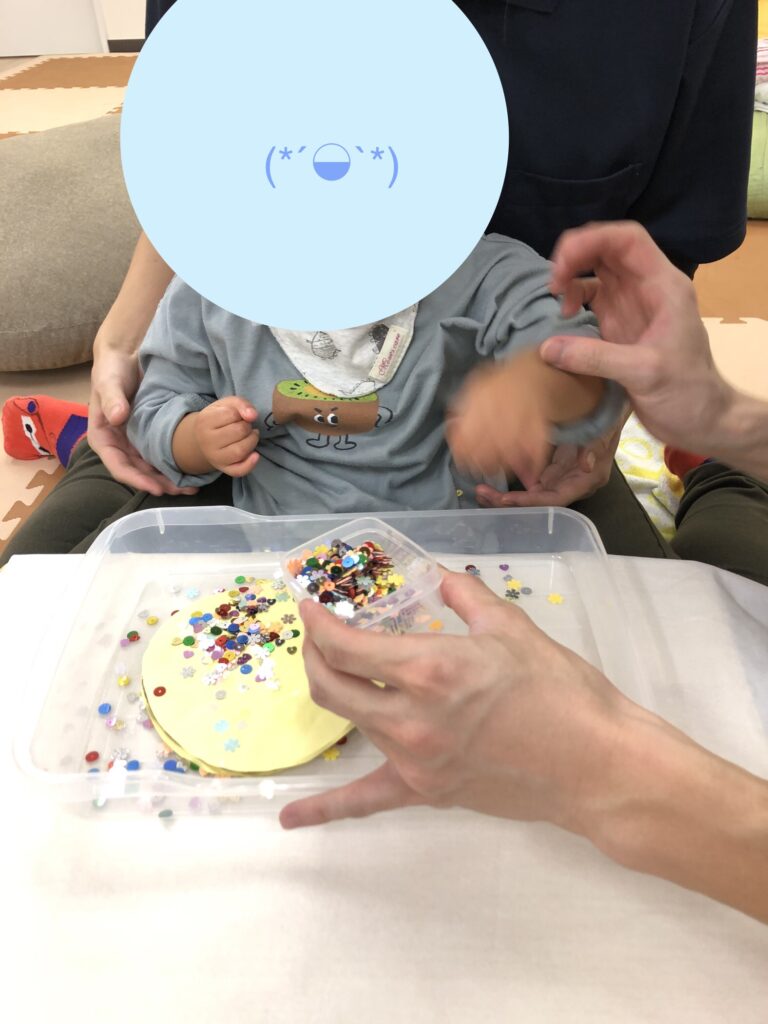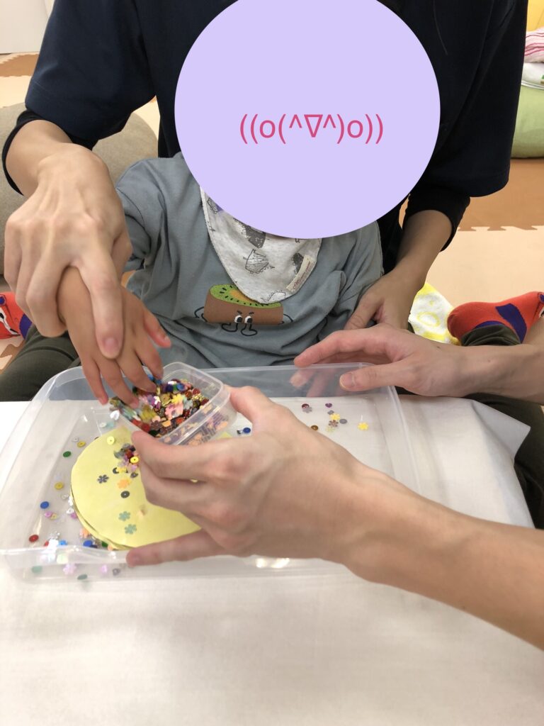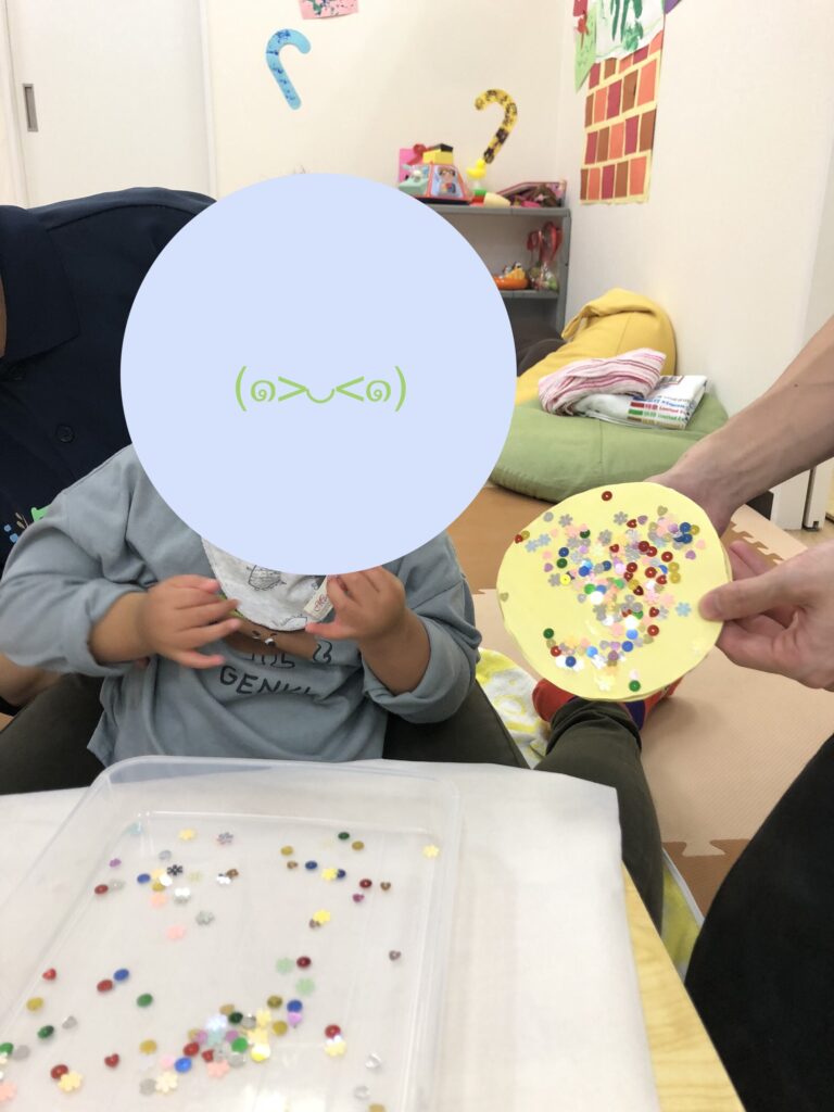 段ボールの台紙を丸や雪だるま、靴下のかたちに切り、スパンコールを上からぱらぱら~と振らせていきました(*^▽^*)✨