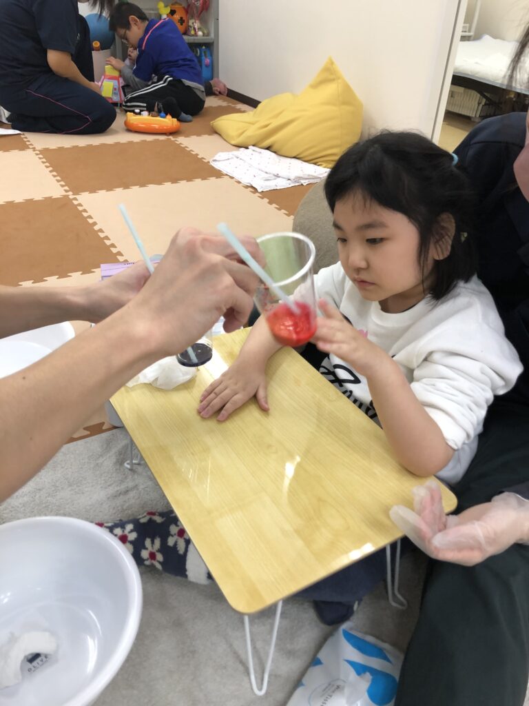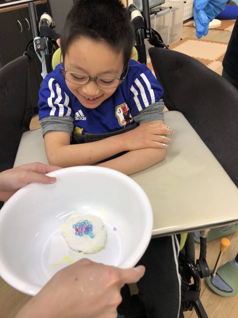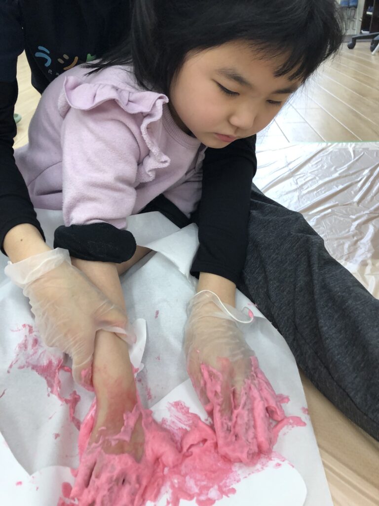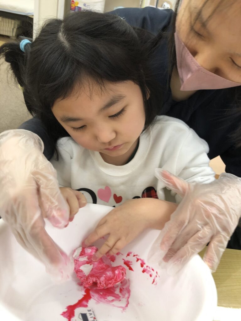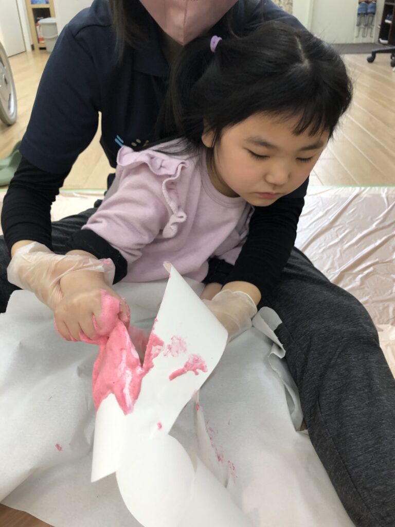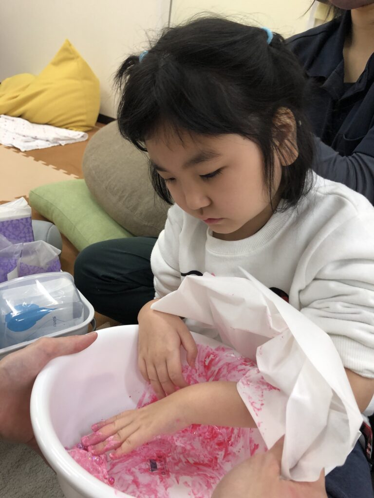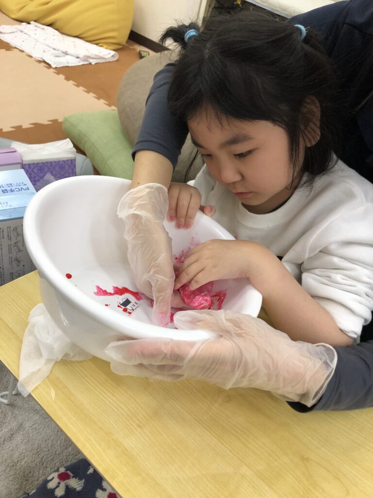 紙粘土に色水を加え、握ったり掴んだりしていろをつけていきました♪