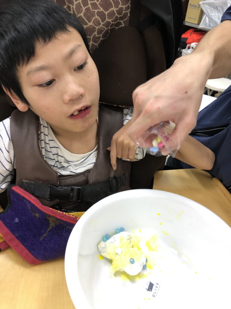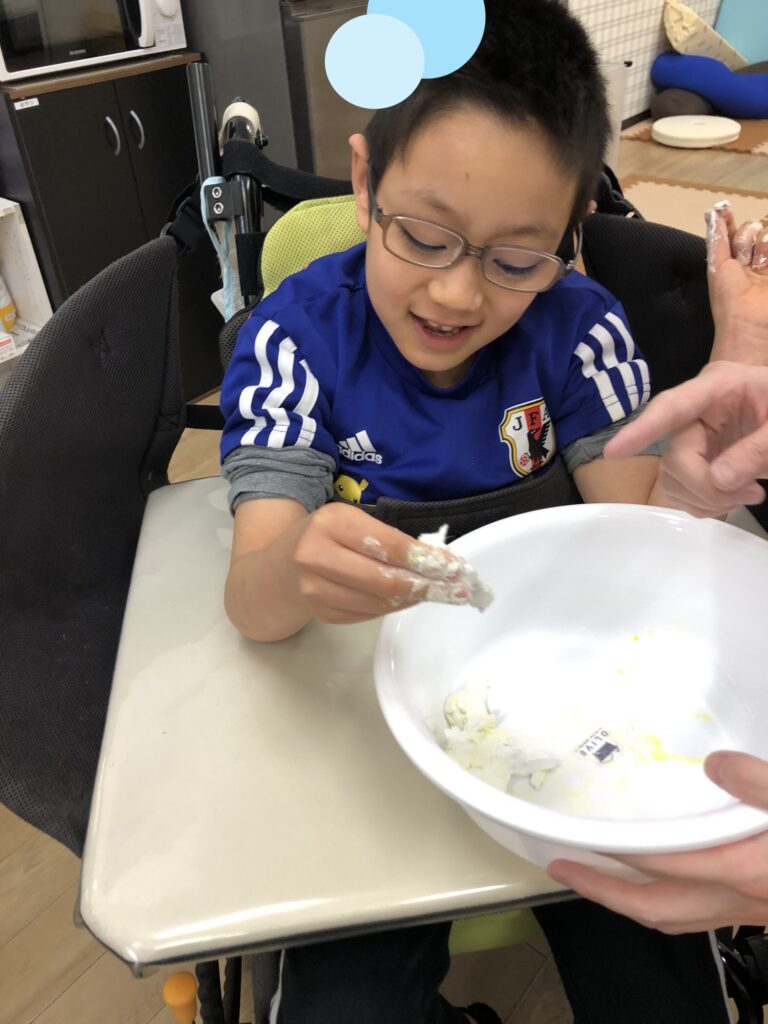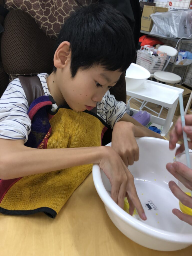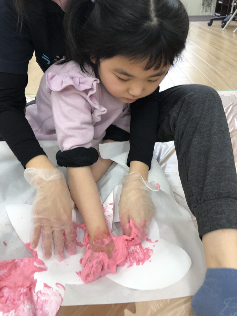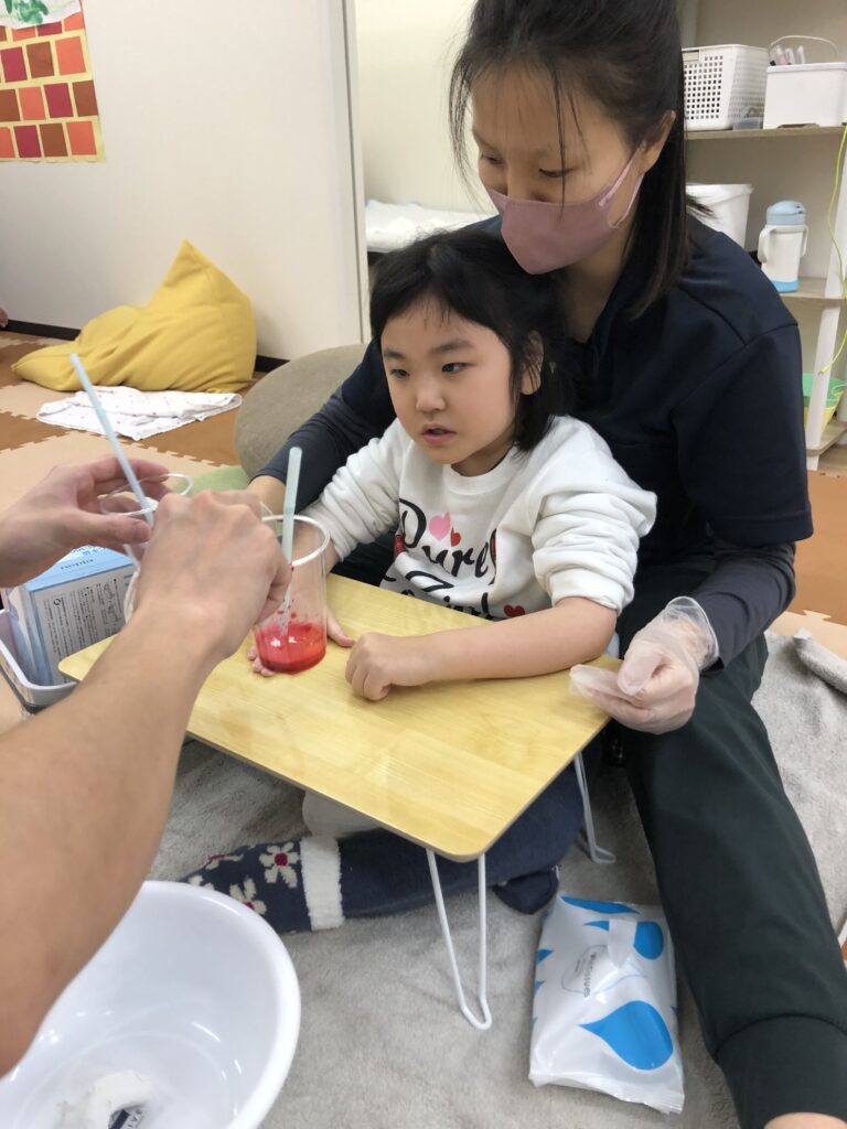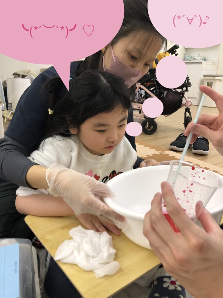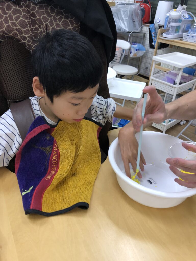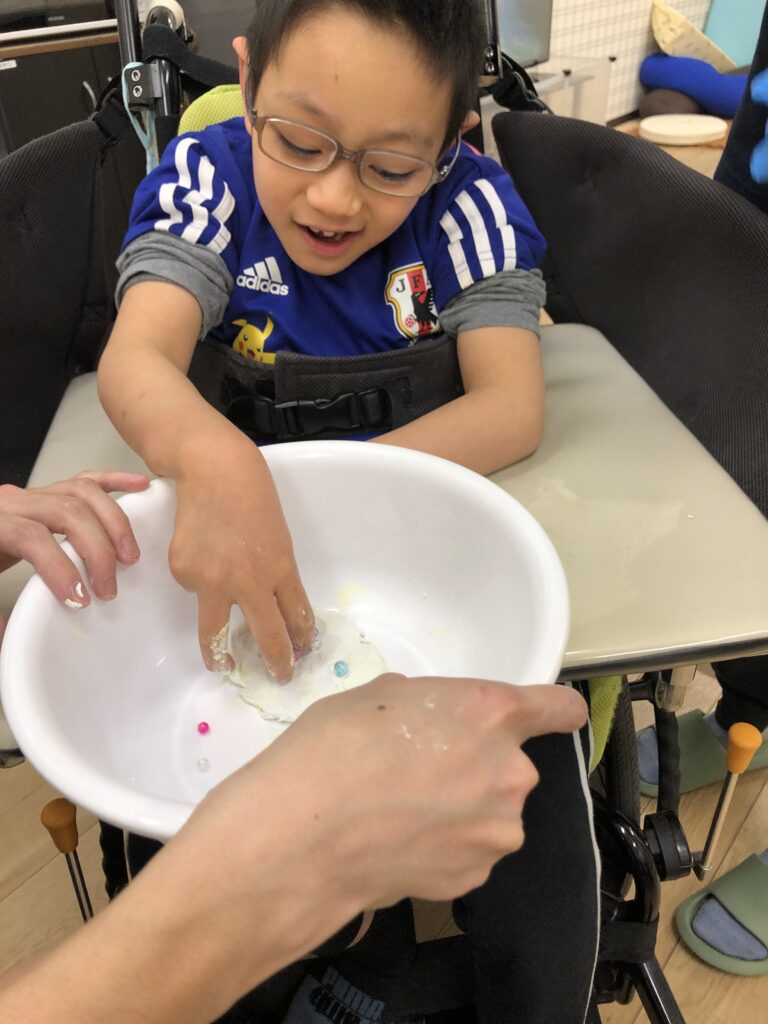 紙粘土に色水を加え、握ったり掴んだりしていろをつけていきました♪