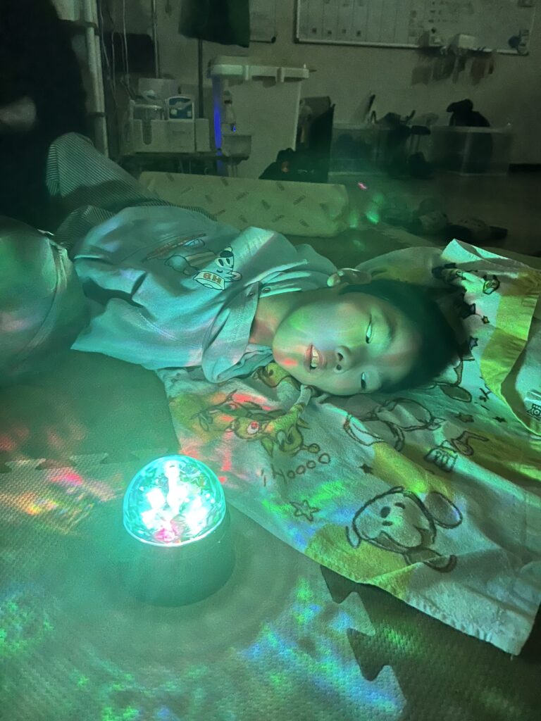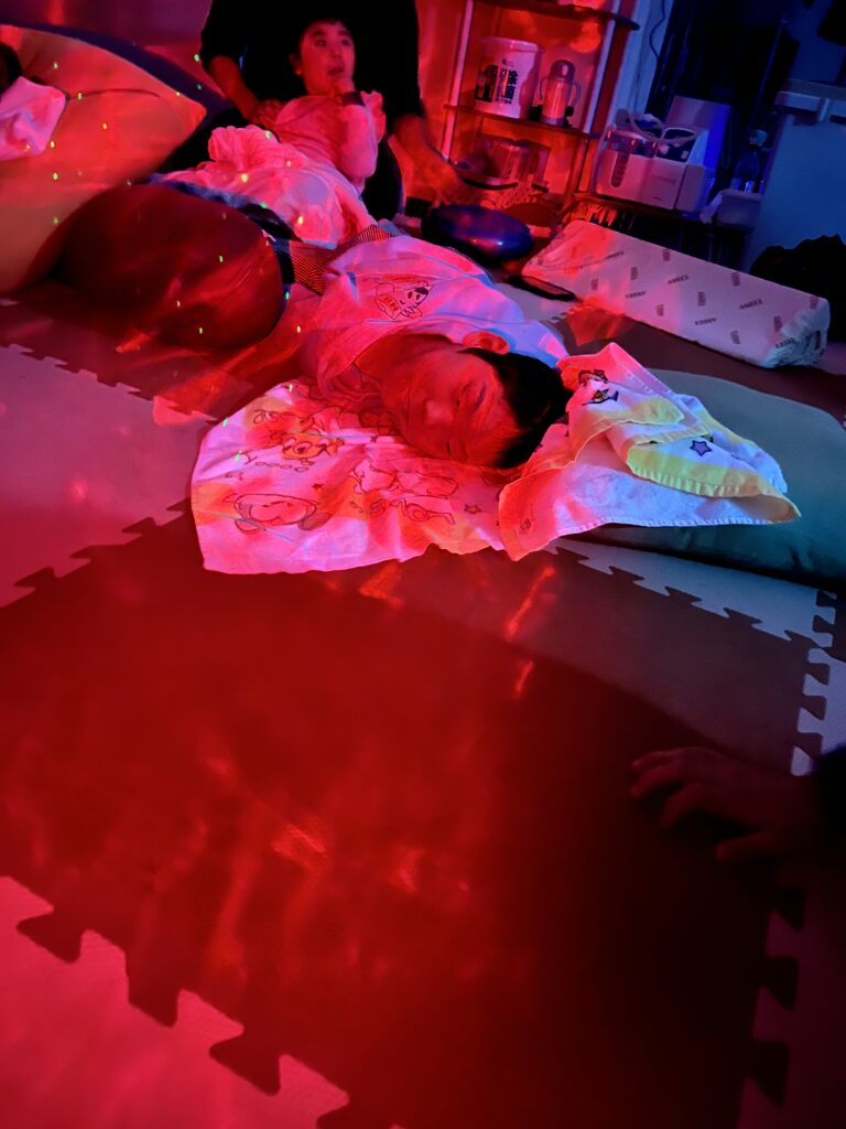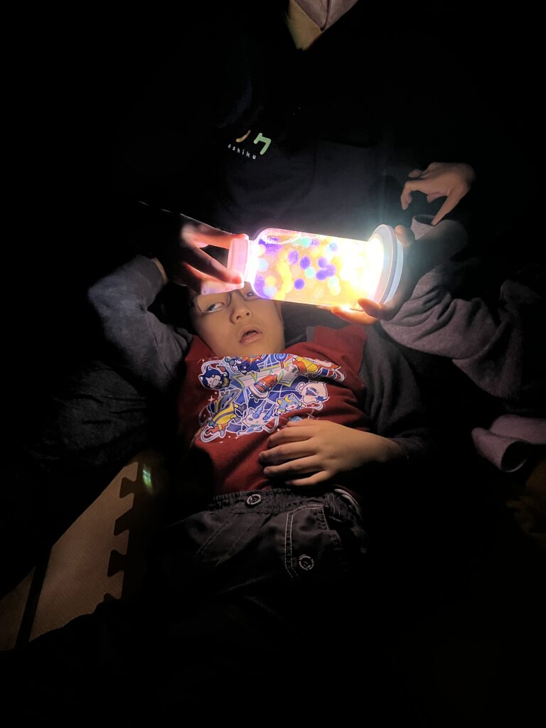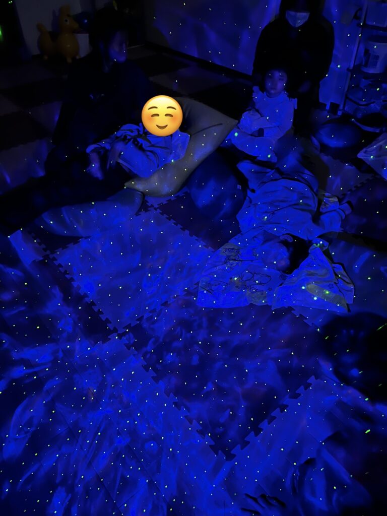 ゆったりくつろいだり、音や光を使ってリラックス。。子ども達の自発性やペースを尊重しながら部屋の中で安心感と安らぎに包まれながら感覚に訴える刺激を楽しみました。