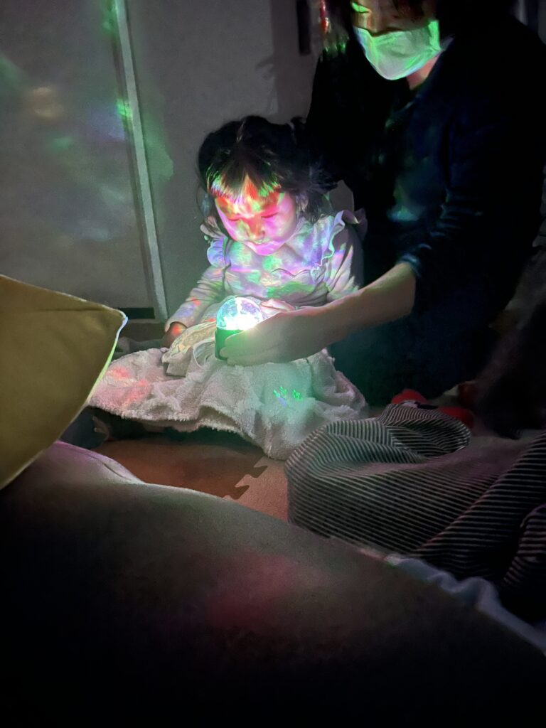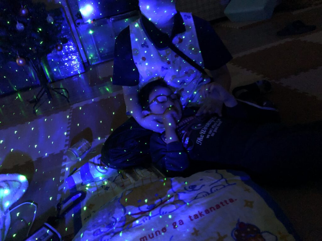 室内用のプラネタリウムを天井に映すと、天井に映る星空にうっとり🌌時にはリモコンで音や光を変えながら。。。