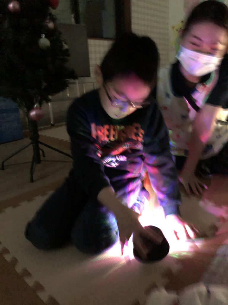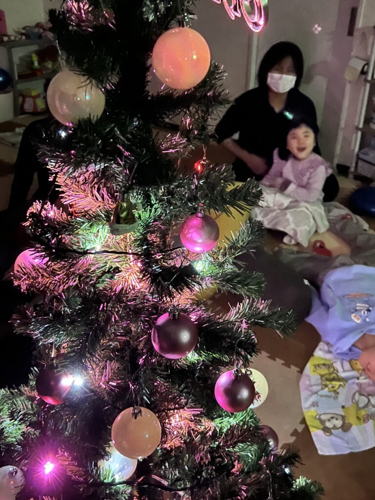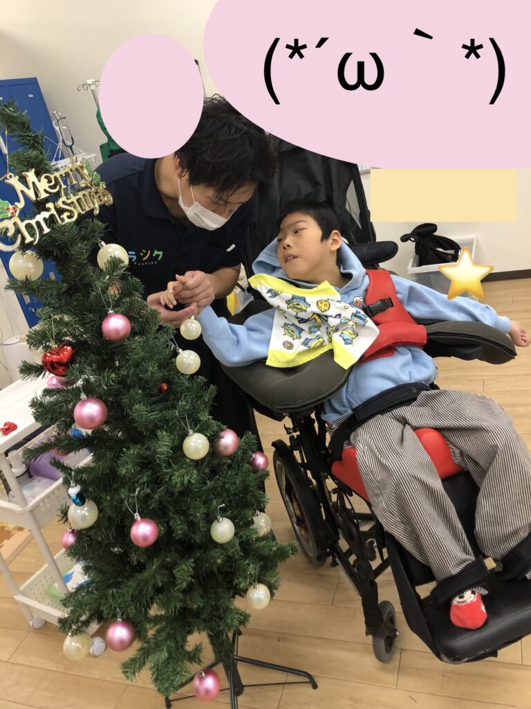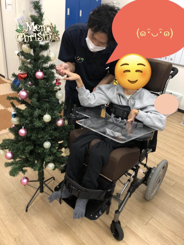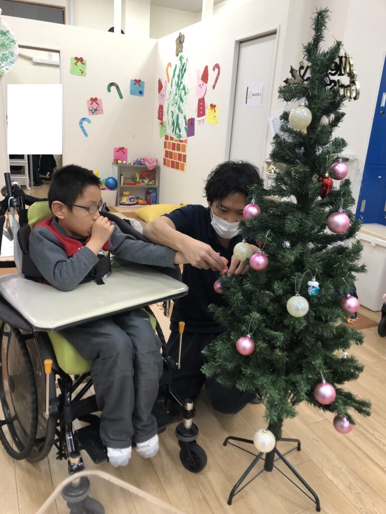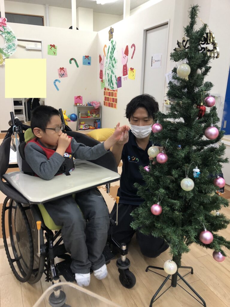 さて12月に入った頃、教室にクリスマスツリーを出し子ども達と一緒に飾りつけを行いました。スヌーズレンの時間に合わせて点灯する予定です。