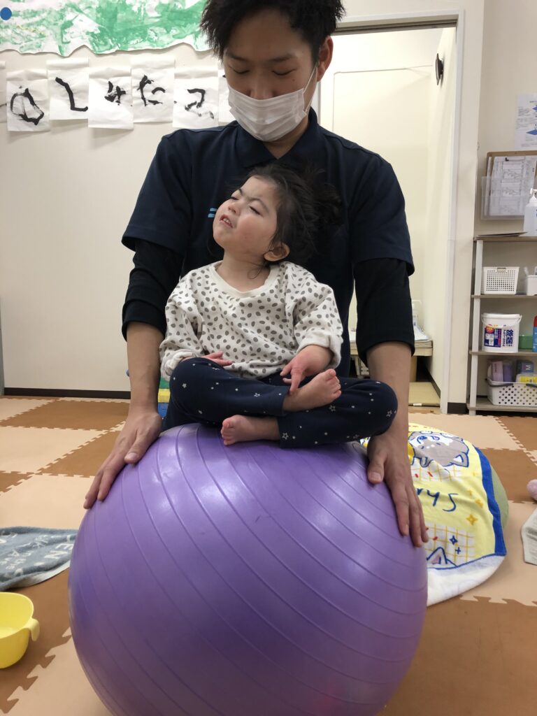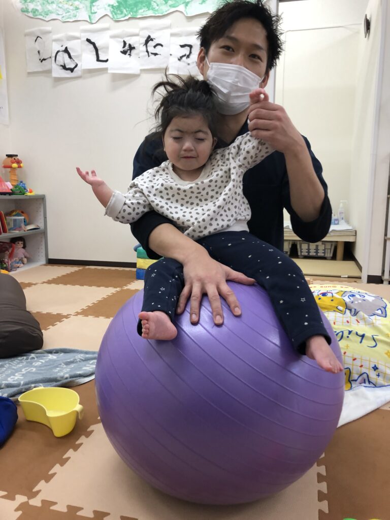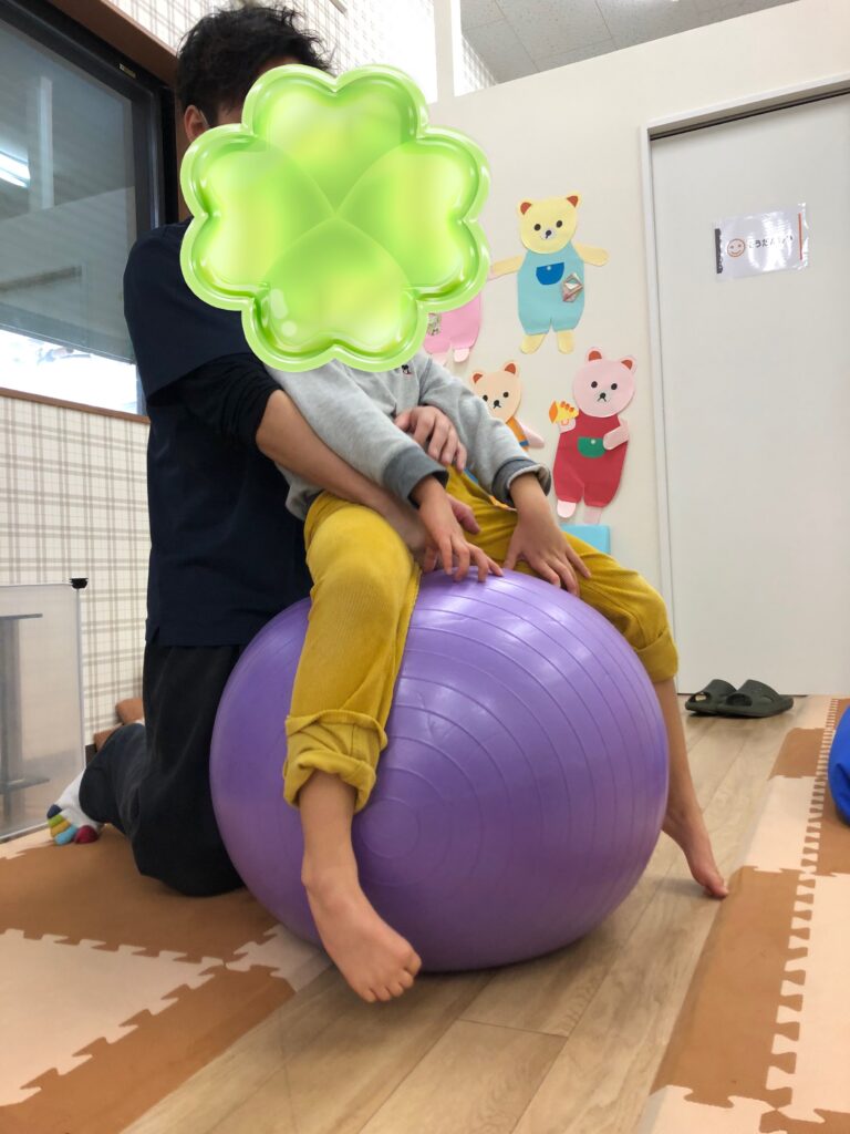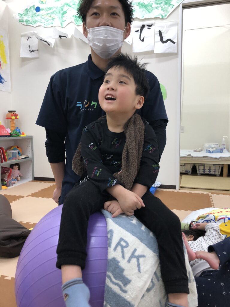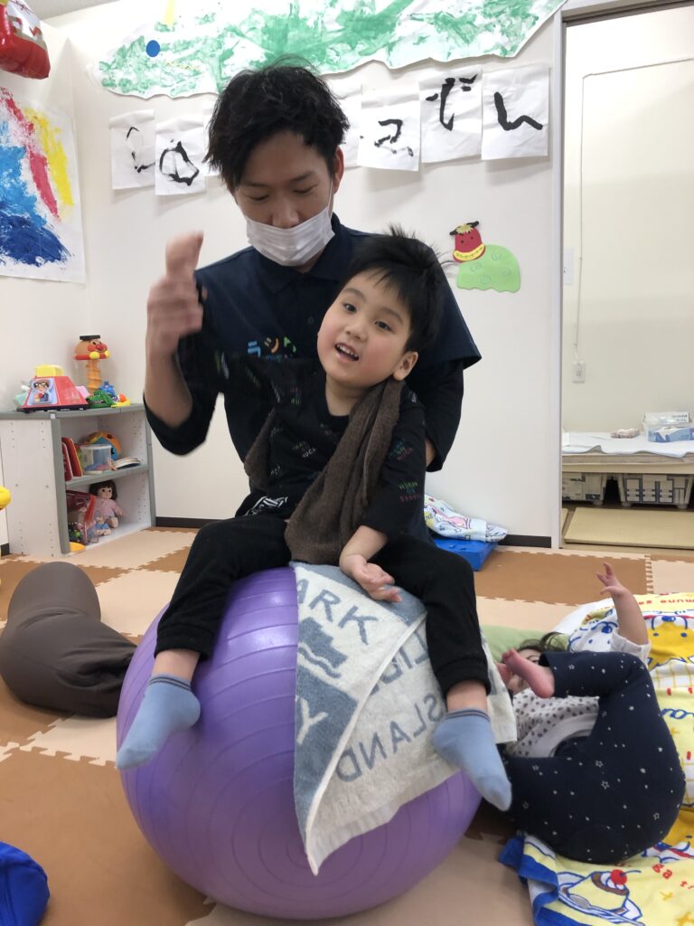 ラシクでは一人ひとりに合わせバランスボールに乗ることにより、表情はどうか声を出しているかなど子どもたちの一つ一つのサインを見逃さないように行っています![]()