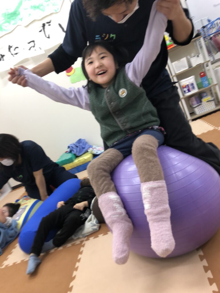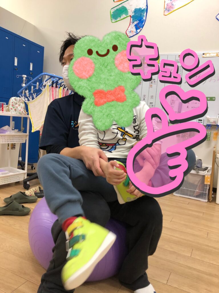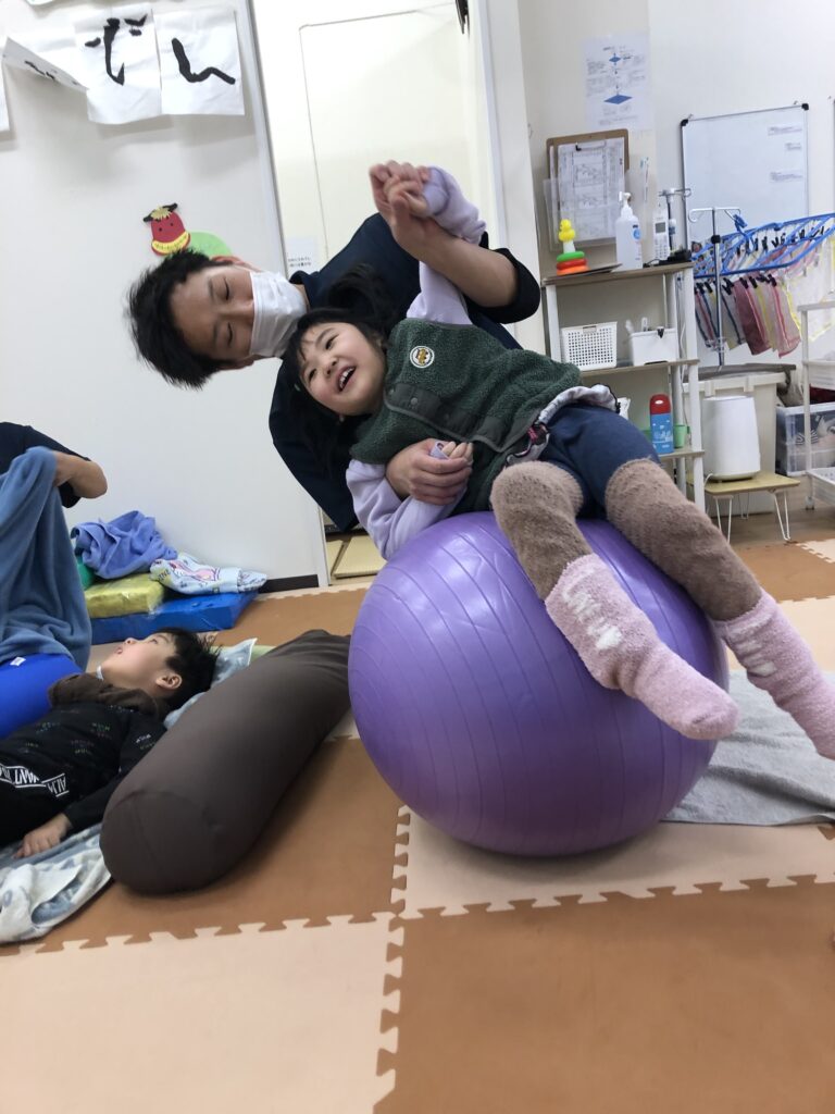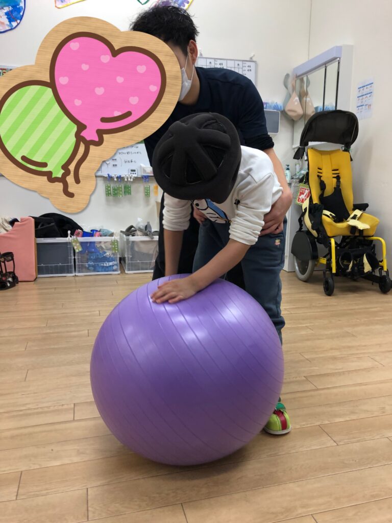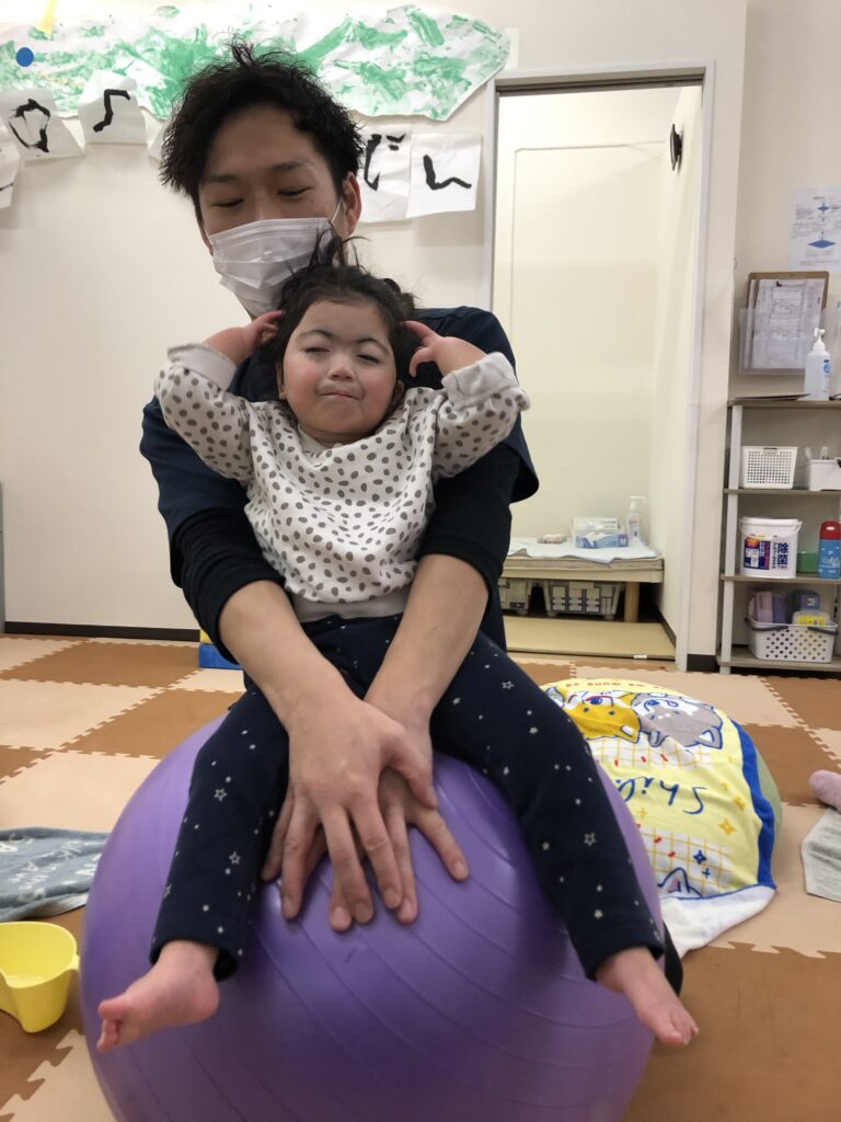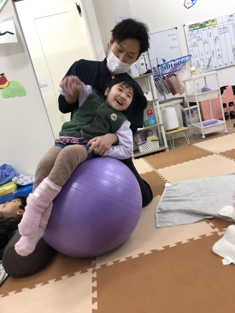 ラシクでは一人ひとりに合わせバランスボールに乗ることにより、表情はどうか声を出しているかなど子どもたちの一つ一つのサインを見逃さないように行っています![]()