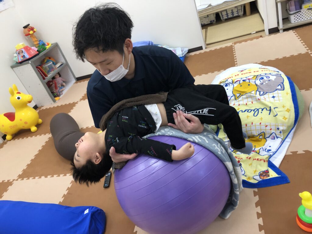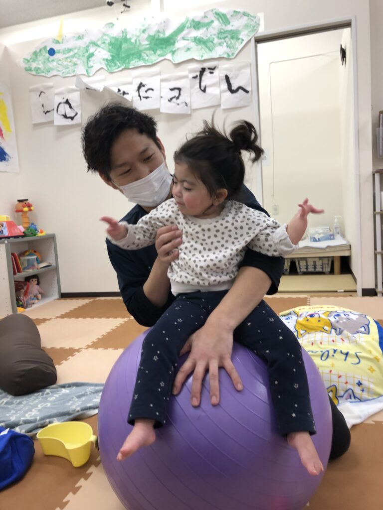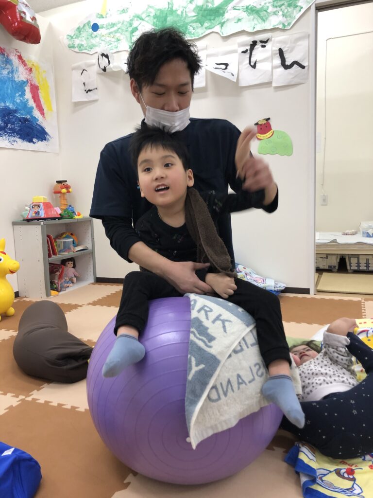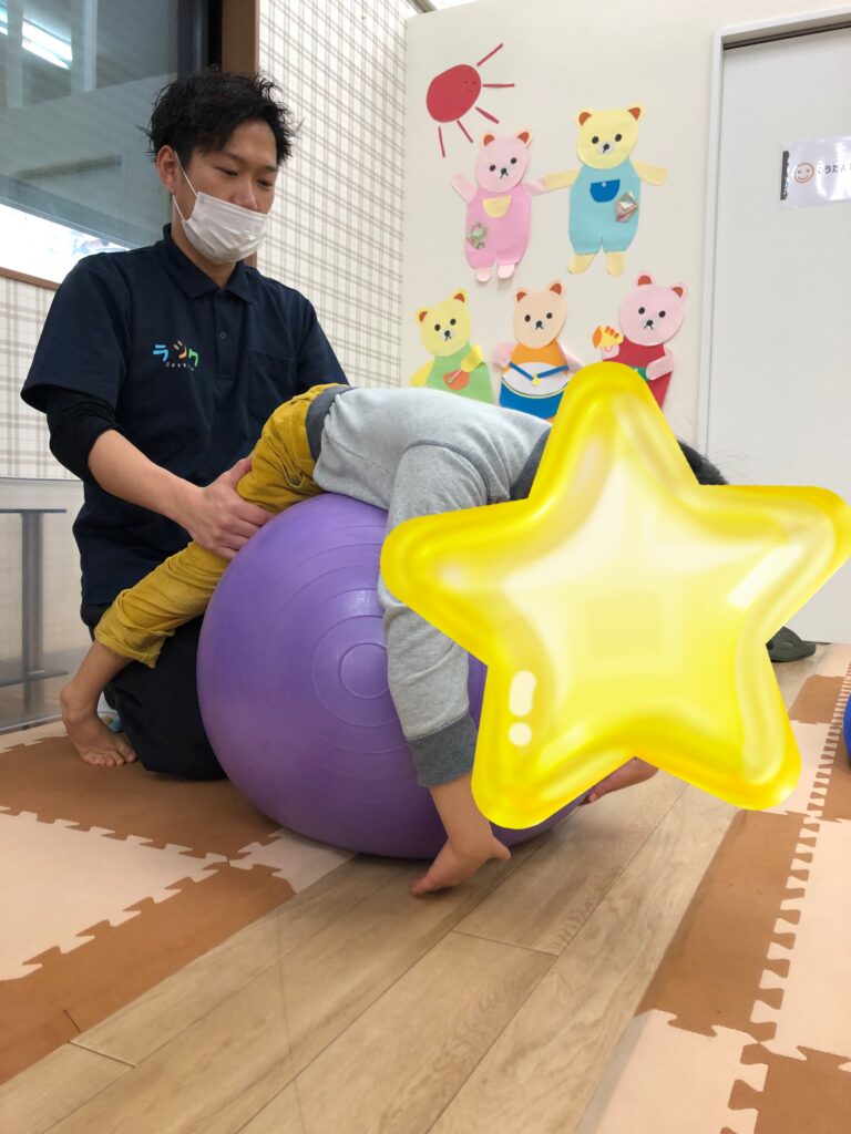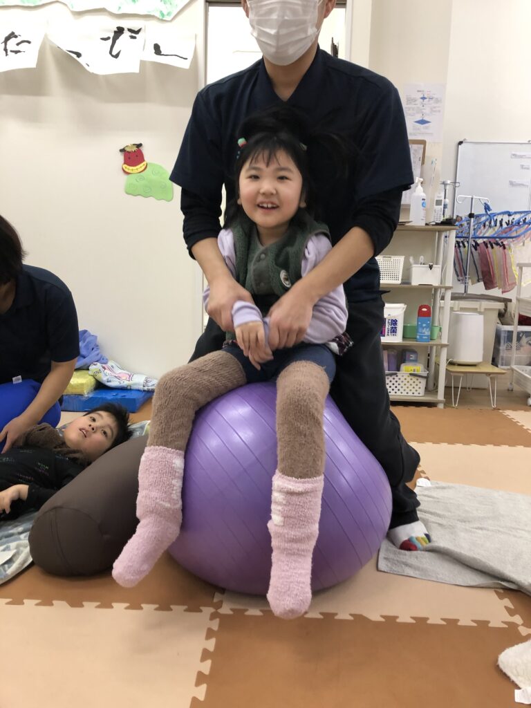 ラシクでは一人ひとりに合わせバランスボールに乗ることにより、表情はどうか声を出しているかなど子どもたちの一つ一つのサインを見逃さないように行っています![]()