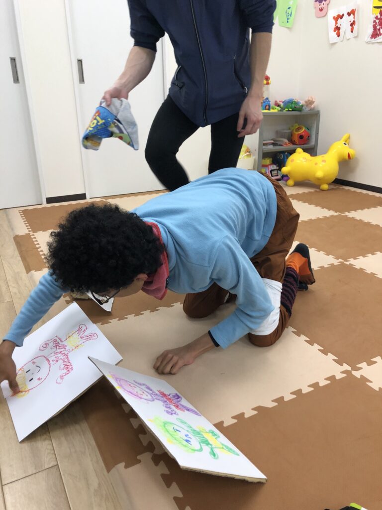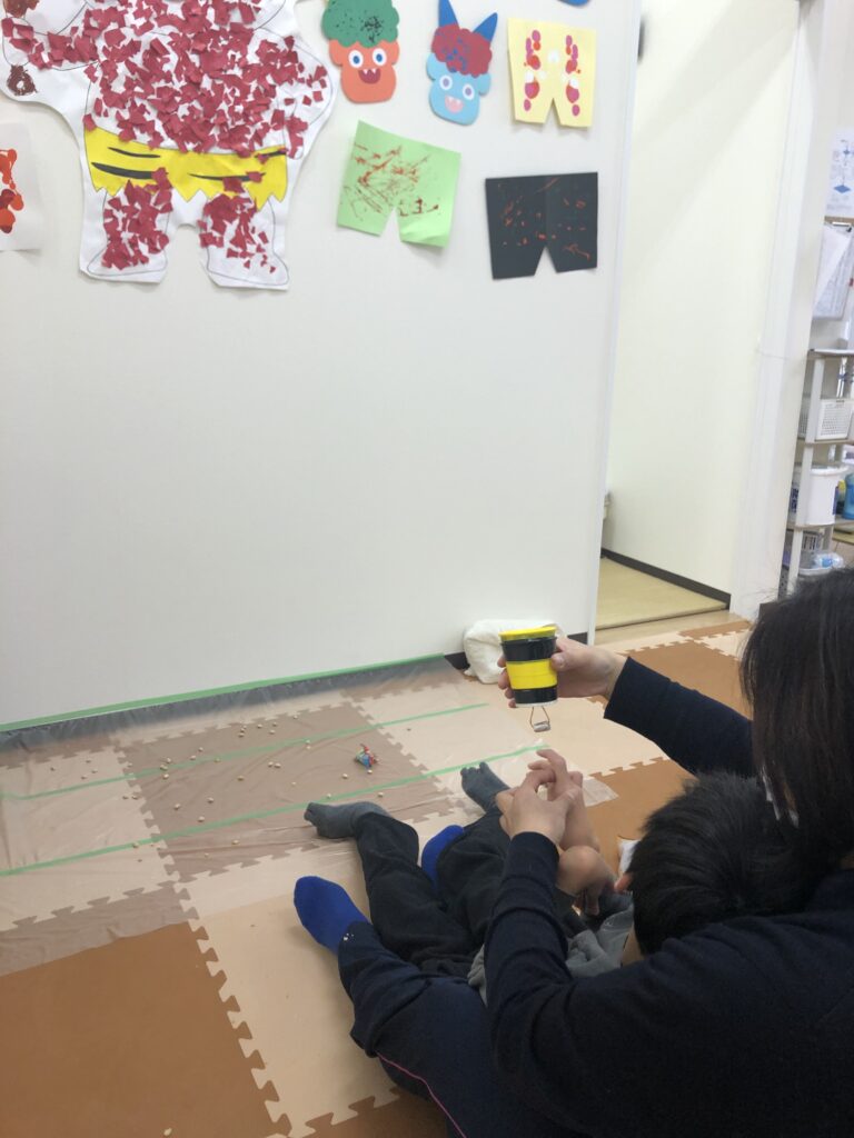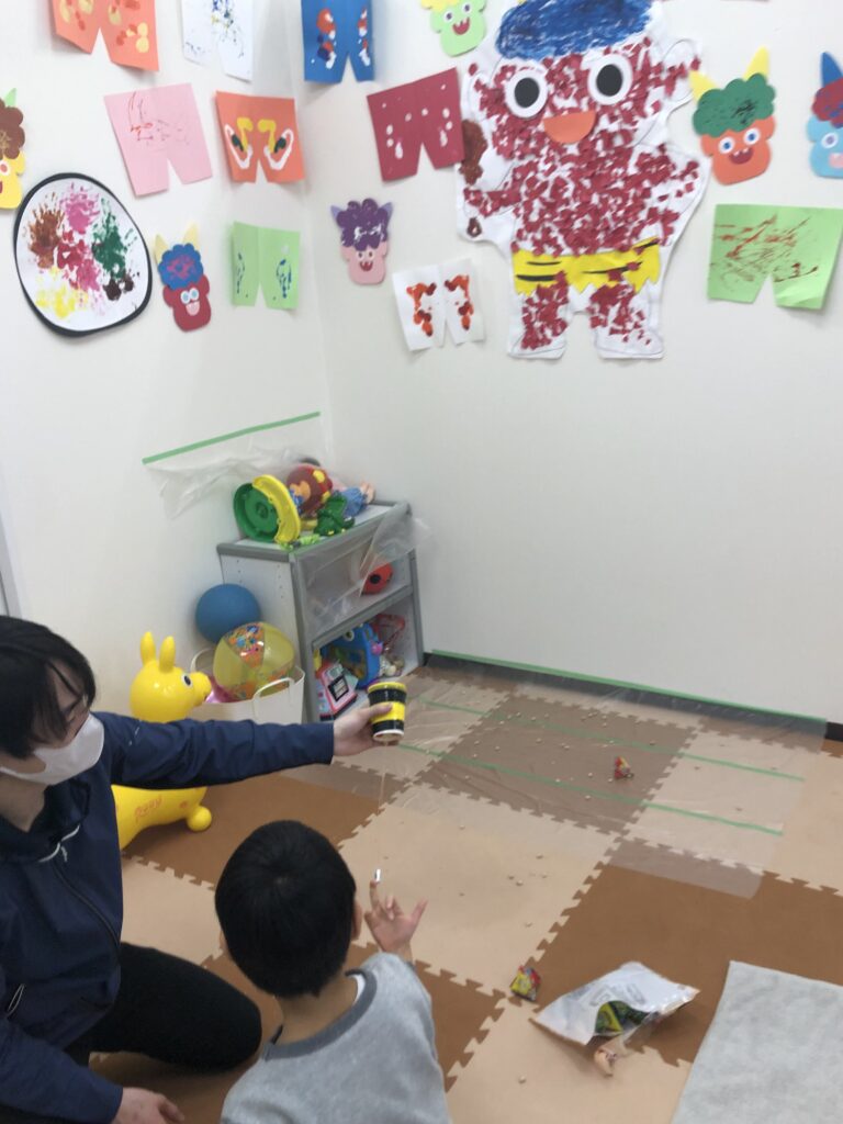 次週のブログで紹介しますが、壁面飾りの赤鬼に向かって豆を飛ばしました👹