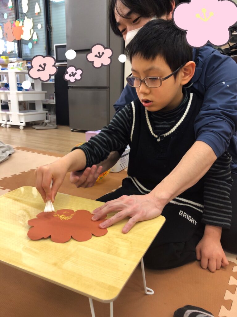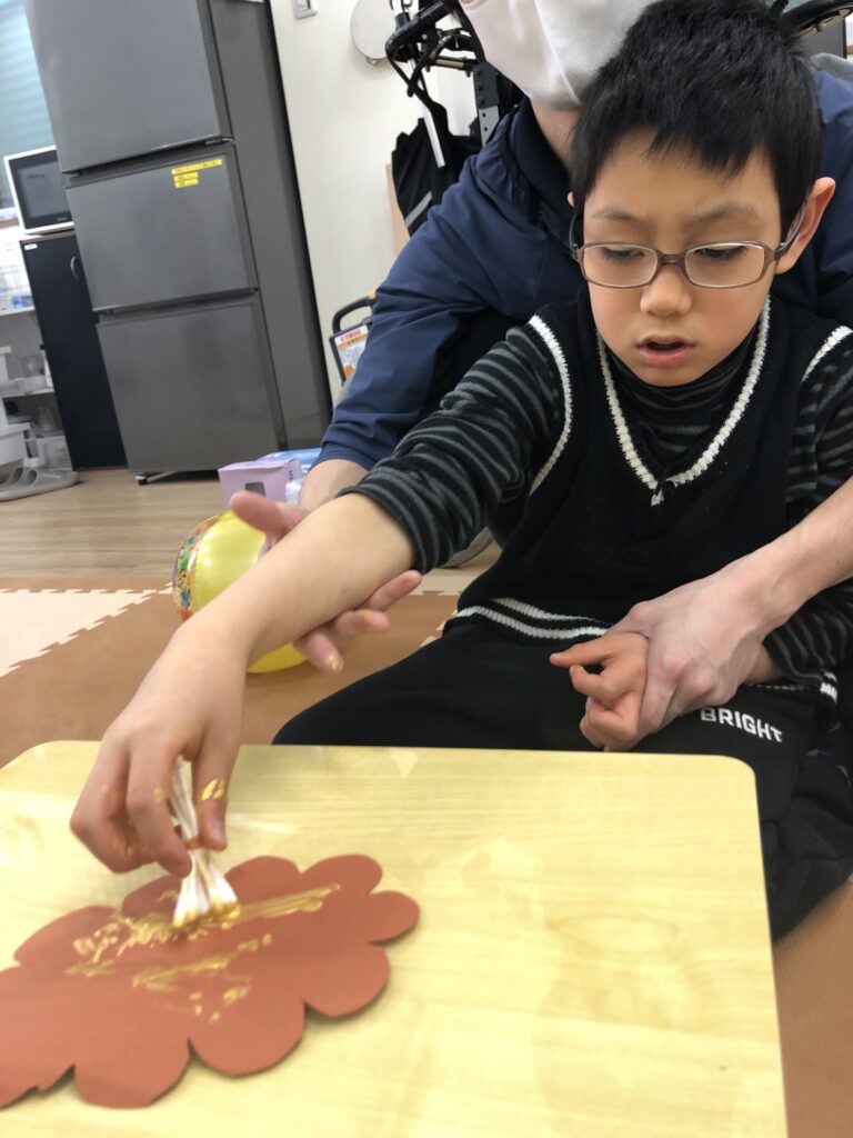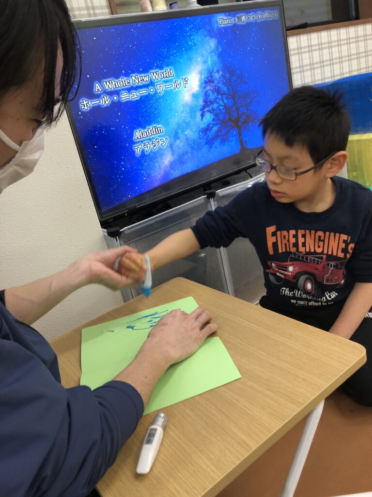 デカルコマニーという技法を使って、鬼のパンツに模様を付けていきました✨