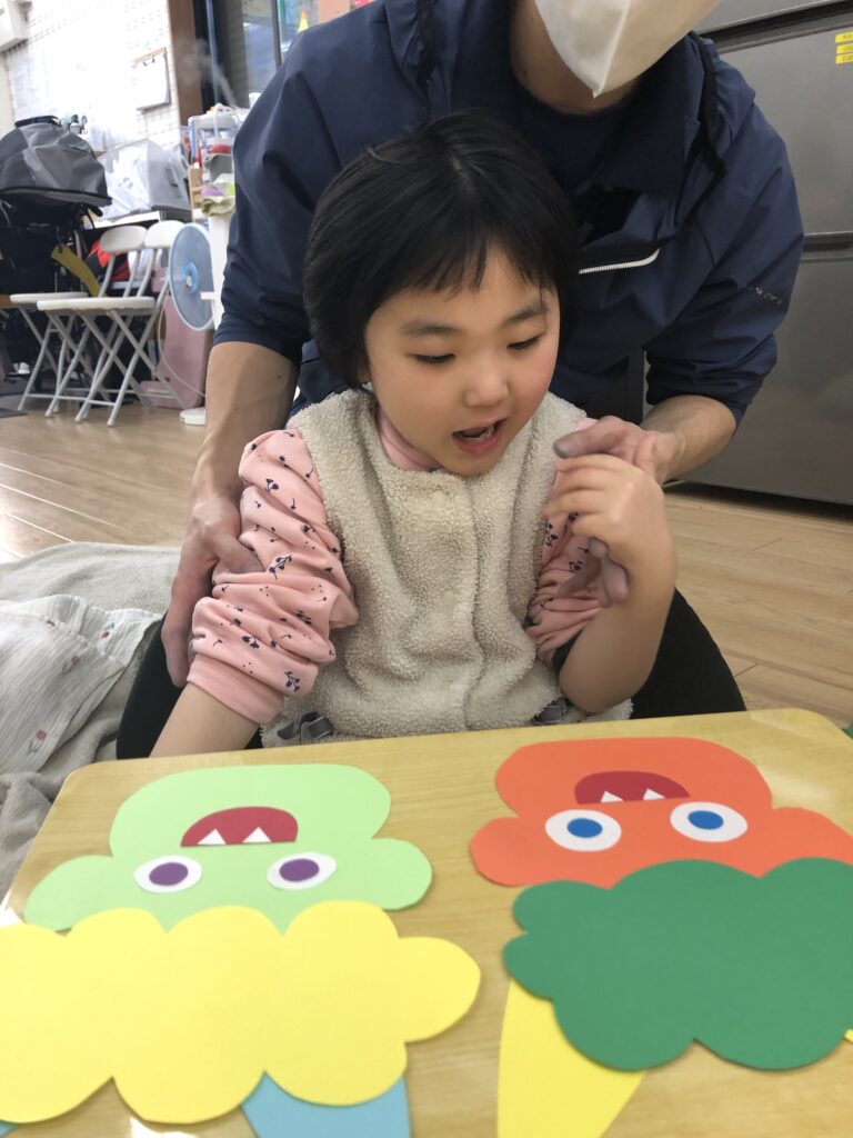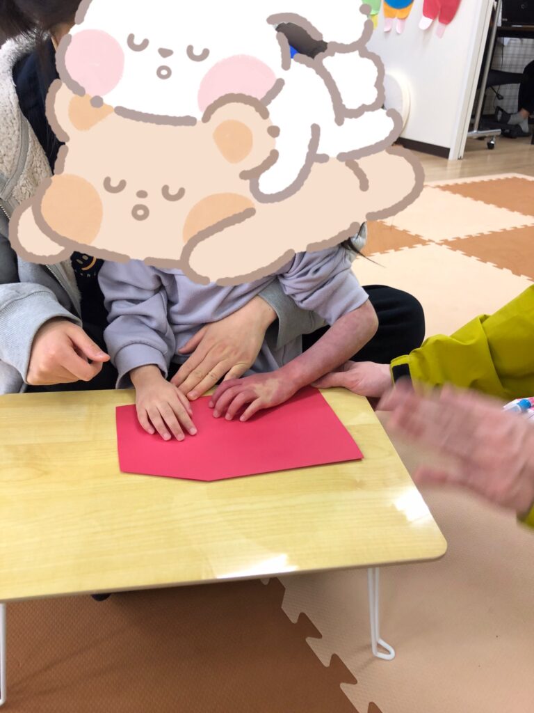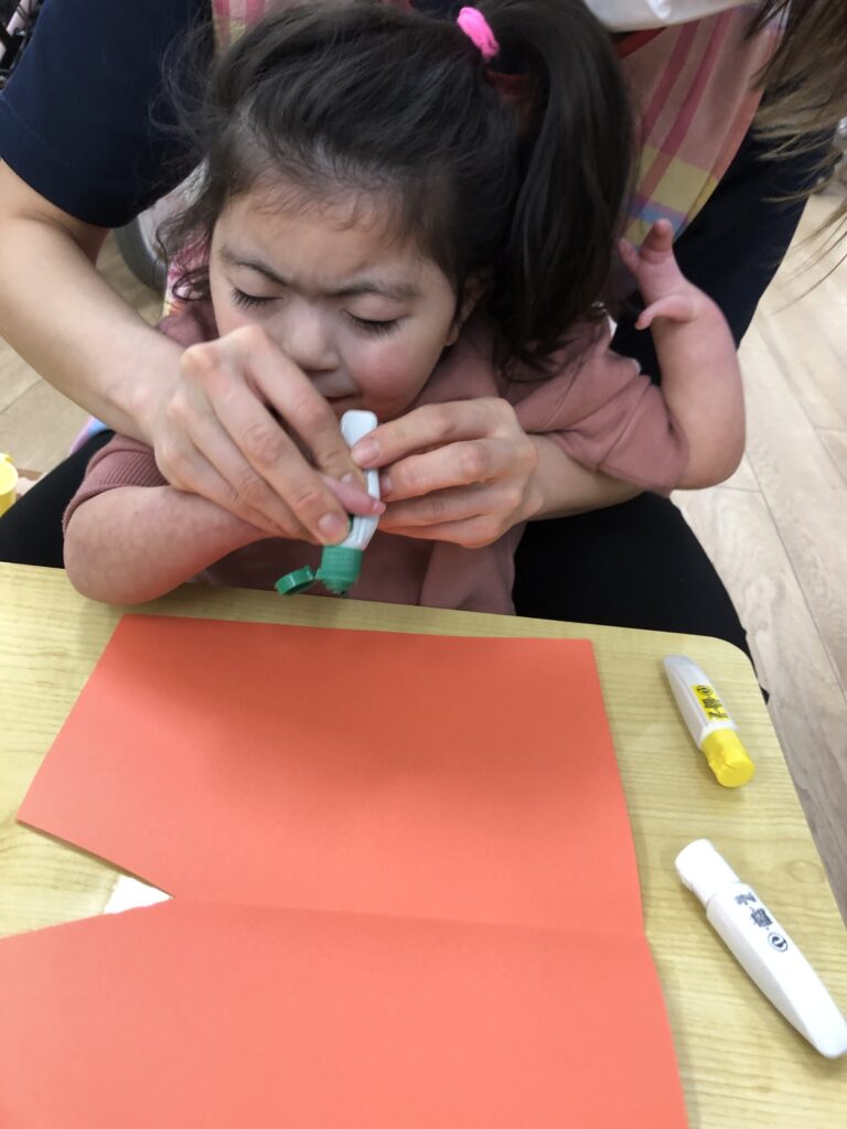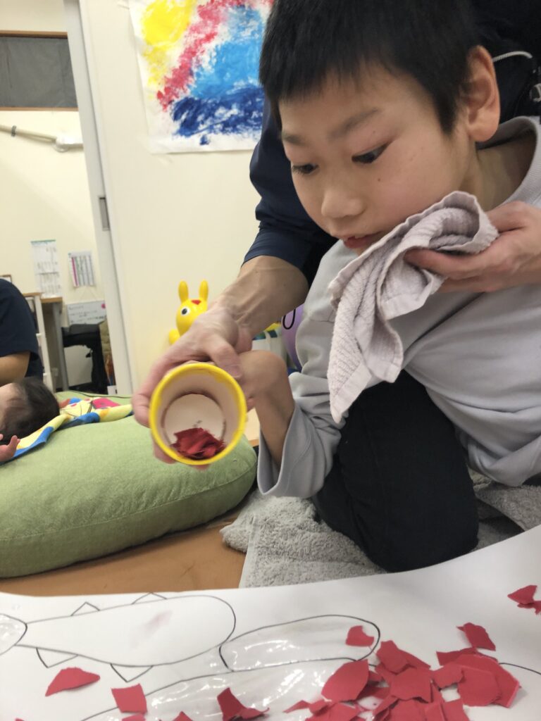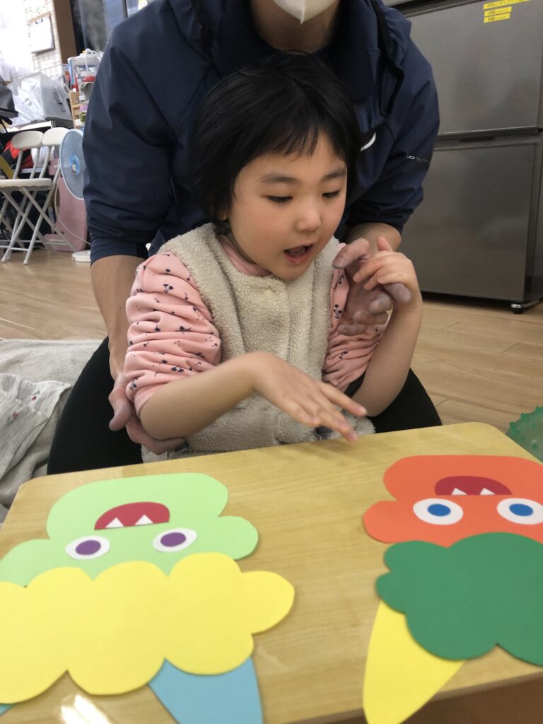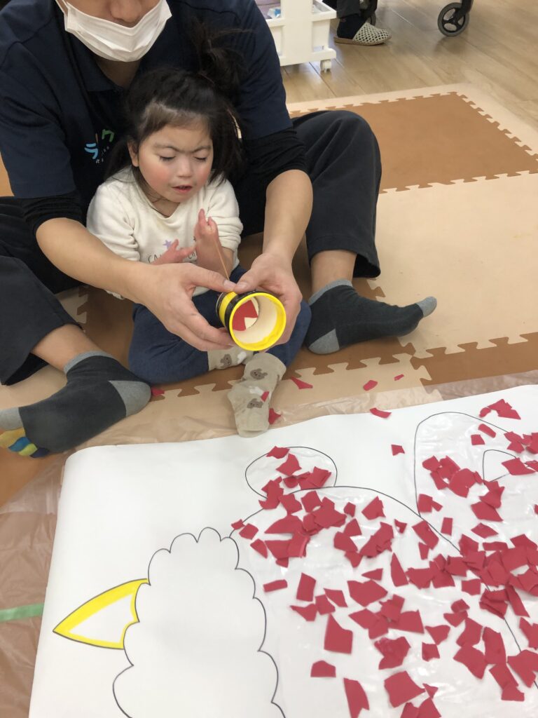 びよーん!と引っ張って、赤い画用紙を飛ばして赤鬼をつくっていきました(≧▽≦)