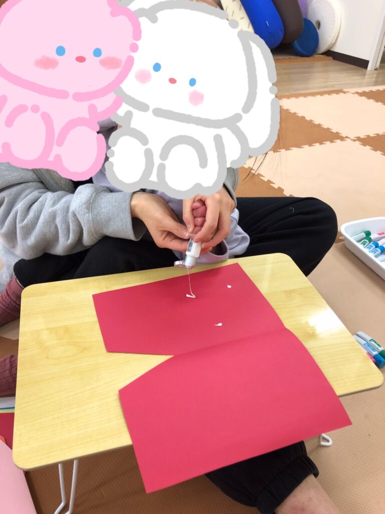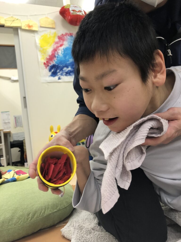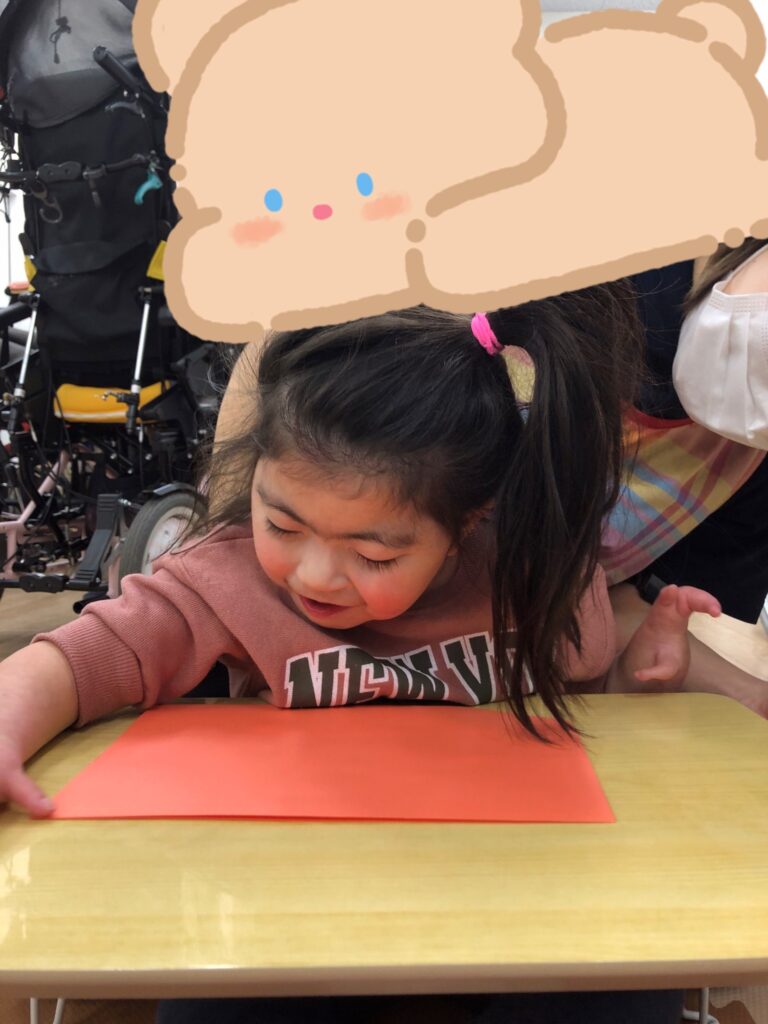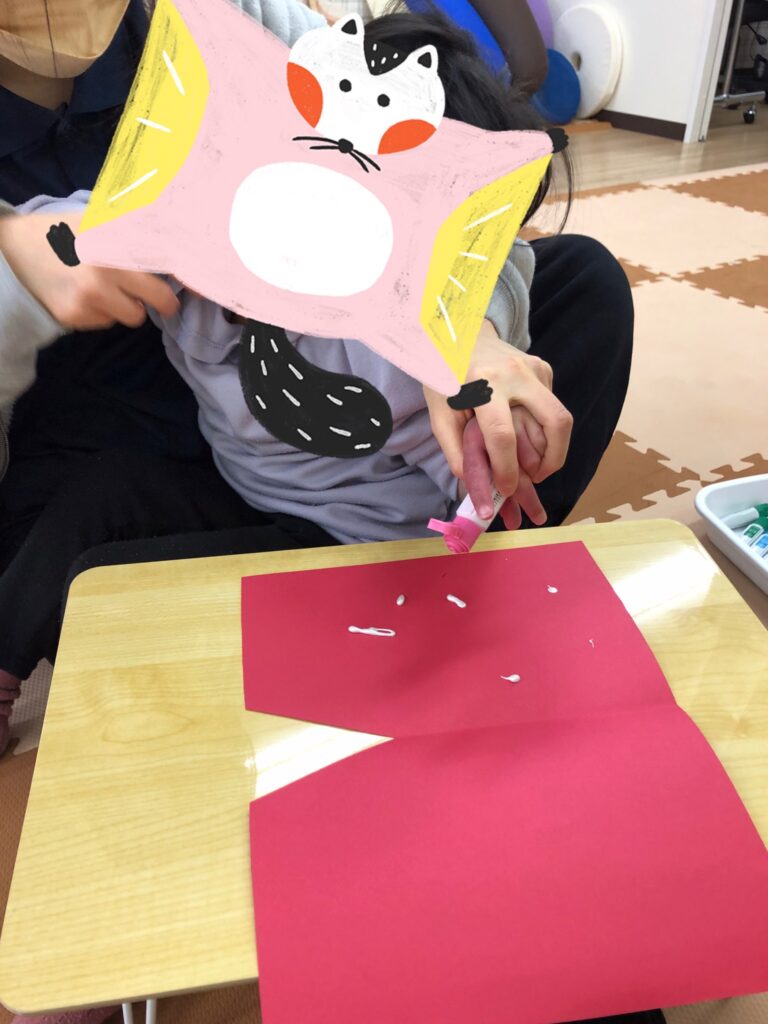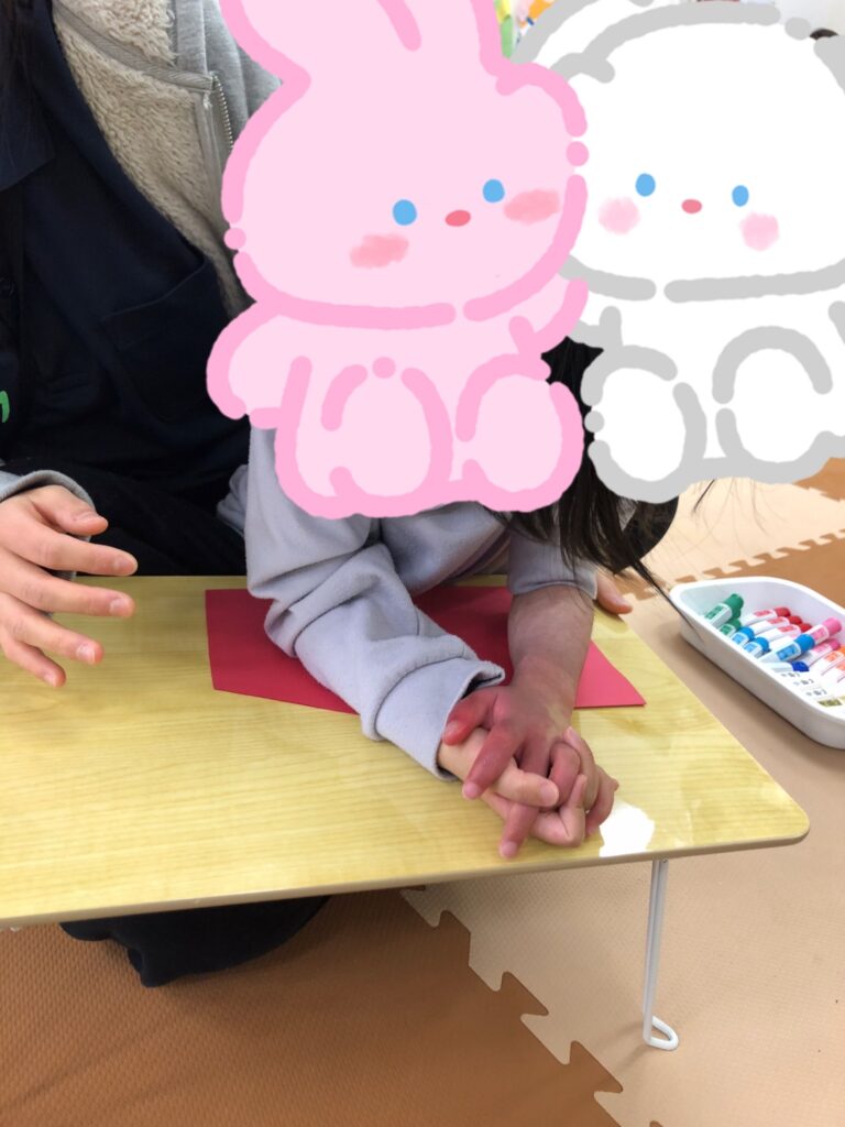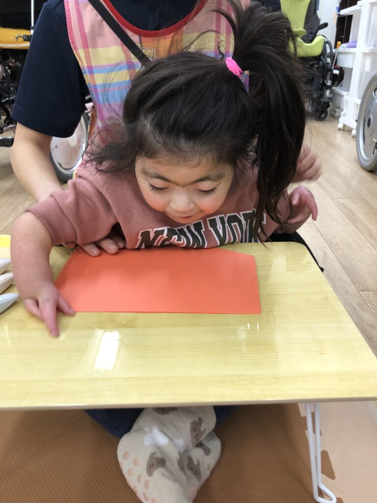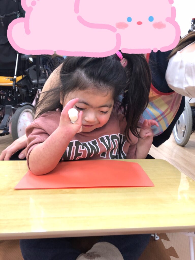 びよーん!と引っ張って、赤い画用紙を飛ばして赤鬼をつくっていきました(≧▽≦)
